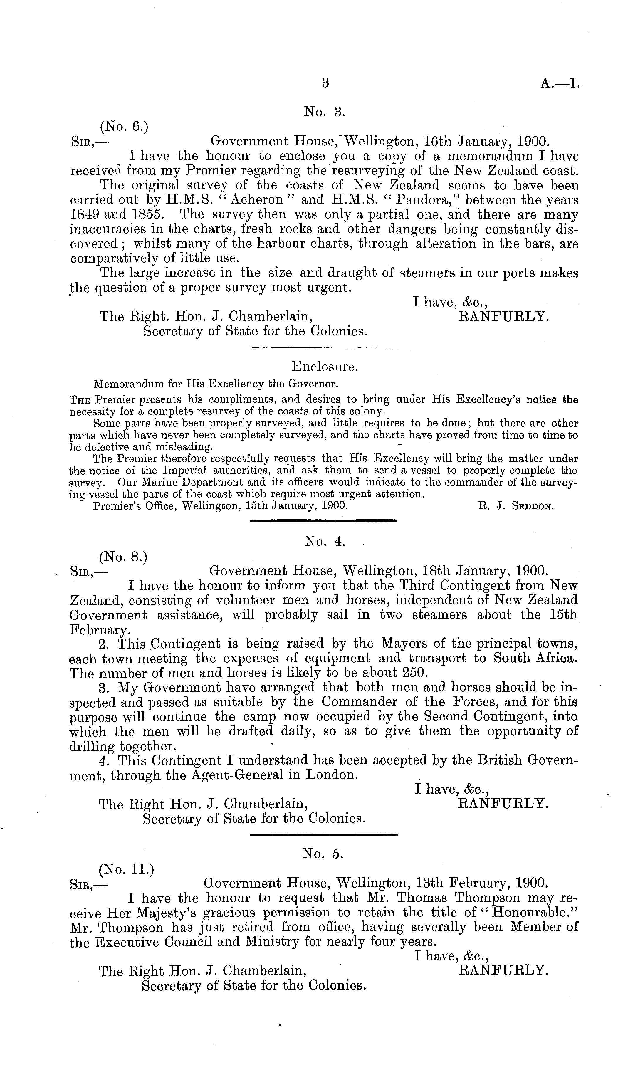 No. 5. (No. 11.) Sir, — Government House, Wellington, 13th February, 1900. I have the honour to request that Mr. Thomas Thompson may receive Her Majesty's gracious permission to retain the title of " Honourable." Mr. Thompson has just retired from office, having severally been Member of the Executive Council and Ministry for nearly four years. I have, &c, The Eight Hon. J. Chamberlain, EANFUELY. Secretary of State for the Colonies.
