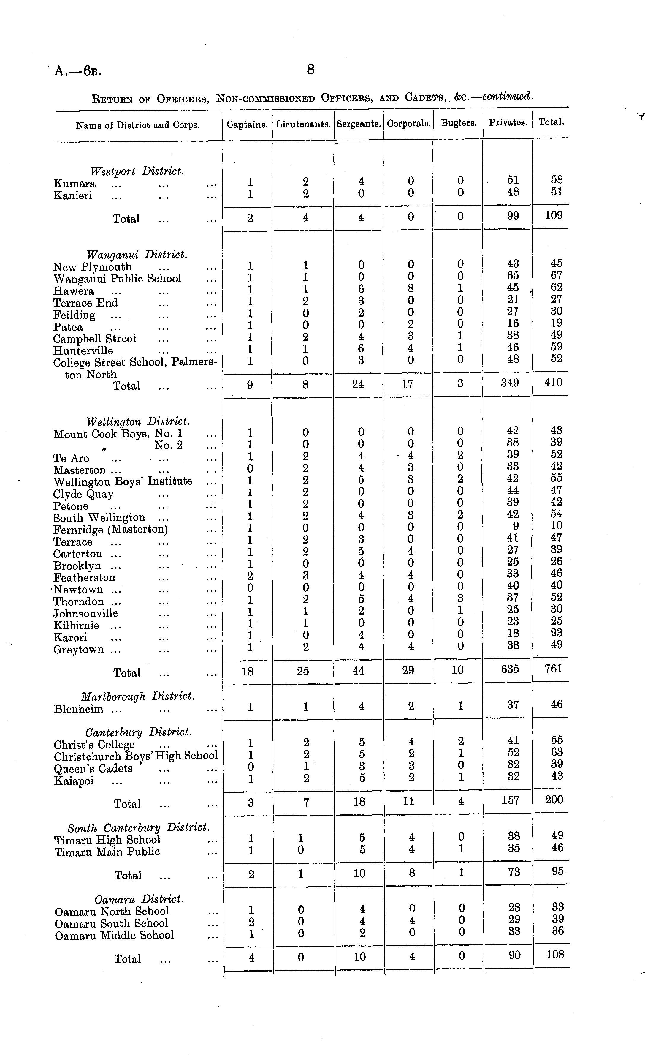 Name of District and Corps. Captains. Lieutenants. Sergeants. Corporals. Buglers. Privates. Total. Westport District. 1 1 Kumara Kanieri 2 2 4 0 0 0 0 0 51 48 58 51 Total 99 109 Wanganui District. New Plymouth Wanganui Public School Hawera Terrace End Feilding Patea Campbell Street Hunterville College Street School, Palmerston North Total ... 1 1 1 I 1 1 1 1 1 1 1 1 2 0 0 2 1 0 0 0 6 3 2 0 4 6 3 0 0 8 0 0 2 3 4 0 0 0 1 0 0 0 1 1 0 43 65 45 . 21 27 16 38 46 48 45 67 62 27 30 19 49 59 52 24 17 349 410 9 Wellington District. Mount Cook Boys, No. 1 No. 2 ... 1 1 1 1 1 1 1 1 1 2 0 1 1 1 1 1 0 0 4 4 5 0 0 i 0 3 5 0 4 0 5 2 0 4 4 0 0 4 3 3 0 0 3 0 0 4 0 4 0 4 0 0 0 4 0 0 2 0 2 0 0 2 0 0 0 0 0 0 3 1 0 0 0 42 38 39 33 42 44 39 42 9 41 27 25 33 40 37 25 23 18 38 48 89 52 42 55 47 42 54 10 47 39 26 46 40 52 30 25 23 49 Tβ Aro Masterton ... Wellington Boys' Institute Clyde Quay Petone South Wellington ... Fernridge (Masterton) Terrace Carterton ... Brooklyn ... Featherston Newtown ... Thorndon ... Johnsonville Kilbirnie ... Karori Greytown ... 0 0 2 2 2 2 2 2 0 2 2 0 a o 2 1 1 0 2 Total ... L8 25 44 29 10 635 761 Marlborongh District. Blenheim ... 37 46 Canterbury District. Christ's College Christchurch Boys'High School Queen's Cadets Kaiapoi 1 ] 0 1 2 2 1 2 5 5 3 5 4 2 3 2 2 1 0 1 41 52 32 32 55 63 39 43 Total 18 11 157 200 South Canterbury District. Timaru High School Timaru Main Public 1 1 1 0 5 5 4 4 0 1 38 35 49 46 Total ... 10 73 95 Oamaru District. Oamaru North School Oamaru South School Oamaru Middle School 1 2 1 0 0 0 4 4 2 0 4 0 0 0 0 28 29 33 33 89 3C Total 10 90 108