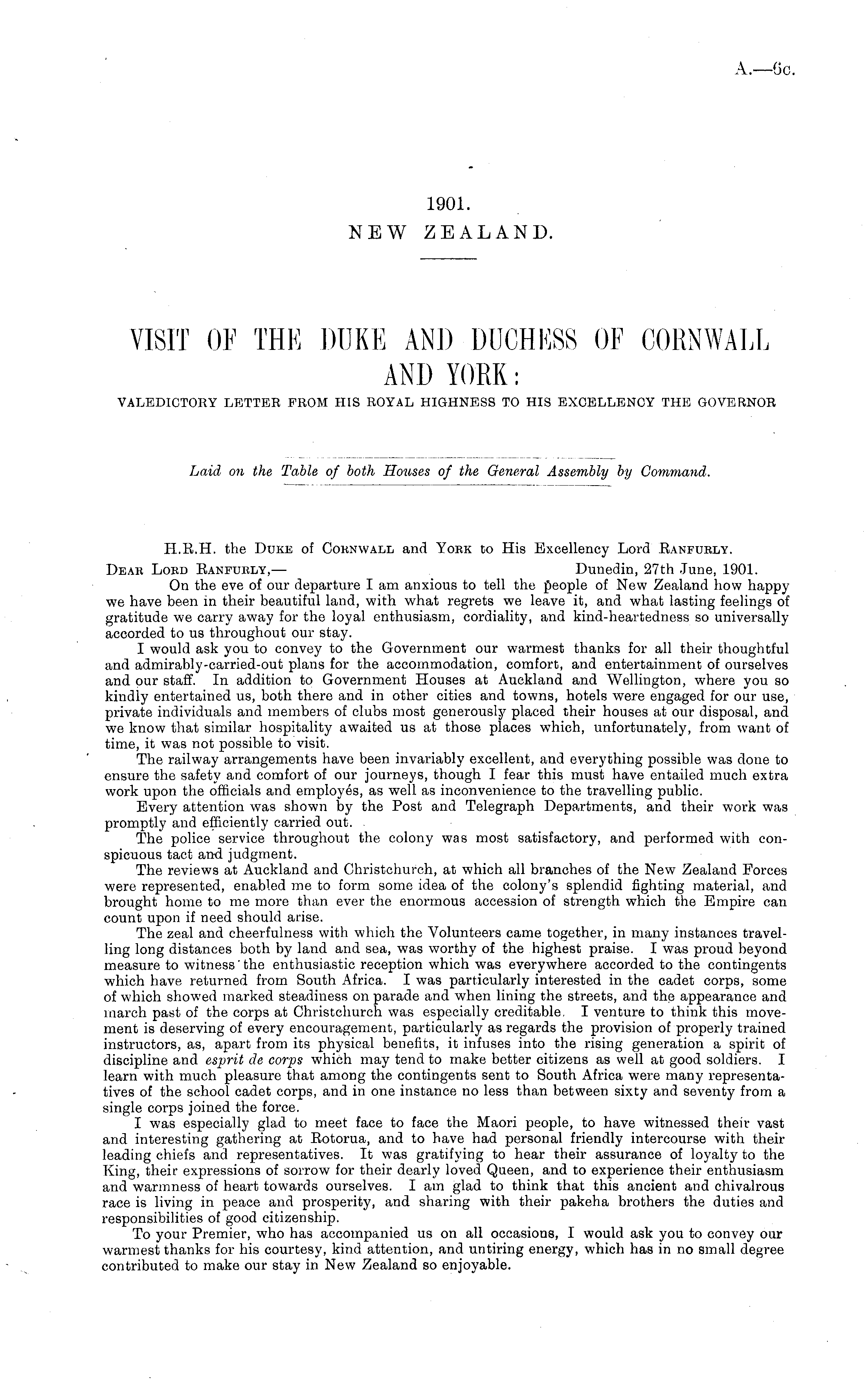 H.R.H. the Duke of Cornwall and York to His Excellency Lord Ranfurly. Dear Lord Ranfurly,— Dunedin, 27th June, 1901. On the eve of our departure I am anxious to tell the people of New Zealand how happy we have been in their beautiful land, with what regrets we leave it, and what lasting feelings of gratitude we carry away for the loyal enthusiasm, cordiality, and kind-heartedness so universally accorded to us throughout our stay. I would ask you to convey to the Government our warmest thanks for all their thoughtful and admirably-carried-out plans for the accommodation, comfort, and entertainment of ourselves and pur staff. In addition to Government Houses at Auckland and Wellington, where you so kindly entertained us, both there and in other cities and towns, hotels were engaged for our use, private individuals and members of clubs most generously placed their houses at our disposal, and we know that similar hospitality awaited us at those places which, unfortunately, from want of time, it was not possible to visit. The railway arrangements have been invariably excellent, and everything possible was done to ensure the safety and comfort of our journeys, though I fear this must have entailed much extra work upon the officials and employes, as well as inconvenience to the travelling public. Every attention was shown by the Post and Telegraph Departments, and their work was promptly and efficiently carried out. The police service throughout the colony was most satisfactory, and performed with conspicuous tact and judgment. The reviews at Auckland and Christchurch, at which all branches of the New Zealand Forces were represented, enabled me to form some idea of the colony's splendid fighting material, and brought home to me more than ever the enormous accession of strength which the Empire can count upon if need should arise. The zeal and cheerfulness with which the Volunteers came together, in many instances travelling long distances both by land and sea, was worthy of the highest praise. I was proud beyond measure to witness'the enthusiastic reception which was everywhere accorded to the contingents which have returned from South Africa. I was particularly interested in the cadet corps, some of which showed marked steadiness on parade and when lining the streets, and the appearance and inarch past of the corps at Christchurch was especially creditable. I venture to think this movement is deserving of every encouragement, particularly as regards the provision of properly trained instructors, as, apart from its physical benefits, it infuses into the rising generation a spirit of discipline and esprit de corps which may tend to make better citizens as well at good soldiers. I learn with much pleasure that among the contingents sent to South Africa were many representatives of the school cadet corps, and in one instance no less than between sixty and seventy from a single corps joined the force. I was especially glad to meet face to face the Maori people, to have witnessed their vast and interesting gathering at Rotorua, and to have had personal friendly intercourse with their leading chiefs and representatives. It was gratifying to hear their assurance of loyalty to the King, their expressions of sorrow for their dearly loved Queen, and to experience their enthusiasm and warmness of heart towards ourselves. I am glad to think that this ancient and chivalrous race is living in peace and prosperity, and sharing with their pakeha brothers the duties and responsibilities of good citizenship. To your Premier, who has accompanied us on all occasions, I would ask you to convey our warmest thanks for his courtesy, kind attention, and untiring energy, which has in no small degree contributed to make our stay in New Zealand so enjoyable.