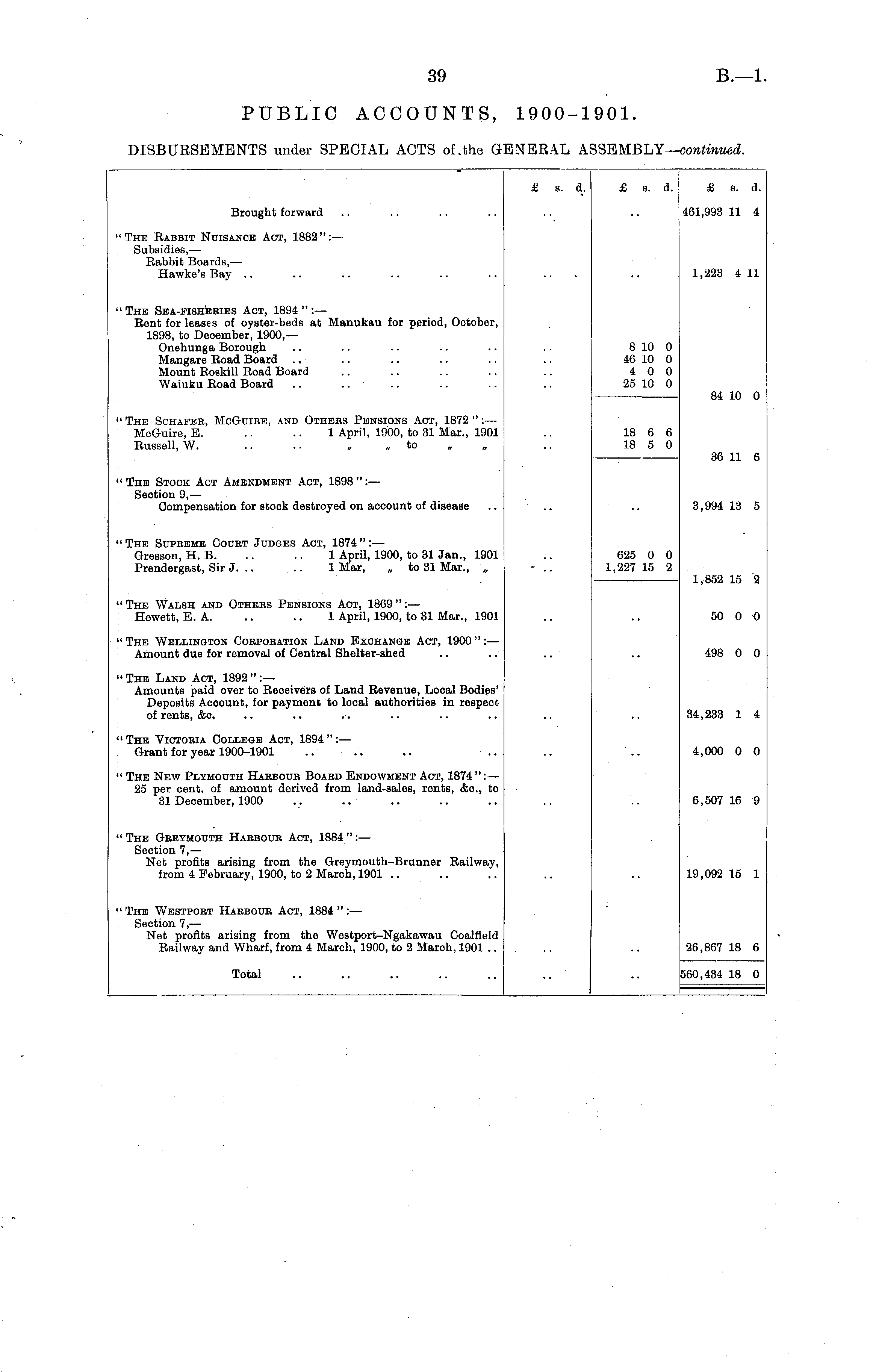 £ i s. d. £ s. d. £ s. d. Brought forward 461,993 11 4 "The Rabbit Nuisance Act, 1882": — Subsidies, — Rabbit Boards, — Hawke's Bay 1,223 4 11 " The Sea-fisheries Act, 1894 " :— Rent for leases of oyster-beds at Manukau for period, October, 1898, to December, 1900,— Onehunga Borough Mangare Road Board Mount Roskill Road Board Waiuku Road Board .. .. .. 8 10 0 46 10 0 4 0 0 25 10 0 " The Schafer, McGuire, and Others Pensions Act, 1872 ": — McGuire, E. .. .. 1 April, 1900, to 31 Mar., 1901 Russell, W. .. .. „ „ to 84 10 0 18 6 6 18 5 0 36 11 6 " The Stock Act Amendment Act, 1898 " :— Section 9, — Compensation for stook destroyed on account of disease 3,994 13 5 "The Supreme Court Judges Act, 1874":— Gresson, H. B. .. .. 1 April, 1900, to 31 Jan., 1901 Prendergast, Sir J. .. .. 1 Mar, „ to 31 Mar., „ 625 0 0 1,227 15 2 1,852 15 2 "The Walsh and Others Pensions Act, 1869": — Hewett, E. A. .. .. 1 April, 1900, to 31 Mar., 1901 50 0 0 " The Wellington Corporation Land Exchange Act, 1900 ": — Amount due for removal of Central Shelter-shed 498 0 0 "The Land Act, 1892":— Amounts paid over to Receivers of Land Revenue, Local Bodies' Deposits Acoount, for payment to local authorities in respect of rents, &o. 34,233 1 4 " The Victoria College Act, 1894 " :— Grant for year 1900-1901 4,000 0 0 " The New Plymouth Harbour Board Endowment Act, 1874":— 25 per cent, of amount derived from land-sales, rents, &c, to 31 December, 1900 6,507 16 9 " The Greymouth Harbour Act, 1884 ":— Section 7, — Net profits arising from the Greymouth-Brunner Railway, from 4 February, 1900, to 2 March, 1901 19,092 15 1 " The Westport Harbour Act, 1884 " :— Section 7, — Net profits arising from the Westport-Ngakawau Coalfield Railway and Wharf, from 4 March, 1900, to 2 March, 1901 .. 26,867 18 6 Total 560,434 18 0