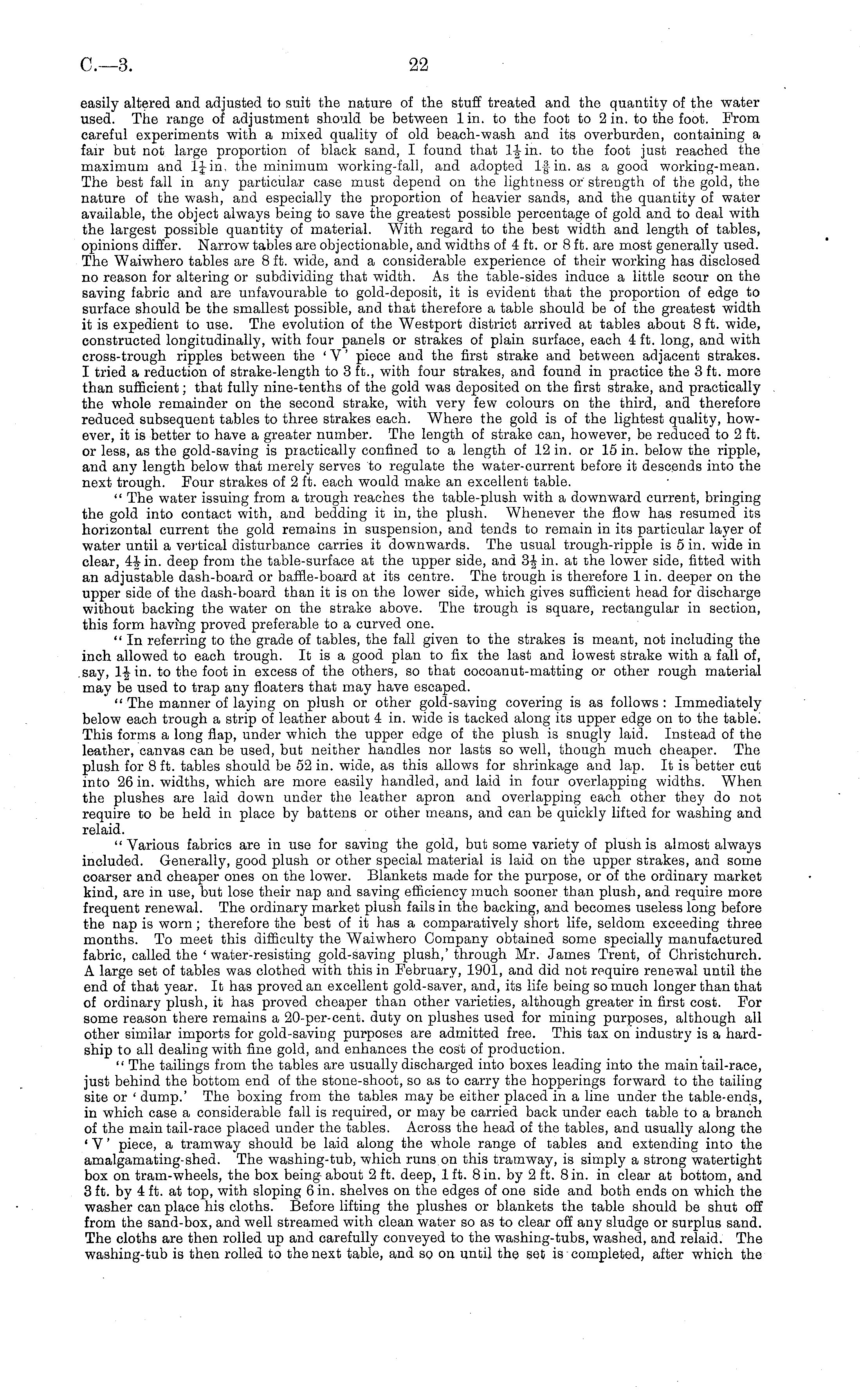 easily altered and adjusted to suit the nature of the stuff treated and the quantity of the water used. The range of adjustment should be between lin. to the foot to 2 in. to the foot. From careful experiments with a mixed quality of old beach-wash and its overburden, containing a fair but not large proportion of black sand, I found that in. to the foot just reached the maximum and ljin, the minimum working-fall, and adopted If-in. as a good working-mean. The best fall in any particular case must depend on the lightness or strength of the gold, the nature of the wash, and especially the proportion of heavier sands, and the quantity of water available, the object always being to save the greatest possible percentage of gold and to deal with the largest possible quantity of material. With regard to the best width and length of tables, opinions differ. Narrow tables are objectionable, and widths of 4 ft. or 8 ft. are most generally used. The Waiwhero tables are 8 ft. wide, and a considerable experience of their working has disclosed no reason for altering or subdividing that width. As the table-sides induce a little scour on the saving fabric and are unfavourable to gold-deposit, it is evident that the proportion of edge to surface should be the smallest possible, and that therefore a table should be of the greatest width it is expedient to use. The evolution of the Westport district arrived at tables about 8 ft. wide, constructed longitudinally, with four panels or strakes of plain surface, each 4 ft. long, and with cross-trough ripples between the 'V' piece and the first strake and between adjacent strakes. I tried a reduction of strake-length to 3 ft., with four strakes, and found in practice the 3 ft. more than sufficient; that fully nine-tenths of the gold was deposited on the first strake, and practically the whole remainder on the second strake, with very few colours on the third, and therefore reduced subsequent tables to three strakes each. Where the gold is of the lightest quality, however, it is better to have a greater number. The length of strake can, however, be reduced to 2 ft. or less, as the gold-saving is practically confined to a length of 12 in. or 15 in. below the ripple, and any length below that merely serves to regulate the water-current before it descends into the next trough. Four strakes of 2 ft. each would make an excellent table. " The water issuing from a trough reaches the table-plush with a downward current, bringing the gold into contact with, and bedding it in, the plush. Whenever the flow has resumed its horizontal current the gold remains in suspension, and tends to remain in its particular layer of water until a vertical disturbance carries it downwards. The usual trough-ripple is 5 in. wide in clear, 4iin. deep from the table-surface at the upper side, and 3Jin. at the lower side, fitted with an adjustable dash-board or baffle-board at its centre. The trough is therefore 1 in. deeper on the upper side of the dash-board than it is on the lower side, which gives sufficient head for discharge without backing the water on the strake above. The trough is square, rectangular in section, this form having proved preferable to a curved one. " In referring to the grade of tables, the fall given to the strakes is meant, not including the inch allowed to each trough. It is a good plan to fix the last and lowest strake with a fall of, say, in. to the foot in excess of the others, so that cocoanut-matting or other rough material may be used to trap any floaters that may have escaped. " The manner of laying on plush or other gold-saving covering is as follows : Immediately below each trough a strip of leather about 4 in. wide is tacked along its upper edge on to the table. This forms a long flap, under which the upper edge of the plush is snugly laid. Instead of the leather, canvas can be used, but neither handles nor lasts so well, though much cheaper. The plush for 8 ft. tables should be 52 in. wide, as this allows for shrinkage and lap. It is better cut into 26 in. widths, which are more easily handled, and laid in four overlapping widths. When the plushes are laid down under the leather apron and overlapping each other they do not require to be held in place by battens or other means, and can be quickly lifted for washing and relaid. "Various fabrics are in use for saving the gold, but some variety of plush is almost always included. Generally, good plush or other special material is laid on the upper strakes, and some coarser and cheaper ones on the lower. Blankets made for the purpose, or of the ordinary market kind, are in use, but lose their nap and saving efficiency much sooner than plush, and require more frequent renewal. The ordinary market plush fails in the backing, and becomes useless long before the nap is worn ; therefore the best of it has a comparatively short life, seldom exceeding three months. To meet this difficulty the Waiwhero Company obtained some specially manufactured fabric, called the ' water-resisting gold-saving plush,'through Mr. James Trent, of Christchurch. A large set of tables was clothed with this in February, 1901, and did not require renewal until the end of that year. It has proved an excellent gold-saver, and, its life being so much longer than that of ordinary plush, it has proved cheaper than other varieties, although greater in first cost. For some reason there remains a 20-per-cent. duty on plushes used for mining purposes, although all other similar imports for gold-saving purposes are admitted free. This tax on industry is a hardship to all dealing with fine gold, and enhances the cost of production. '' The tailings from the tables are usually discharged into boxes leading into the main tail-race, just behind the bottom end of the stone-shoot, so as to carry the hopperings forward to the tailing site or ' dump.' The boxing from the tables may be either placed in a line under the table-ends, in which case a considerable f