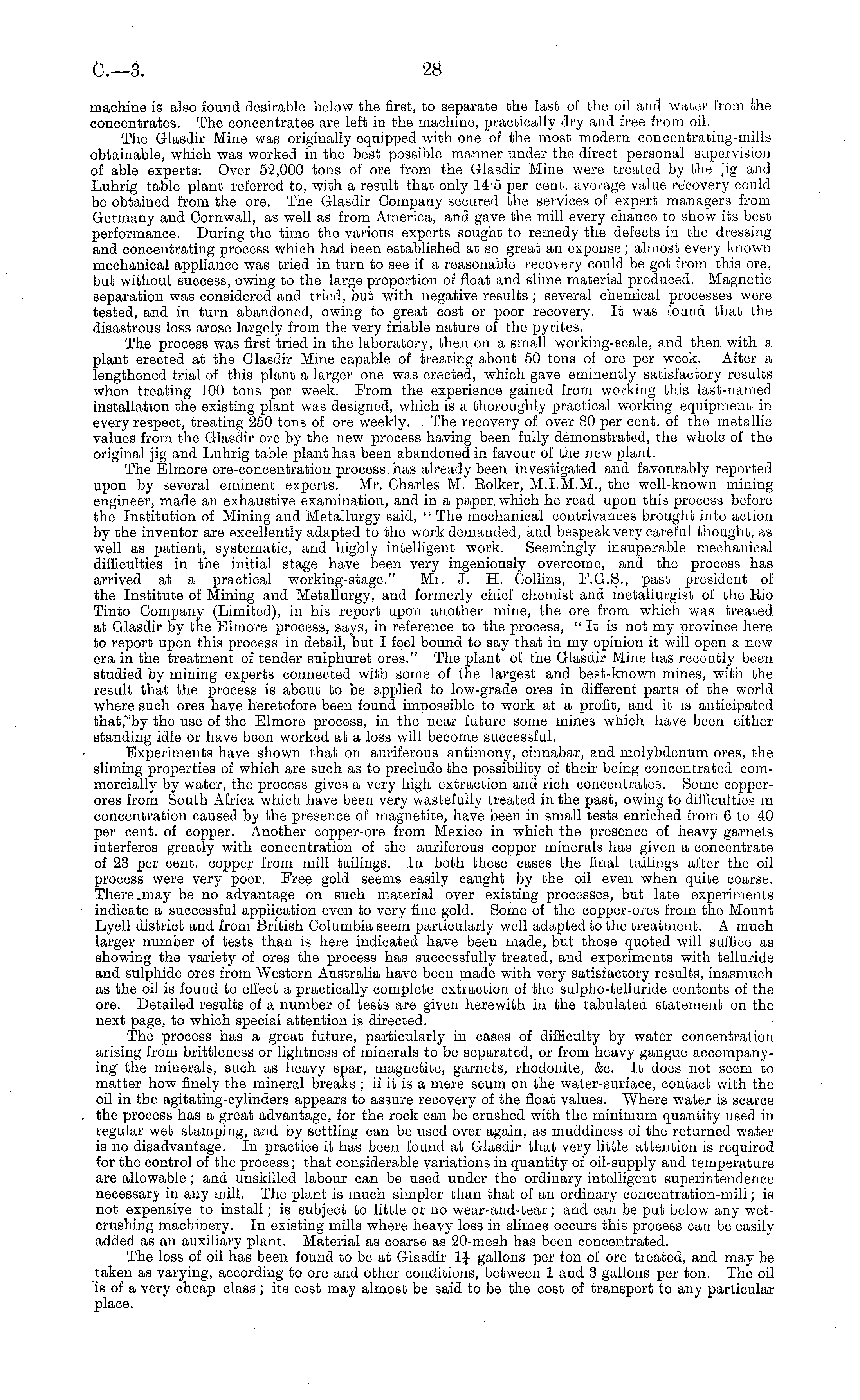 machine is also found desirable below the first, to separate the last of the oil and water from the concentrates. The concentrates are left in the machine, practically dry and free from oil. The Glasdir Mine was originally equipped with one of the most modern concentrating-mills obtainable, which was worked in the best possible manner under the direct personal supervision of able experts-. Over 52,000 tons of ore from the Glasdir Mine were treated by the jig and Luhrig table plant referred to, with a result that only 14-5 per cent, average value recovery could be obtained from the ore. The Glasdir Company secured the services of expert managers from Germany and Cornwall, as well as from America, and gave the mill every chance to show its best performance. During the time the various experts sought to remedy the defects in the dressing and concentrating process which had been established at so great an expense; almost every known mechanical appliance was tried in turn to see if a reasonable recovery could be got from this ore, but without success, owing to the large proportion of float and slime material produced. Magnetic separation was considered and tried, but with negative results ; several chemical processes were tested, and in turn abandoned, owing to great cost or poor recovery. It was found that the disastrous loss arose largely from the very friable nature of the pyrites. The process was first tried in the laboratory, then on a small working-scale, and then with a plant erected at the Glasdir Mine capable of treating about 50 tons of ore per week. After a lengthened trial of this plant a larger one was erected, which gave eminently satisfactory results when treating 100 tons per week. From the experience gained from working this last-named installation the existing plant was designed, which is a thoroughly practical working equipment in every respect, treating 250 tons of ore weekly. The recovery of over 80 per cent, of the metallic values from the Glasdir ore by the new process having been fully demonstrated, the whole of the original jig and Luhrig table plant has been abandoned in favour of the new plant. The Elmore ore-concentration process has already been investigated and favourably reported upon by several eminent experts. Mr. Charles M. Bolker, M.1.M.M., the well-known mining engineer, made an exhaustive examination, and in a paper, which he read upon this process before the Institution of Mining and Metallurgy said, " The mechanical contrivances brought into action by the inventor are excellently adapted to the work demanded, and bespeak very careful thought, as well as patient, systematic, and highly intelligent work. Seemingly insuperable mechanical difficulties in the initial stage have been very ingeniously overcome, and the process has arrived at a practical working-stage." Mi. J. H. Collins, F.G.S., past president of the Institute of Mining and Metallurgy, and formerly chief chemist and metallurgist of the Bio Tinto Company (Limited), in his report upon another mine, the ore from which was treated at Glasdir by the Elmore process, says, in reference to the process, "It is not my province here to report upon this process in detail, but I feel bound to say that in my opinion it will open a new era in the treatment of tender sulphuret ores." The plant of the Glasdir Mine has recently been studied by mining experts connected with some of the largest and best-known mines, with the result that the process is about to be applied to low-grade ores in different parts of the world where such ores have heretofore been found impossible to work at a profit, and it is anticipated that, by the use of the Elmore process, in the near future some mines which have been either standing idle or have been worked at a loss will become successful. Experiments have shown that on auriferous antimony, cinnabar, and molybdenum ores, the sliming properties of which are such as to preclude the possibility of their being concentrated commercially by water, the process gives a very high extraction and rich concentrates. Some copperores from South Africa which have been very wastefully treated in the past, owing to difficulties in concentration caused by the presence of magnetite, have been in small tests enriched from 6 to 40 per cent, of copper. Another copper-ore from Mexico in which the presence of heavy garnets interferes greatly with concentration of the auriferous copper minerals has given a concentrate of 23 per cent, copper from mill tailings. In both these cases the final tailings after the oil process were very poor. Free gold seems easily caught by the oil even when quite coarse. There .may be no advantage on such material over existing processes, but late experiments indicate a successful application even to very fine gold. Some of the copper-ores from the Mount Lyell district and from British Columbia seem particularly well adapted to the treatment. A much larger number of tests than is here indicated have been made, but those quoted will suffice as showing the variety of ores the process has successfully treated., and experiments with telluride and sulphide ores from Western Australia have been made with very satisfactory results, inasmuch as the oil is found to effect a practically complete extraction of the sulpho-telluride contents of the ore. Detailed results of a number of tests are given herewith in the tabulated statement on the next page, to which special attention is directed. The process has a great future, particularly in cases of difficulty by water concentration arising from brittleness or lightness of minerals to be separated, or from heavy gangue accompanying the minerals, such as heavy spar, magnetite, garnets, rhodonite, &c. It does not seem to matter how finely the mineral breaks ; if it is a mere scum on the water-surface, contact with the oil in the agitating-cylinders appears to assure recovery of the float values. Where water is scarce the process has a great a