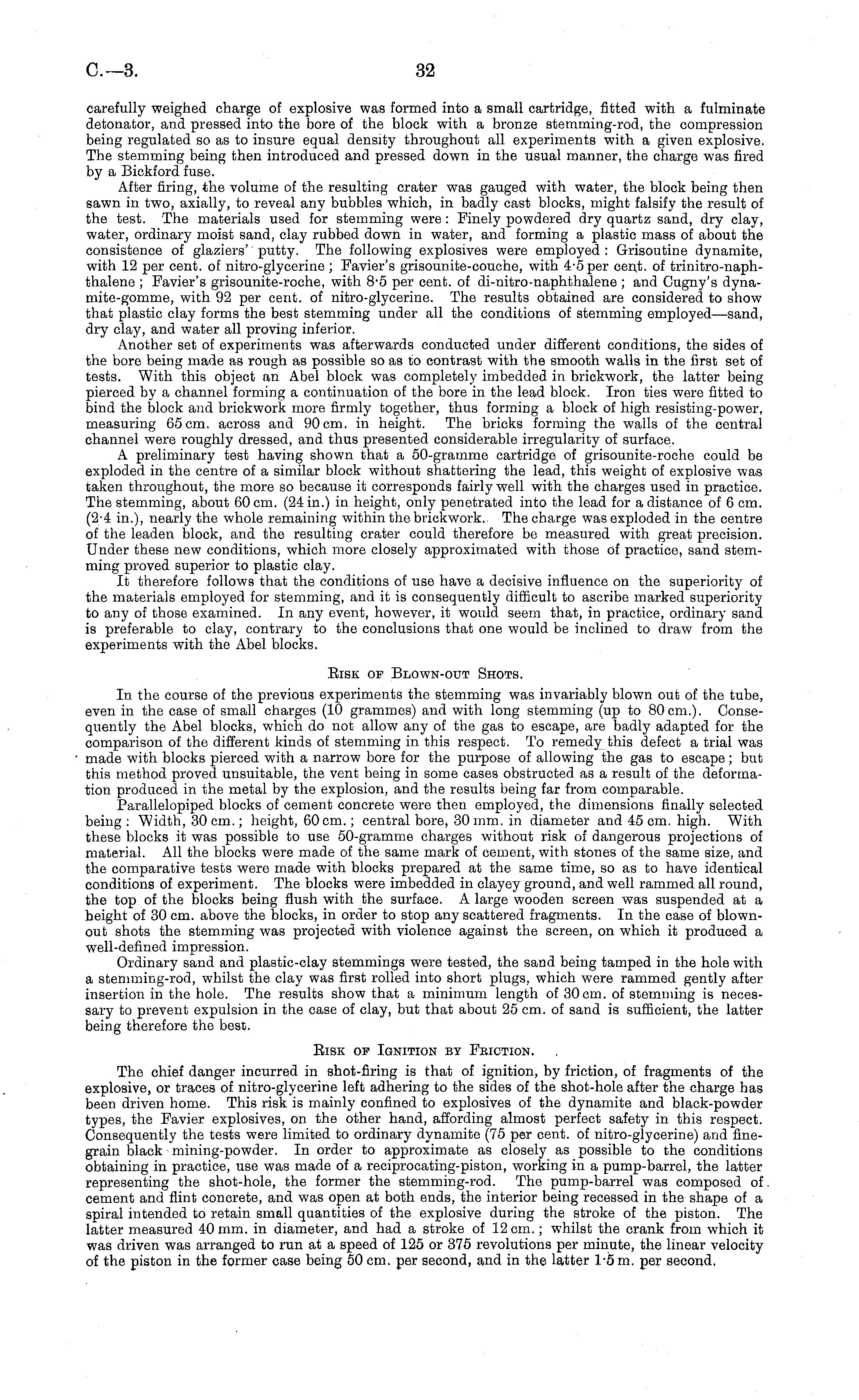 carefully weighed charge of explosive was formed into a small cartridge, fitted with a fulminate detonator, and pressed into the bore of the block with a bronze stemming-rod, the compression being regulated so as to insure equal density throughout all experiments with a given explosive. The stemming being then introduced and pressed down in the usual manner, the charge was fired by a Bickford fuse. After firing, the volume of the resulting crater was gauged with water, the block being then sawn in two, axially, to reveal any bubbles which, in badly cast blocks, might falsify the result of the test. The materials used for stemming were : Finely powdered dry quartz sand, dry clay, water, ordinary moist sand, clay rubbed down in water, and forming a plastic mass of about the consistence of glaziers' putty. The following explosives were employed : Grisoutine dynamite, with 12 per cent, of nitro-glycerine ; Pavier's grisounite-couche, with 4'sper cent, of trinitro-naph-thalene ; Pavier's grisounite-roche, with 8 - 5 per cent, of di-nitro-naphthalene ; and Cugny's dyna-mite-gomme, with 92 per cent, of nitro-glycerine. The results obtained are considered to show that plastic clay forms the best stemming under all the conditions of stemming employed —sand, dry clay, and water all proving inferior. Another set of experiments was afterwards conducted under different conditions, the sides of the bore being made as rough as possible so as to contrast with the smooth walls in the first set of tests. With this object an Abel block was completely imbedded in brickwork, the latter being pierced by a channel forming a continuation of the bore in the lead block. Iron ties were fitted to bind the block and brickwork more firmly together, thus forming a block of high resisting-power, measuring 65 cm. across and 90 cm. in height. The bricks forming the walls of the central channel were roughly dressed, and thus presented considerable irregularity of surface. A preliminary test having shown that a 50-gramme cartridge of grisounite-roche could be exploded in the centre of a similar block without shattering the lead, this weight of explosive was taken throughout, the more so because it corresponds fairly well with the charges used in practice. The stemming, about 60 cm. (24 in.) in height, only penetrated into the lead for a distance of 6 cm. (2-4 in.), nearly the whole remaining within the brickwork. The charge was exploded in the centre of the leaden block, and the resulting crater could therefore be measured with great precision. Under these new conditions, which more closely approximated with those of practice, sand stemming proved superior to plastic clay. It therefore follows that the conditions of use have a decisive influence on the superiority of the materials employed for stemming, and it is consequently difficult to ascribe marked superiority to any of those examined. In any event, however, it would seem that, in practice, ordinary sand is preferable to clay, contrary to the conclusions that one would be inclined to draw from the experiments with the Abel blocks. Bisk of Blown-out Shots. In the course of the previous experiments the stemming was invariably blown out of the tube, even in the case of small charges (10 grammes) and with long stemming (up to 80 cm.). Consequently the Abel blocks, which do not allow any of the gas to escape, are badly adapted for the comparison of the different kinds of stemming in this respect. To remedy this defect a trial was made with blocks pierced with a narrow bore for the purpose of allowing the gas to escape; but this method proved unsuitable, the vent being in some cases obstructed as a result of the deformation produced in the metal by the explosion, and the results being far from comparable. Parallelopiped blocks of cement concrete were then employed, the dimensions finally selected being : Width, 30 cm.; height, 60 cm.; central bore, 30 mm. in diameter and 45 cm. high. With these blocks it was possible to use 50-gramme charges without risk of dangerous projections of material. All the blocks were made of the same mark of cement, with stones of the same size, and the comparative tests were made with blocks prepared at the same time, so as to have identical conditions of experiment. The blocks were imbedded in clayey ground, and well rammed all round, the top of the blocks being flush with the surface. A large wooden screen was suspended at a height of 30 cm. above the blocks, in order to stop any scattered fragments. In the ease of blownout shots the stemming was projected with violence against the screen, on which it produced a well-defined impression. Ordinary sand and plastic-clay stemmings were tested, the sand being tamped in the hole with a stemming-rod, whilst the clay was first rolled into short plugs, which were rammed gently after insertion in the hole. The results show that a minimum length of 30 cm. of stemming is necessary to prevent expulsion in the case of clay, but that about 25 cm. of sand is sufficient, the latter being therefore the best. Bisk of Ignition by Fkiction. The chief danger incurred in shot-firing is that of ignition, by friction, of fragments of the explosive, or traces of nitro-glycerine left adhering to the sides of the shot-hole after the charge has been driven home. This risk is mainly confined to explosives of the dynamite and black-powder types, the Favier explosives, on the other hand, affording almost perfect safety in this respect. Consequently the tests were limited to ordinary dynamite (75 per cent, of nitro-glycerine) and finegrain black mining-powder. In order to approximate as closely as possible to the conditions obtaining in practice, use was made of a reciprocating-piston, working in a pump-barrel, the latter representing the shot-hole, the former the stemming-rod. The pump-barrel was composed of cement and flint concrete, and was open at both ends, the interior being recessed in the shape of a spiral intended 