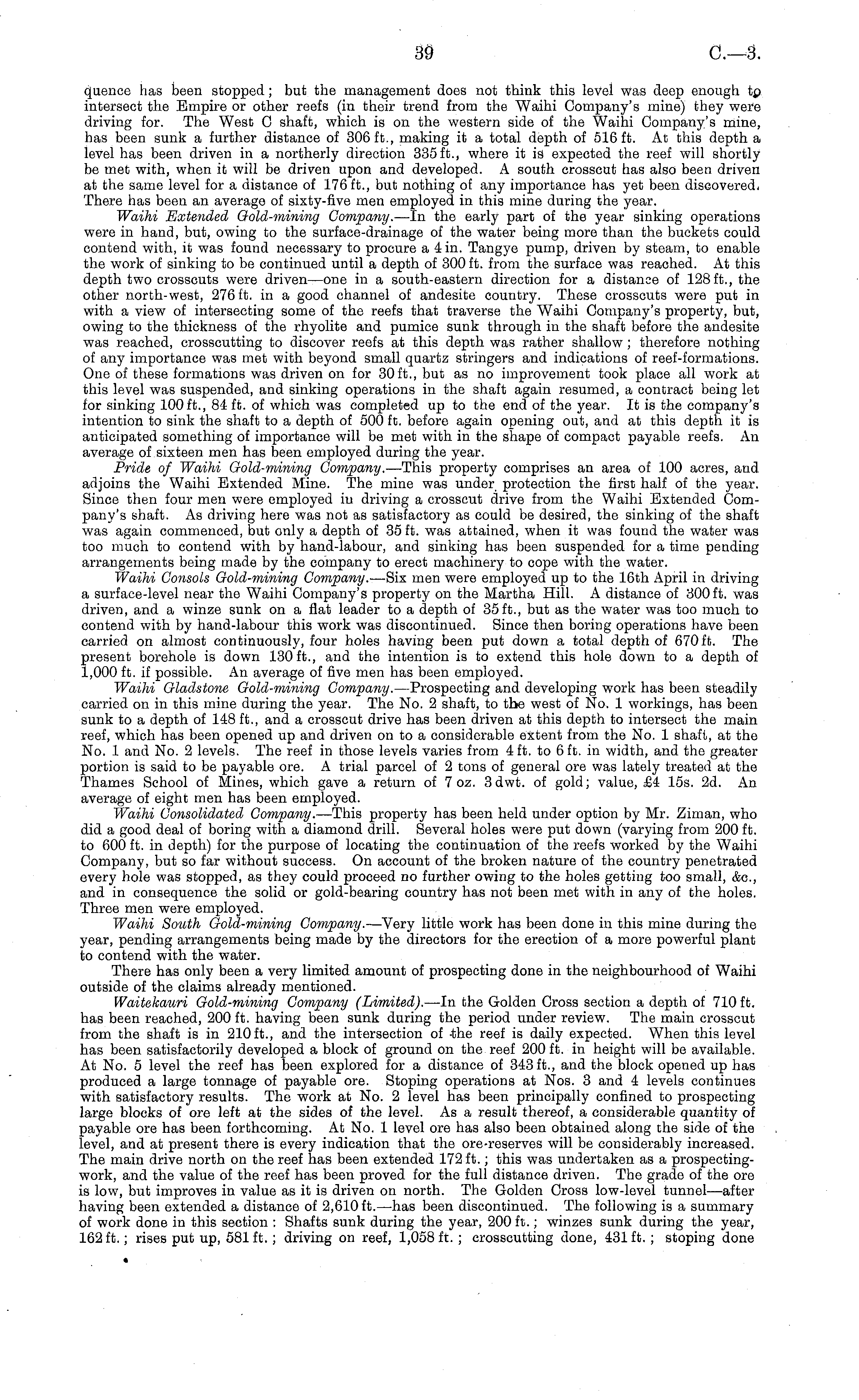 quence has been stopped; but the management does not think this level was deep enough tp intersect the Empire or other reefs (in their trend from the Waihi Company's mine) they were driving for. The West C shaft, which is on the western side of the Waihi Company's mine, has been sunk a further distance of 306 ft., making it a total depth of 516 ft. At this depth a level has been driven in a northerly direction 335 ft., where it is expected the reef will shortly be met with, when it will be driven upon and developed. A south crosscut has also been driven at the same level for a distance of 176 ft., but nothing of any importance has yet been discovered, There has been an average of sixty-five men employed in this mine during the year. Waihi Extended Qold-mining Company. —In the early part of the year sinking operations were in hand, but, owing to the surface-drainage of the water being more than the buckets could contend with, it was found necessary to procure a 4 in. Tangye pump, driven by steam, to enable the work of sinking to be continued until a depth of 300 ft. from the surface was reached. At this depth two crosscuts were driven —one in a south-eastern direction for a distance of 128 ft., the other north-west, 276 ft. in a good channel of andesite country. These crosscuts were put in with a view of intersecting some of the reefs that traverse the Waihi Company's property, but, owing to the thickness of the rhyolite and pumice sunk through in the shaft before the andesite was reached, crosscutting to discover reefs at this depth was rather shallow ; therefore nothing of any importance was met with beyond small quartz stringers and indications of reef-formations. One of these formations was driven on for 30 ft., but as no improvement took place all work at this level was suspended, and sinking operations in the shaft again resumed, a contract being let for sinking 100 ft., 84 ft. of which was completed up to the end of the year. It is the company's intention to sink the shaft to a depth of 500 ft. before again opening out, and at this depth it is anticipated something of importance will be met with in the shape of compact payable reefs. An average of sixteen men has been employed during the year. Pride of Waihi Gold-mining Company. —This property comprises an area of 100 acres, and adjoins the Waihi Extended Mine. The mine was under protection the first half of the year. Since then four men were employed in driving a crosscut drive from the Waihi Extended Company's shaft. As driving here was not as satisfactory as could be desired, the sinking of the shaft was again commenced, but only a depth of 35 ft. was attained, when it was found the water was too much to contend with by hand-labour, and sinking has been suspended for a time pending arrangements being made by the company to erect machinery to cope with the water. Waihi Consols Qold-mining Company. —Six men were employed up to the 16th April in driving a surface-level near the Waihi Company's property on the Martha Hill. A distance of 300 ft. was driven, and a winze sunk on a fiat leader to a depth of 35 ft., but as the water was too much to contend with by hand-labour this work was discontinued. Since then boring operations have been carried on almost continuously, four holes having been put down a total depth of 670 ft. The present borehole is down 130 ft., and the intention is to extend this hole down to a depth of 1,000 ft. if possible. An average of five men has been employed. Waihi Gladstone Gold-mining Company. —Prospecting and developing work has been steadily carried on in this mine during the year. The No. 2 shaft, to the west of No. 1 workings, has been sunk to a depth of 148 ft., and a crosscut drive has been driven at this depth to intersect the main reef, which has been opened up and driven on to a considerable extent from the No. 1 shaft, at the No. 1 and No. 2 levels. The reef in those levels varies from 4 ft. to 6 ft. in width, and the greater portion is said to be payable ore. A trial parcel of 2 tons of general ore was lately treated at the Thames School of Mines, which gave a return of 7 oz. 3 dwt. of gold; value, £4 15s. 2d. An average of eight men has been employed. Waihi Consolidated Company. —This property has been held under option by Mr. Ziman, who did a good deal of boring with a diamond drill. Several holes were put down (varying from 200 ft. to 600 ft. in depth) for the purpose of locating the continuation of the reefs worked by the Waihi Company, but so far without success. On account of the broken nature of the country penetrated every hole was stopped, as they could proceed no further owing to the holes getting too small, &c, and in consequence the solid or gold-bearing country has not been met with in any of the holes. Three men were employed. Waihi South Gold-mining Company. —Very little work has been done in this mine during the year, pending arrangements being made by the directors for the erection of a more powerful plant to contend with the water. There has only been a very limited amount of prospecting done in the neighbourhood of Waihi outside of the claims already mentioned. Waitekauri Gold-mining Company (Limited). —In the Golden Cross section a depth of 710 ft. has been reached, 200 ft. having been sunk during the period under review. The main crosscut from the shaft is in 210 ft., and the intersection of -the reef is daily expected. When this level has been satisfactorily developed a block of ground on the reef 200 ft. in height will be available. At No. 5 level the reef has been explored for a distance of 343 ft., and the block opened up has produced a large tonnage of payable ore. Stoping operations at Nos. 3 and 4 levels continues with satisfactory results. The work at No. 2 level has been principally confined to prospecting large blocks of ore left at the sides of the level. As a result thereof, a considerable quantity of payable ore has been forthcoming. At No. 1 le