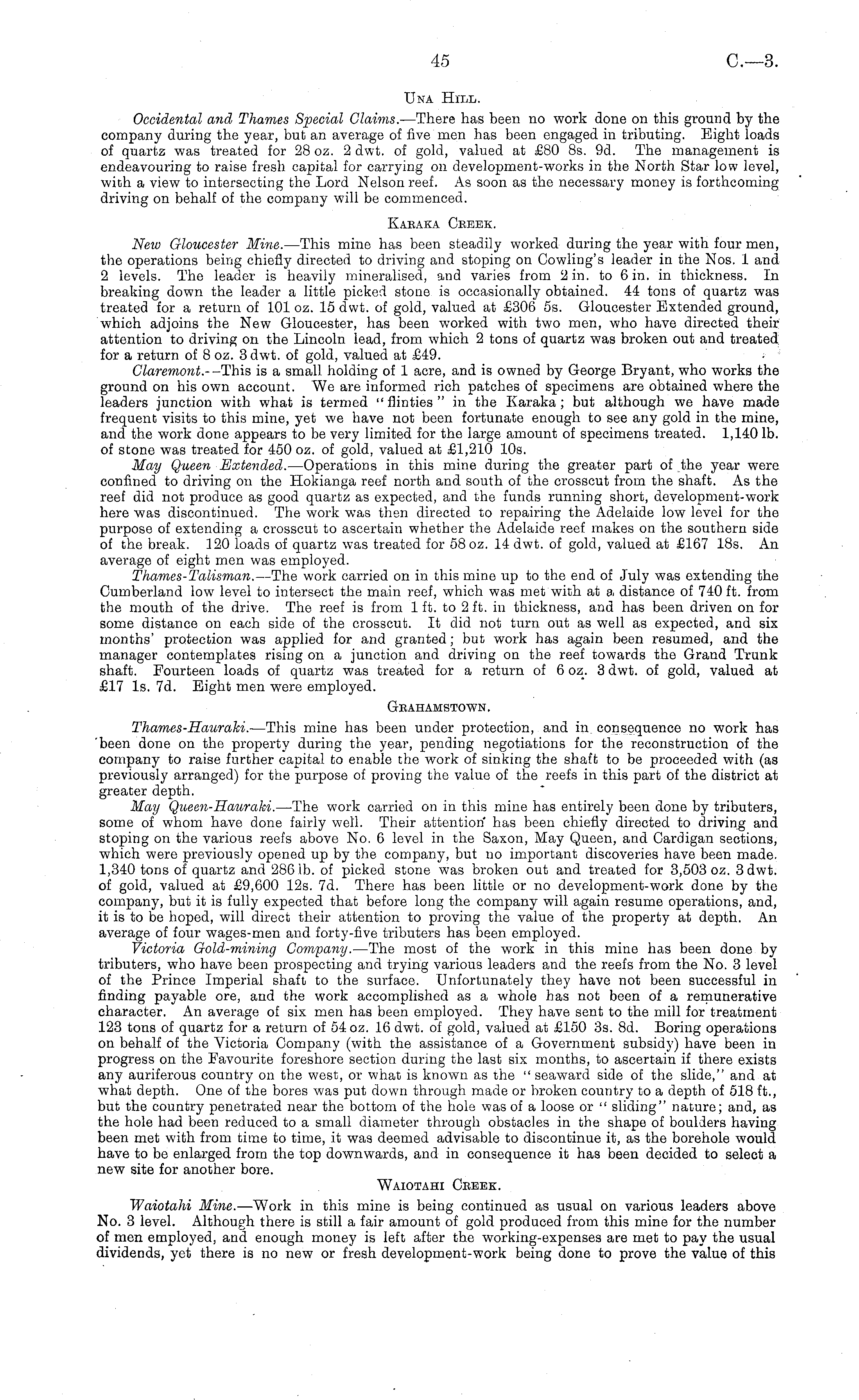 Occidental and Thames Special Claims. —There has been no work done on this ground by the company during the year, but an average of five men has been engaged in tributing. Eight loads of quartz was treated for 28 oz. 2 dwt. of gold, valued at £80 Bs. 9d. The management is endeavouring to raise fresh capital for carrying on development-works in the North Star low level, with a view to intersecting the Lord Nelson reef. As soon as the necessary money is forthcoming driving on behalf of the company will be commenced. Kaeaka Cebek. Neio Gloucester Mine. —This mine has been steadily worked during the year with four men, the operations being chiefly directed to driving and stoping on Cowling's leader in the Nos. 1 and 2 levels. The leader is heavily mineralised, and varies from 2 in. to 6 in. in thickness. In breaking down the leader a little picked stone is occasionally obtained. 44 tons of quartz was treated for a return of 101 oz. 15 dwt. of gold, valued at £306 ss. Gloucester Extended ground, which adjoins the New Gloucester, has been worked with two men, who have directed their attention to driving on the Lincoln lead, from which 2 tons of quartz was broken out and treated for a return of 8 oz. 3 dwt. of gold, valued at £49. Claremont.- -This is a small holding of 1 acre, and is owned by George Bryant, who works the ground on his own account. We are informed rich patches of specimens are obtained where the leaders junction with what is termed " flinties " in the Karaka ; but although we have made frequent visits to this mine, yet we have not been fortunate enough to see any gold in the mine, and the work done appears to be very limited for the large amount of specimens treated. 1,140 lb. of stone was treated for 450 oz. of gold, valued at £1,210 10s. May Queen Extended. —Operations in this mine during the greater part of the year were confined to driving on the Hokianga reef north and south of the crosscut from the shaft. As the reef did not produce as good quartz as expected, and the funds running short, development-work here was discontinued. The work was then directed to repairing the Adelaide low level for the purpose of extending a crosscut to ascertain whether the Adelaide reef makes on the southern side of the break. 120 loads of quartz was treated for 58 oz. 14 dwt. of gold, valued at £167 18s. An average of eight men was employed. Thames-Talisman. —The work carried on in this mine up to the end of July was extending the Cumberland low level to intersect the main reef, which was met with at s, distance of 740 ft. from the mouth of the drive. The reef is from 1 ft. to 2 ft. in thickness, and has been driven on for some distance on each side of the crosscut. It did not turn out as well as expected, and six months' protection was applied for and granted; but work has again been resumed, and the manager contemplates rising on a junction and driving on the reef towards the Grand Trunk shaft. Fourteen loads of quartz was treated for a return of 6 oz. 3 dwt. of gold, valued at £17 Is. 7d. Eight men were employed. Gbahamstown. Thames-Haurahi. —This mine has been under protection, and in consequence no work has 'been done on the property during the year, pending negotiations for the reconstruction of the company to raise further capital to enable the work of sinking the shaft to be proceeded with (as previously arranged) for the purpose of proving the value of the reefs in this part of the district at greater depth. May Queen-Hauraki. —The work carried on in this mine has entirely been done by tributers, some of whom have done fairly well. Their attention' has been chiefly directed to driving and stoping on the various reefs above No. 6 level in the Saxon, May Queen, and Cardigan sections, which were previously opened up by the company, but no important discoveries have been made. 1,340 tons of quartz and 2861b. of picked stone was broken out and treated for 3,503 oz. 3 dwt. of gold, valued at £9,600 12s. 7d. There has been little or no development-work done by the company, but it is fully expected that before long the company will again resume operations, and, it is to be hoped, will direct their attention to proving the value of the property at depth. An average of four wages-men and forty-five tributers has been employed. Victoria Gold-mining Company. —The most of the work in this mine has been done by tributers, who have been prospecting and trying various leaders and the reefs from the No. 3 level of the Prince Imperial shaft to the surface. Unfortunately they have not been successful in finding payable ore, and the work accomplished as a whole has not been of a remunerative character. An average of six men has been employed. They have sent to the mill for treatment 123 tons of quartz for a return of 54 oz. 16 dwt. of gold, valued at £150 3s. Bd. Boring operations on behalf of the Victoria Company (with the assistance of a Government subsidy) have been in progress on the Favourite foreshore section during the last six months, to ascertain if there exists any auriferous country on the west, or what is known as the " seaward side of the slide," and at what depth. One of the bores was put down through made or broken country to a depth of 518 ft., but the country penetrated near the bottom of the hole was of a loose or " sliding" nature; and, as the hole had been reduced to a small diameter through obstacles in the shape of boulders having been met with from time to time, it was deemed advisable to discontinue it, as the borehole would have to be enlarged from the top downwards, and in consequence it has been decided to select a new site for another bore. Waiotahi Cheek. Waiotahi Mine. —Work in this mine is being continued as usual on various leaders above No. 3 level. Although there is still a fair amount of gold produced from this mine for the number of men employed, and enough money is left after the working-expenses are met to pay the usual dividends, yet there