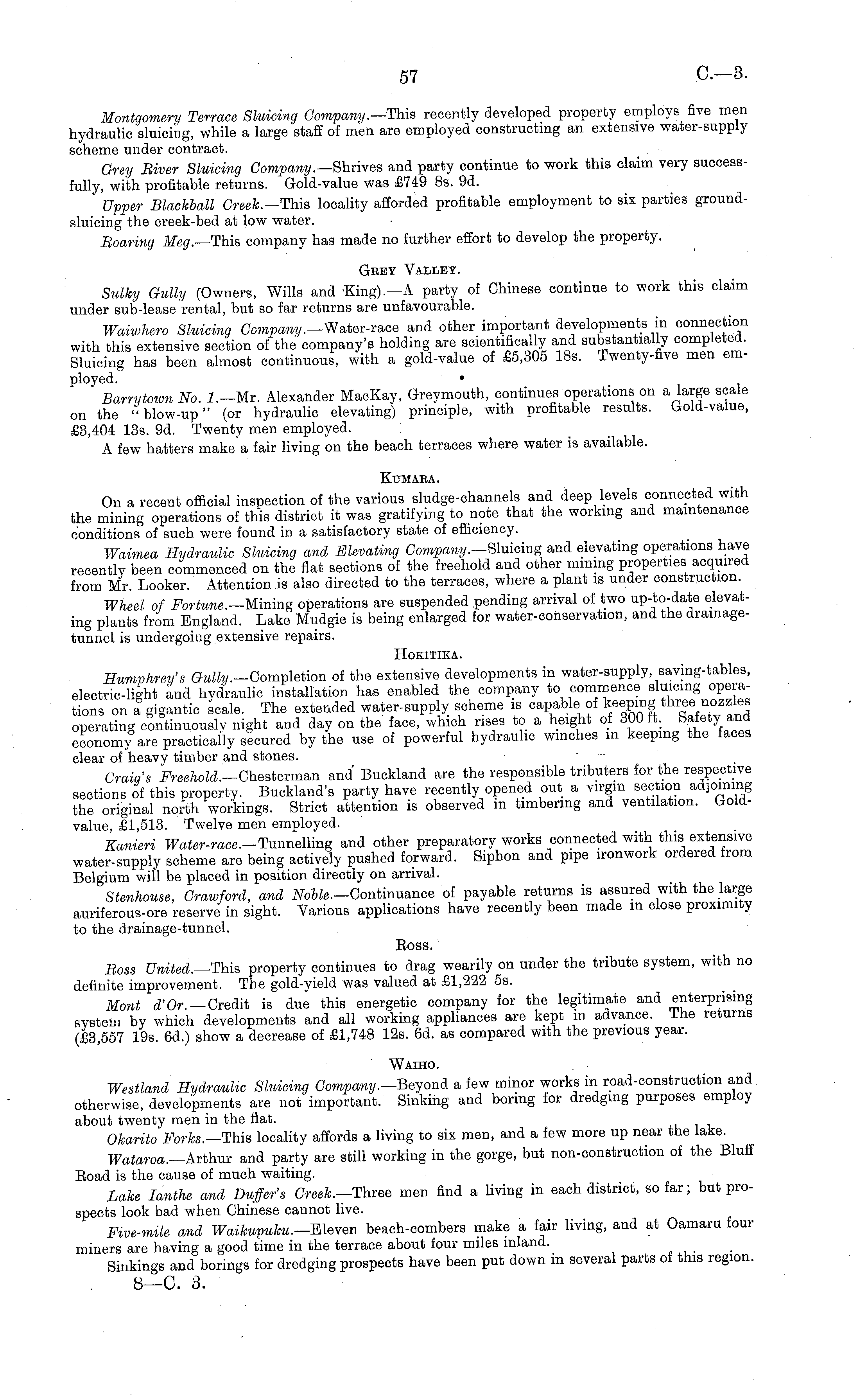 Montgomery Terrace Sluicing Company .—This recently developed property employs five men hydraulic sluicing, while a large staff of men are employed constructing an extensive water-supply scheme under contract. Grey River Sluicing Company.— thrives and party continue to work this claim very successfully, with profitable returns. Gold-value was £749 Bs. 9d. Upper Blackball Creek.—This locality afforded profitable employment to six parties groundsluicing the creek-bed at low water. Bearing Meg.— This company has made no further effort to develop the property. Geey Valley. Sulky Gully (Owners, Wills and King).—A party of Chinese continue to work this claim under sub-lease rental, but so far returns are unfavourable. Waiwhero Sluicing Company,— Water-race and other important developments in connection with this extensive section of the company's holding are scientifically and substantially completed. Sluicing has been almost continuous, with a gold-value of £5,305 18s. Twenty-five men employed. • Barry town No. 2.—Mr. Alexander MacKay, Greymouth, continues operations on a large scale on the «• blow-up" (or hydraulic elevating) principle, with profitable results. Gold-value, £3,404 13s. 9d. Twenty men employed. A few hatters make a fair living on the beach terraces where water is available. KUMAEA. On a recent official inspection of the various sludge-channels and deep levels connected with the mining operations of this district it was gratifying to note that the working and maintenance conditions of such were found in a satisfactory state of efficiency. Waimea Hydraulic Sluicing and Elevating Company.- Sluicing and elevating operations have recently been commenced on the flat sections of the freehold and other mmmg properties acquired from Mr. Looker. Attention is also directed to the terraces, where a plant is under construction. Wheel of Fortune. —Mining operations are suspended pending arrival of two up-to-date elevating plants from England. Lake Mudgie is being enlarged for water-conservation, and the drainagetunnel is undergoing extensive repairs. Hokitika. Humphrey's Gully.— Completion of the extensive developments in water-supply, saving-tables, electric-light and hydraulic installation has enabled the company to commence sluicing operations on a gigantic scale. The extended water-supply scheme is capable of keeping tpozzies operating continuously night and day on the face, which rises to a height of 300 ft. Safety and economy are practically secured by the use of powerful hydraulic winches in keeping the faces clear of heavy timber and stones. Craig's Freehold.— Chesterman and Buckland are the responsible tributers for the respective sections of this property. Buckland's party have recently opened out a virgin section adjoining the original north workings. Strict attention is observed in timbering and ventilation. Goldvalue, £1,513. Twelve men employed. Kanieri Water-roce.-Tunnelling and other preparatory works connected with this extensive water-supply scheme are being actively pushed forward. Siphon and pipe ironwork ordered from Belgium will be placed in position directly on arrival. Stenhouse, Crawford, and Noble.— Continuance of payable returns is assured with the large auriferous-ore reserve in sight. Various applications have recently been made m close proximity to the drainage-tunnel. Boss. Boss United.— -This property continues to drag wearily on under the tribute system, with no definite improvement. The gold-yield was valued at £1,222 ss. Mont dOr —Credit is due this energetic company for the legitimate and enterprising system by which developments and all working appliances are kept in advance. Ihe returns (£3,557 19s. 6d.) show a decrease of £1,748 12s. 6d. as compared with the previous year. Waiho. Westland Hydraulic Sluicing Company .-Beyond a few minor works in road-construction and otherwise, developments are not important. Sinking and boring for dredging purposes employ about twenty men in the fiat. Okarito Forks.— This locality affords a living to six men, and a few more up near the lake. Wataroa.— Arthur and party are still working in the gorge, but non-construction of the Bluff Eoad is the cause of much waiting. Lake lanthe and Duffer's Creek.— Three men find a living in each district, so far; but prospects look bad when Chinese cannot live. Five-mile and Waikwpuku.-Meven beach-combers make a fair living, and at Oamaru four miners are having a good time in the terrace about four miles inland. Sinkings and borings for dredging prospects have been put down in several parts ot this region. B—C. 3.
