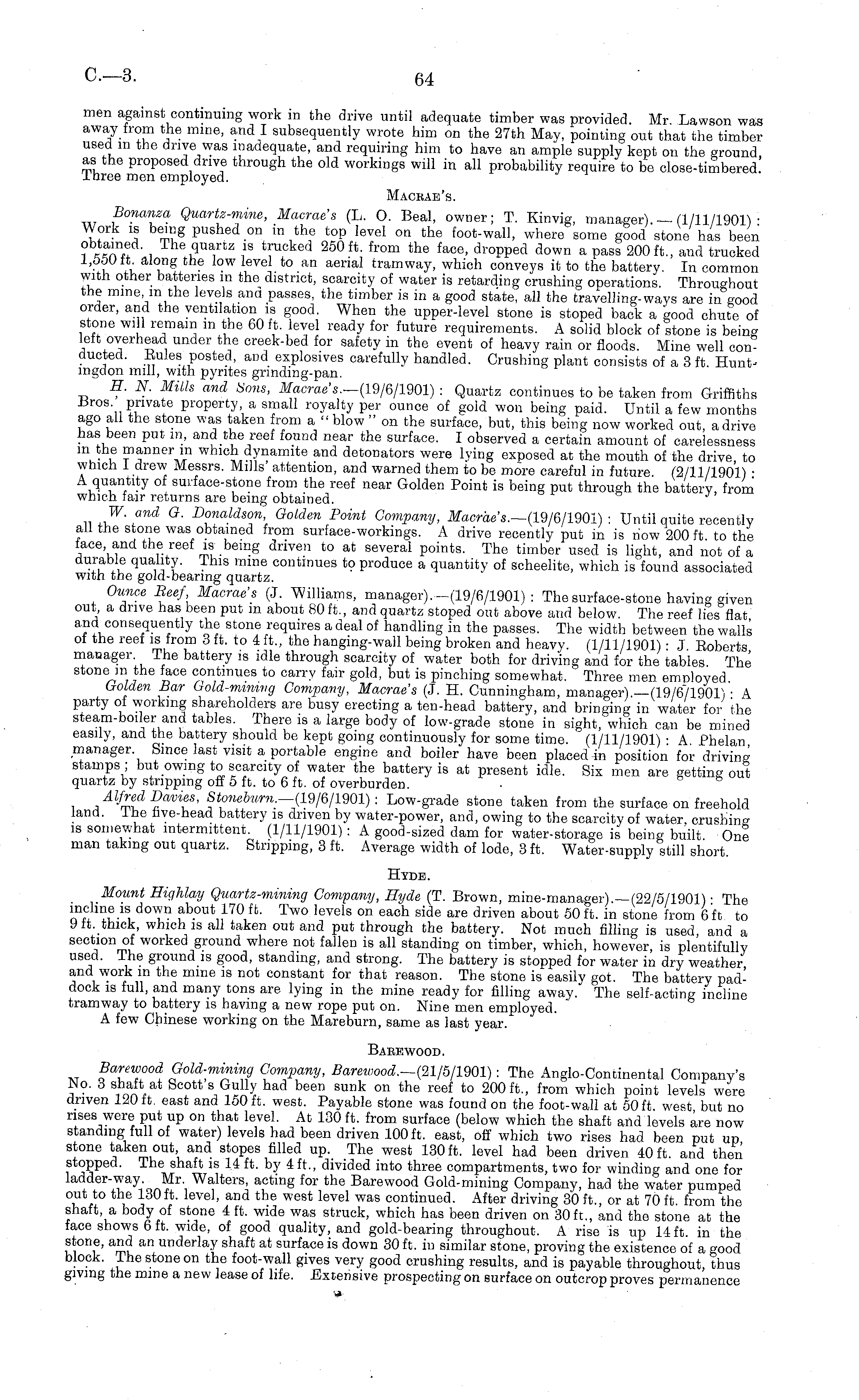 men against continuing work in the drive until adequate timber was provided. Mr Lawson was away from the mine, and I subsequently wrote him on the 27th May, pointing out that the timber used in the drive was inadequate, and requiring him to have an ample supply kept on the ground as the proposed drive through the old workings will in all probability require to be close-timbered inree men employed. Mackab's. Bonanza Quartz-mine, Macrae's (L. 0. Beal, owner; T. Kinvig, manager). —(1/11/1901) : Work is being pushed on in the top level on the foot-wall, where some good stone has been obtained. The quartz is trucked 250 ft. from the face, dropped down a pass 200 ft., and trucked 1,550 ft. along the low level to an aerial tramway, which conveys it to the battery. In common with other batteries in the district, scarcity of water is retarding crushing operations. Throughout the mine m the levels ana passes, the timber is in a good state, all the travelling-ways are in good order, and the ventilation is good. When the upper-level stone is stoped back a good chute of stone will remain in the 60 ft. level ready for future requirements. A solid block of stone is beinleft overhead under the creek-bed for safety in the event of heavy rain or floods. Mine well con* ducted. Eules posted, and explosives carefully handled. Crushing plant consists of a3 ft Huntingdon mill, with pyrites grinding-pan. H. N. Mills and Horn, Macrae's.— (l9/6/1901) : Quartz continues to be taken from Griffiths Bros private property a small royalty per ounce of gold won being paid. Until a few months ago all the stone was taken from a " blow " on the surface, but, this being now worked out a drive has been put in, and the reef found near the surface. I observed a certain amount of carelessness m v- v m ? nDer I , m ° dynamite and detonators were lying exposed at the mouth of the drive to which 1 drew Messrs. Mills attention, and warned them to be more careful in future (2/11/1901) ■ A quantity of surface-stone from the reef near Golden Point is being put through the battery from which fair returns are being obtained. 11 ? Ud G ' D ° naldson > Golden Point Company, Macrae's.— (l9/6/1901) : Until quite recently all the stone was obtained from surface-workings. A drive recently put in is now 200 ft to the face, and the reef is being driven to at several points. The timber used is light, and not of a durable quality. This mine continues to produce a quantity of scheelite, which is found associated with the gold-bearing quartz. Ounce Beef Macrae's (J. Williams, manager).—(l 9/6/1901) : The surface-stone having given out a drive has been put in about 80 ft., and quartz stoped out above and below. The reef lies flat and consequently the stone requires a deal of handling in the passes. The width between the walls of the reef is from d ft. to 4 ft., the hanging-wall being broken and heavy. (1/11/1901) : J Eoberts manager. The battery is idle through scarcity of water both for driving and for the tables The stone m the face continues to carry fair gold, but is pinching somewhat. Three men employed Golden Bar Gold-minmg Company, Macrae's (J. H. Cunningham, manager).—(l 9/6/1901) : A party of working shareholders are busy erecting a ten-head battery, and bringing in water for the steam-boiler and tables. There is a large body of low-grade stone in sight, which can be mined easily, and the battery should be kept going continuously for some time. (1/11/1901) : A Pbelan manager Since last visit a portable engine and boiler have been placed in position for driving stamps; but owing to scarcity of water the battery is at present idle. Six men are getting out quartz by stripping off 5 ft. to 6 ft. of overburden. . Alfred Davies, Stonebwm.— (l9/6/1901) : Low-grade stone taken from the surface on freehold land, ihe nve-head battery is driven by water-power, and, owing to the scarcity of water crushingis somewhat intermittent. (1/11/1901) : A good-sized dam for water-storage is being built One man taking out quartz. Stripping, 3 ft. Average width of lode, 3 ft. Water-supply still short. Hyde. Mount Eighlay Quartz-mining Company, Hyde (T. Brown, mine-manager) —(22/5/1901): The incline is down about 170 ft. Two levels on each side are driven about 50 ft. in stone from 6ft to 9 it. thick, which is all taken out and put through the battery. Not much filling is used and a section of worked ground where not fallen is all standing on timber, which, however, is plentifully used. The ground is good, standing, and strong. The battery is stopped for water in dry weather and work m the mine is not constant for that reason. The stone is easily got. The battery paddock is full, and many tons are lying in the mine ready for filling away. The self-acting incline tramway to battery is having a new rope put on. Nine men employed. A few Chinese working on the Mareburn, same as last year. Barewood. Barewood Gold-mining Company, Barewood.— (2l/5/1901) : The Anglo-Continental Company's No. 3 shaft at Scott s Gully had been sunk on the reef to 200 ft., from which point levels were driven 120 ft. east and 150 ft. west. Payable stone was found on the foot-wall at 50 ft west but no rises were put up on that level. At 130 ft. from surface (below which the shaft and levels are now standing full of water) levels had been driven 100 ft. east, off which two rises had been put up stone taken out, and stopes filled up. The west 130 ft. level had been driven 40 ft and then stopped. The shaft is 14 ft. by 4 ft., divided into three compartments, two for winding and one for ladder-way Mr Walters, acting for the Barewood Gold-mining Company, had the water pumped out to the ldOtt. level, and the west level was continued. After driving 30 ft., or at 70 ft from the shaft a body of stone 4 ft. wide was struck, which has been driven on 30 ft., and the stone at the face shows 6 ft. wide, of good quality, and gold-bearing throughout. A rise is up 14 ft in the stone, and an 