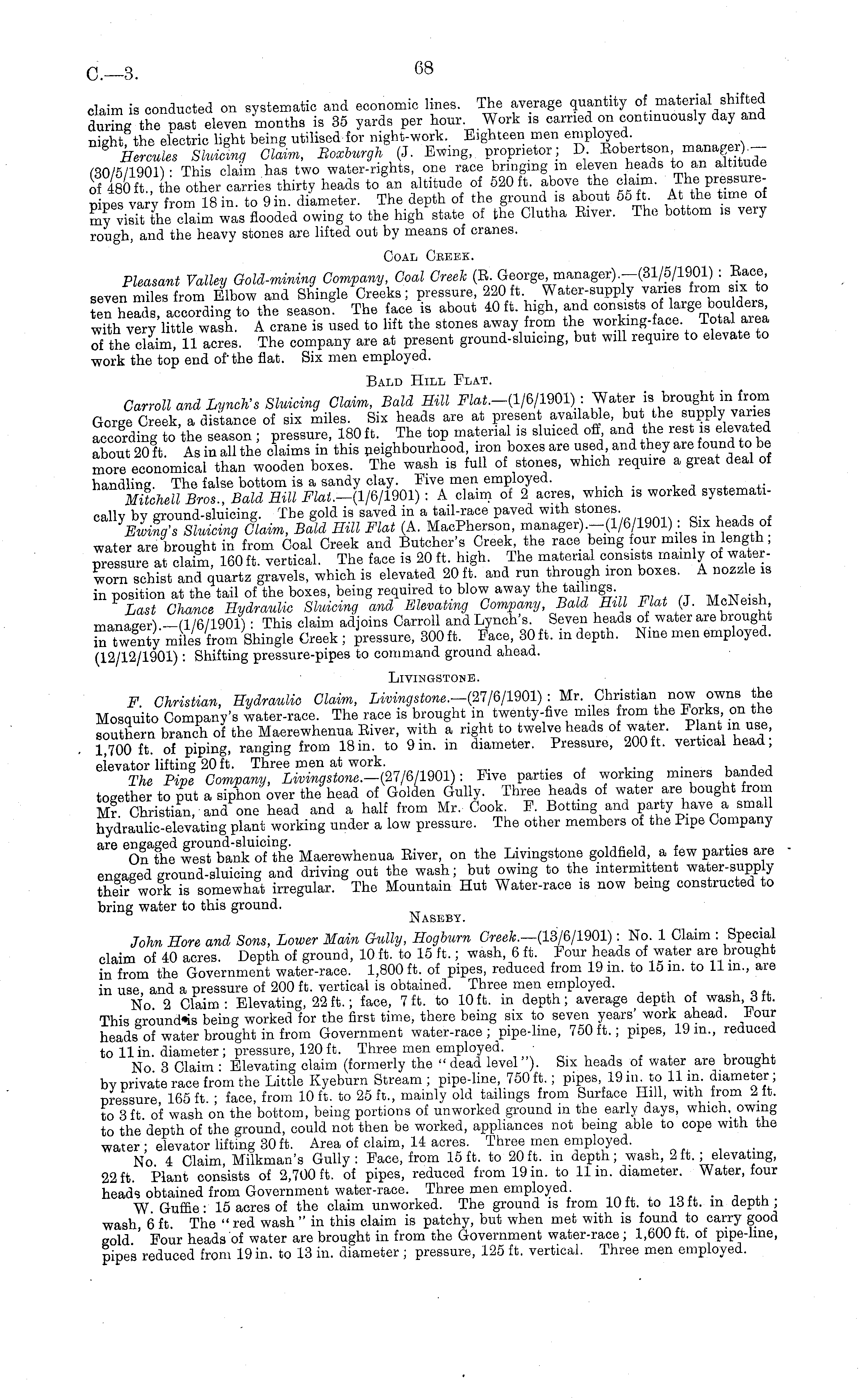 proee vary from 18 in. to 9 in. diameter. The depth of the ground is about 55 ft. At the time of mfvilftThe claim was flooded owing to the high state of the Clutha Eiver. The bottom is very rough, and the heavy stones are lifted out by means of cranes. Coal Cbeek. Pleasant Valley Gold-mining Company, Goal Greek (E. George, manager) —(31/5/1901) : Baoe, seven miles from Elbow and Shingle Creeks; pressure, 220 ft. Water-supply varies from six to ten headf according to the season' The face is about 40 ft. high, and consists of ders with very little wash. A crane is used to lift the stones away from the working-face Total area of the claim, 11 acres. The company are at present ground-sluicmg, but will require to elevate to work the top end of the flat. Six men employed. Bald Hill Flat. Carroll and Lynch's Sluicing Claim, Bald Hill : Water is brought in from Gorge Creek, a distance of six miles. Six heads are at present available, but the supply vanes according to the season ; pressure, 180 ft. The top materia is slmced off and the rest is elevated about 20 ft. As in all the claims in this neighbourhood, iron boxes are used and they are found to be mare economical than wooden boxes. The wash is full of stones, which require a great deal of handling. The false bottom is a sandy clay. Five men employed. ofomnH Mitchell Bros., Bald Rill : A claim of 2 acres, which is worked systematically by ground-sluicing. The gold is saved in a tail-race paved with stones Ewinq's Sluicing Claim, Bald Hill Flat (A. MacPherson, manager).-(1/6/1901). Six heads of water are brought in from Coal Creek and Butcher's Creek, the race being our miles in length ; pressure at claim, 160 ft. vertical. The face is 20 ft. high. The material consists mamly of waterworn schist and quartz gravels, which is elevated 20 ft. and run through iron boxes. A nozzle is in position at the tail of the boxes, being required to blow away the tailings M.Nrish Last Chance Hydraulic Sluicing and Elevating Company Bald mil Flat (3. McNeish manager) -(1/6/1901) : This claim adjoins Carroll and Lynch's. Seven heads of water are brought in twenty miles from Shingle Creek ; pressure, 300 ft. Face, 30 ft. m depth. Nine men employed. (12/12/1901) : Shifting pressure-pipes to command ground ahead. Livingstone. F Christian, Hydraulic Claim, Livingstane.-(27fi/1901) : Mr. Christian now owns the Mosquito Company's water-race. The race is brought in twenty-five miles from the Forks on the southern branch of the Maerewhenua Eiver, with a right to twelve heads of water. Plant in use, UOOft. of piping, ranging from 18 in. to 9 in. in diameter. Pressure, 200 ft. vertical head; elevator lifting 20 ft. Three men at work. . The Pipe Company, Livingstone.-{27 J '6/1901): Five parties of working miners banded together to put a siphon over the head of Golden Gully. Three heads of water are bought from Mr Christian, and one head and a half from Mr. Cook. F. Bottmg and party have a small hydraulic-elevating plant working under a low pressure. The other members of the Pipe Company are engaged n 3an S k U J ) O f l^ c Maerew henua Eiver, on the Livingstone goldfield, a few parties are engaged ground-sluicing and driving out the wash; but owing to the intermittent water-supply their work is somewhat irregular. The Mountain Hut Water-race is now being constructed to bring water to this ground. Nasbby. John Hore and Sons, Lower Main Gully, Hogburn Greek.— (l 3/6/1901): No. 1 Claim : Special claim of 40 acres. Depth of ground, 10 ft. to 15 ft.; wash, 6 ft. Four heads of water are brought in from the Government water-race. 1,800 ft. of pipes, reduced from 19 in. to 15 in. to 11 in., are in use and a pressure of 200 ft. vertical is obtained. Three men employed. No 2 Claim- Elevating, 22 ft.; face, 7 ft. to 10 ft. in depth; average depth of wash, 3 ft. This being worked for the first time, there being six to seven years' work ahead, iour heads of water brought in from Government water-race ; pipe-line, 750 ft.; pipes, 19 m., reduced to 11 in. diameter; pressure, 120 ft. Three men employed. "„.,.,, , ~ No 3 Claim : Elevating claim (formerly the "dead level"). Six heads of water are brought by private race from the Little Kyeburn Stream; pipe-line, 750 ft.; pipes, 19 in to llm. diameter; pressure 165 ft. ; face, from 10ft. to 25ft., mainly old tailings from Surface Hill, with from 2ft. to 3ft of wash on the bottom, being portions of unworked ground in the early days, which, owing to the depth of the ground, could not then be worked, appliances not being able to cope with the water ; elevator lifting 30 ft. Area of claim, 14 acres. Three men employed. No 4 Claim, Milkman's Gully: Face, from 15 ft. to 20 ft. in depth; wash, 2 ft.; elevating, 22 ft. Plant consists of 2,700 ft. of pipes, reduced from 19 in. to 11 in. diameter. Water, four heads obtained from Government water-race. Three men employed. _■ _ W Guffie: 15 acres of the claim unworked. The ground is from 10 ft. to 13 ft. m depth; wash 6ft The "red wash" in this claim is patchy, but when met with is found to carry good gold ' Four heads of water are brought in from the Government water-race; 1,600 ft. of pipe-line, pipes reduced from 19 in. to 13 in. diameter ; pressure, 125 ft. vertical. Three men employed.