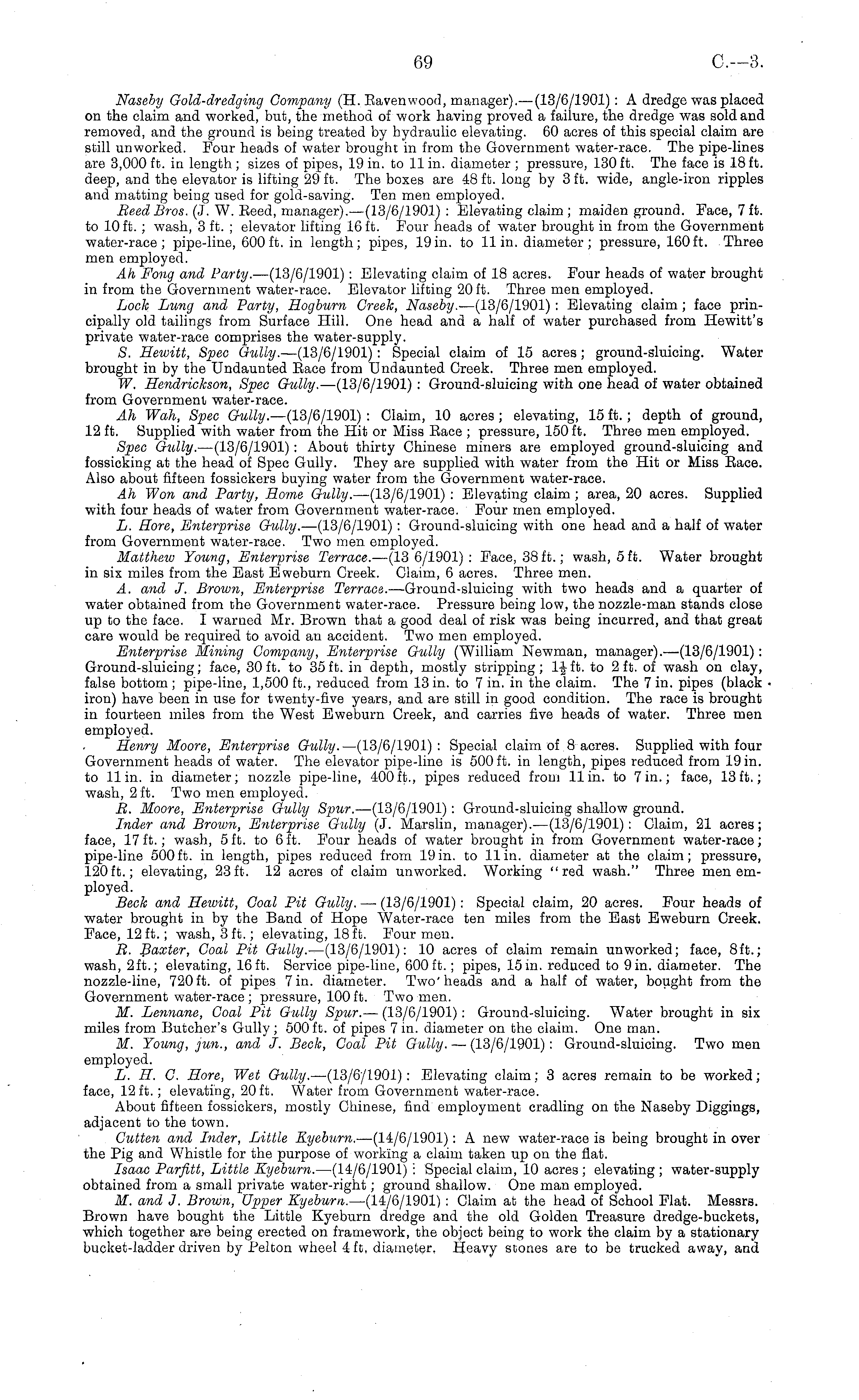 Naseby Gold-dredging Company (H. Bavenwood, manager). — (13/6/1901): A dredge was placed on the claim and worked, but, the method of work having proved a failure, the dredge was sold and removed, and the ground is being treated by hydraulic elevating. 60 acres of this special claim are still unworked. Four heads of water brought in from the Government water-race. The pipe-lines are 3,000 ft. in length ; sizes of pipes, 19 in. to 11 in. diameter ; pressure, 130 ft. The face is 18 ft. deep, and the elevator is lifting 29 ft. The boxes are 48 ft. long by 3 ft. wide, angle-iron ripples and matting being used for gold-saving. Ten men employed. Beedßros. (J. W. Eeed, manager).—(l 3/6/1901): Elevating claim ; maiden ground. Face, 7 ft. to 10 ft. ; wash, 3 ft. ; elevator lifting 16 ft. Four heads of water brought in from the Government water-race; pipe-line, 600 ft. in length; pipes, 19in. to 11 in. diameter; pressure, 160 ft. Three men employed. Ah Fong and Party. —(l 3/6/1901): Elevating claim of 18 acres. Four heads of water brought in from the Government water-race. Elevator lifting 20 ft. Three men employed. Lock Lung and Party, Hogburn Creek, Naseby. —(l3/6/1901) : Elevating claim ; face principally old tailings from Surface Hill. One head and a half of water purchased from Hewitt's private water-race comprises the water-supply. S. Hewitt, Spec Gully. —(l 3/6/1901): Special claim of 15 acres; ground-sluicing. Water brought in by the Undaunted Bace from Undaunted Creek. Three men employed. W. Hendrickson, Spec Gully. —(l 3/6/1901) : Ground-sluicing with one head of water obtained from Government water-race. Ah Wah, Spec Gully. —(l 3/6/1901) : Claim, 10 acres ; elevating, 15 ft. ; depth of ground, 12 ft. Supplied with water from the Hit or Miss Eace ; pressure, 150 ft. Three men employed. Spec Gully. —(l 3/6/1901): About thirty Chinese miners are employed ground-sluicing and fossicking at the head of Spec Gully. They are supplied with water from the Hit or Miss Eace. Also about fifteen fossickers buying water from the Government water-race. Ah Won and Party, Home Gully. —(l 3/6/1901) : Elevating claim; area, 20 acres. Supplied with four heads of water from Government water-race. Four men employed. L. Hore, Enterprise Gully. —(l 3/6/1901): Ground-sluicing with one head and a half of water from Government water-race. Two men employed. Matthew Young, Enterprise Terrace. —(13 6/1901) : Face, 38 ft.; wash, 5 ft. Water brought in six miles from the East Eweburn Creek. Claim, 6 acres. Three men. A. and J. Brown, Enterprise Terrace. —Ground-sluicing with two heads and a quarter of water obtained from the Government water-race. Pressure being low, the nozzle-man stands close up to the face. I warned Mr. Brown that a good deal of risk was being incurred, and that great care would be required to avoid an accident. Two men employed. Enterprise Mining Company, Enterprise Gully (William Newman, manager).—(l 3/6/1901) : Ground-sluicing; face, 30ft. to 35ft. in depth, mostly stripping; 1-J-ft. to 2ft. of wash on clay, false bottom; pipe-line, 1,500 ft., reduced from 13 in. to 7 in. in the claim. The 7 in. pipes (black iron) have been in use for twenty-five years, and are still in good condition. The race is brought in fourteen miles from the West Eweburn Creek, and carries five heads of water. Three men employed. Henry Moore, Enterprise Gully. —(l 3/6/1901): Special claim of 8 acres. Supplied with four Government heads of water. The elevator pipe-line is 500 ft. in length, pipes reduced from 19 in. to 11 in. in diameter; nozzle pipe-line, 400 ft., pipes reduced from 11 in. to 7 in.; face, 13 ft.; wash, 2 ft. Two men employed. B. Moore, Enterprise Gully Spur. —(l 3/6/1901) : Ground-sluicing shallow ground. Inder and Brown, Enterprise Gully (J. Marslin, manager).—(l 3/6/1901): Claim, 21 acres; face, 17ft.; wash, sft. to 6ft. Four heads of water brought in from Government water-race; pipe-line 500 ft. in length, pipes reduced from 19 in. to 11 in. diameter at the claim; pressure, 120 ft.; elevating, 23ft. 12 acres of claim unworked. Working "red wash." Three men employed. Beck and Hewitt, Goal Pit Gully. — (13/6/1901): Special claim, 20 acres. Four heads of water brought in by the Band of Hope Water-race ten miles from the East Eweburn Creek. Face, 12 ft.; wash, 3 ft.; elevating, 18 ft. Four men. B. Baxter, Coal Pit Gully. —(l 3/6/1901): 10 acres of claim remain unworked; face, Bft.; wash, 2ft.; elevating, 16 ft. Service pipe-line, 600 ft.; pipes, 15 in. reduced to 9 in. diameter. The nozzle-line, 720 ft. of pipes 7 in. diameter. Two'heads and a half of water, bought from the Government water-race ; pressure, 100 ft. Two men. M. Lennane, Coal Pit Gully Spur. — (13/6/1901): Ground-sluicing. Water brought in six miles from Butcher's Gully; 500 ft. of pipes 7 in. diameter on the claim. One man. M. Young, jun., and J. Beck, Coal Pit Gully. —■ (13/6/1901) : Ground-sluicing. Two men employed. L. H. G. Hore, Wet Gully. —(l 3/6/1901): Elevating claim; 3 acres remain to be worked; face, 12 ft. ; elevating, 20 ft. Water from Government water-race. About fifteen fossickers, mostly Chinese, find employment cradling on the Naseby Diggings, adjacent to the town. Cutten and Inder, Little Kyeburn. —(l4/6/1901): A new water-race is being brought in over the Pig and Whistle for the purpose of working a claim taken up on the flat. Isaac Parfitt, Little Kyeburn. —(l4/6/1901) : Special claim, 10 acres ; elevating ; water-supply obtained from a small private water-right ; ground shallow. One man employed. M. and J. Brown, Upper Kyeburn. —(l4/6/1901) : Claim at the head of School Flat. Messra. Brown have bought the Little Kyeburn dredge and the old Golden Treasure dredge-buckets, which together are being erected on framework, the object being to work the claim by a stationary bucket-ladder driven by Pelton wheel 4 fo, diameter, Heavy stones are to be trucked away, and