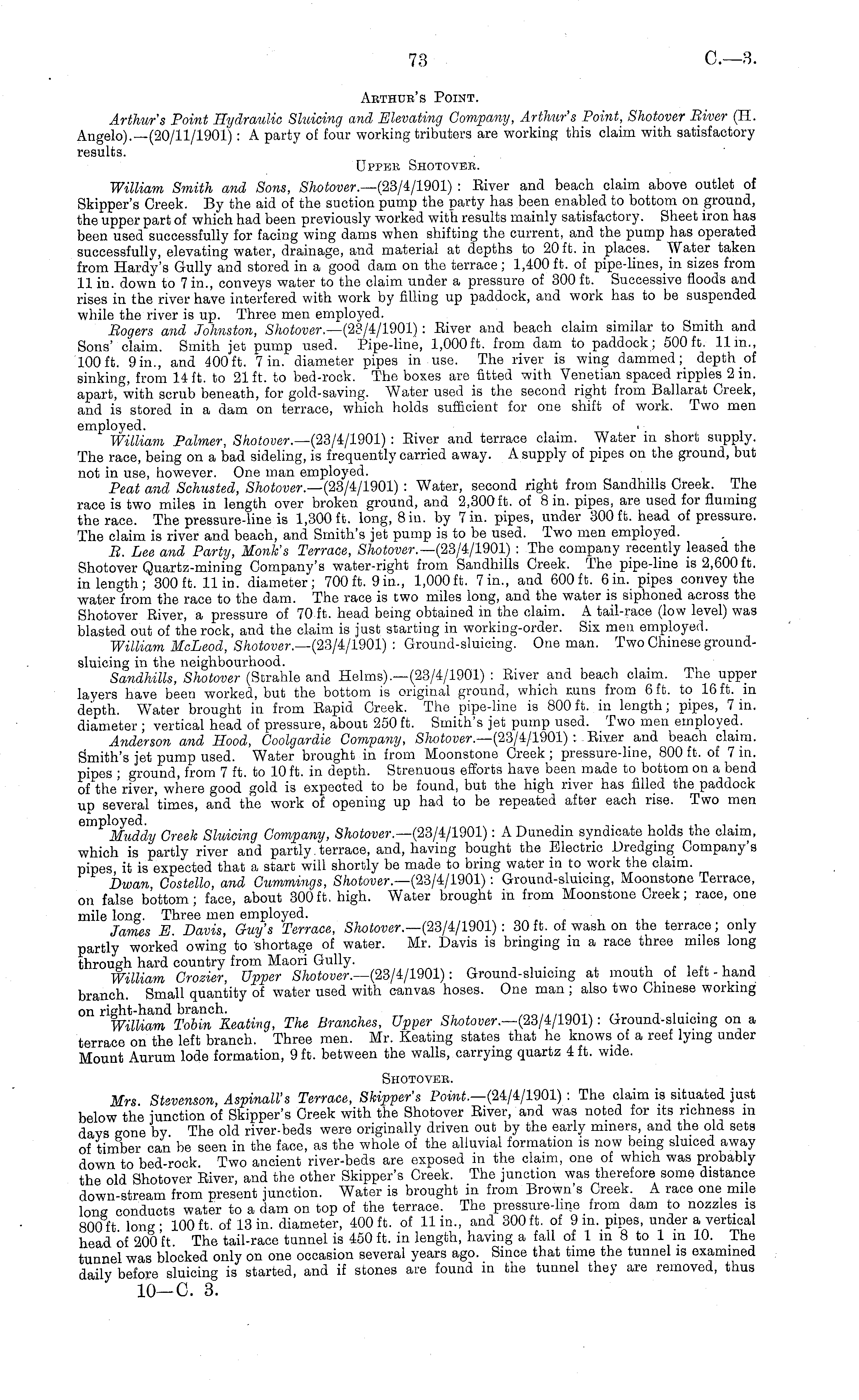 Arthur's Point Hydraulic Sluicing and Elevating Company, Arthur's Point, Shotover Biver (H. Angelo).—(2o/11/1901): A party of four working tributers are working this claim with satisfactory results. Upper Shotovbe. William Smith and Sons, Shotover.— (23/4/1901) : Eiver and beach claim above outlet of Skipper's Creek. By the aid of the suction pump the party has been enabled to bottom on ground, the upper part of which had been previously worked with results mainly satisfactory. Sheet iron has been used successfully for facing wing dams when shifting the current, and the pump has operated successfully, elevating water, drainage, and material at depths to 20 ft. in places. Water taken from Hardy's Gully and stored in a good dam on the terrace; 1,400 ft. of in sizes from 11 in. down to 7 in., conveys water to the claim under a pressure of 300 ft. Successive floods and rises in the river have interfered with work by filling up paddock, and work has to be suspended while the river is up. Three men employed. Sogers and Johnston, Shotover,— (23/4/1901): Eiver and beach claim similar to Smith and Sons' claim. Smith jet pump used. Pipe-line, I,oooft. from dam to paddock; 500 ft. 11 in., 100 ft. 9 in., and 400 ft. 7 in. diameter pipes in use. The river is wing dammed;_ depth of sinking, from 14 ft. to 21ft. to bed-rock. The boxes are fitted with Venetian spaced ripples 2 in. apart,"with scrub beneath, for gold-saving. Water used is the second right from Ballarat Creek, and is stored in a dam on terrace, which holds sufficient for one shift of work. Two men employed. William Palmer, Shotover. —(23/4/1901) : Eiver and terrace claim. Water in short supply. The race, being on a bad sideling, is frequently carried away. A supply of pipes on the ground, but not in use, however. One man employed. Peat and Schusted, Shotover.— (23/'4/'1901) : Water, second right from Sandhills Creek. The race is two miles in length over broken ground, and 2,300 ft. of 8 in. pipes, are used for fluming the race. The pressure-line is 1,300 ft. long, 8 in. by 7 in. pipes, under 300 ft. head of pressure. The claim is river and beach, and Smith's jet pump is to be used. Two men employed. B. Lee and Party, Monk's Terrace, Shotover.— (23/4/1901) : The company recently leased the Shotover Quartz-mining Company's water-right from Sandhills Creek. The pipe-line is 2,600 ft. in length; 300 ft. 11 in. diameter; 700 ft. 9 in., I,oooft. 7 in., and 600 ft. 6 in. pipes convey the water from the race to the dam. The race is two miles iong, and the water is siphoned across the Shotover River, a pressure of 70 ft. head being obtained in the claim. A tail-race (low level) was blasted out of the rock, and the claim is just starting in working-order. Six men employed. William McLeod, Shotover.— (23/4/1901) : Ground-sluicing. One man. Two Chinese groundsluicing in the neighbourhood. Sandhills, Shotover (Strahle and Helms).—(23/4/1901) : Eiver and beach claim. The upper layers have been worked, but the bottom is original ground, which mns from 6 ft. to 16 ft. in depth. Water brought in from Eapid Creek. The pipe-line is 800 ft. in length; pipes, 7 in. diameter; vertical head of pressure, about 250 ft. Smith's jet pump used. Two men employed. Anderson and Hood, Coolgardie Company, Shotover.— (23/4/1901) : Eiver and beach claim. Smith's jet pump used. Water brought in from Moonstone Creek ; pressure-line, 800 ft. of 7 in. pipes ; ground, from 7 ft. to 10 ft. in depth. Strenuous efforts have been made to bottom on a bend of the'river, where good gold is expected to be found, but the high river has filled the paddock up several times, and the work of opening up had to be repeated after each rise. Two men mV Muddy Greek Sluicing Company, Shotover.— (23/4/1901): ADunedin syndicate holds the claim, which is partly river and partly terrace, and, having bought the Electric Dredging Company's pipes it is expected that a start will shortly be made to bring water in to work the claim. Dwan Costello, and Cummings, Shotover.— (23/4/1901) : Ground-sluicing, Moonstone Terrace, on false bottom; face, about 300 ft. high. Water brought in from Moonstone Creek; race, one mile lone. Three men employed. .■•,-,, James E Davis, Guy's Terrace, Shotover.— (23/4/1901) :30 ft. of wash on the terrace; only partly worked owing to shortage of water. Mr. Davis is bringing in a race three miles long through hard country from Maori Gully. , ~ . ~ -, & i_ j William Crozier, Upper Shotover.— (23/4/1901): Ground-sluicmg at mouth of left-hand branch. Small quantity of water used with canvas hoses. One man ; also two Chinese working William Tobin Keating, The Branches, Upper Shotover.— (23/4/1901): Ground-sluicing on a terrace on the left branch. Three men. Mr. Keating states that he knows of a reef lying under Mount Aurum lode formation, 9 ft. between the walls, carrying quartz 4 ft. wide. Shotovek. Mrs Stevenson, AspinalVs Terrace, Shipper's Point.— (24/4/1901) : The claim is situated just below the junction of Skipper's Creek with the Shotover Eiver, and was noted for its richness in days gone by The old river-beds were originally driven out by the early miners, and the old sets of timber can be seen in the face, as the whole of the alluvial formation is now being sluiced away down to bed-rock. Two ancient river-beds are exposed in the claim, one of which was probably the old Shotover Eiver, and the other Skipper's Creek. The junction was therefore some distance down-stream from present junction. Water is brought in from Brown's Creek A race one mile lone conducts water to a dam on top of the terrace. The pressure-line from dam to nozzles is 800 ft long- 100 ft of 13 in. diameter, 400 ft. of 11 in., and 300 ft. of 9 in. pipes, under a vertical head of 200 ft The tail-race tunnel is 450 ft. in length, having a fall of linBto 1 m 10. The tunnel was blocked only on one occasion several years ago. Since that time the tunnel is examined daily before sl