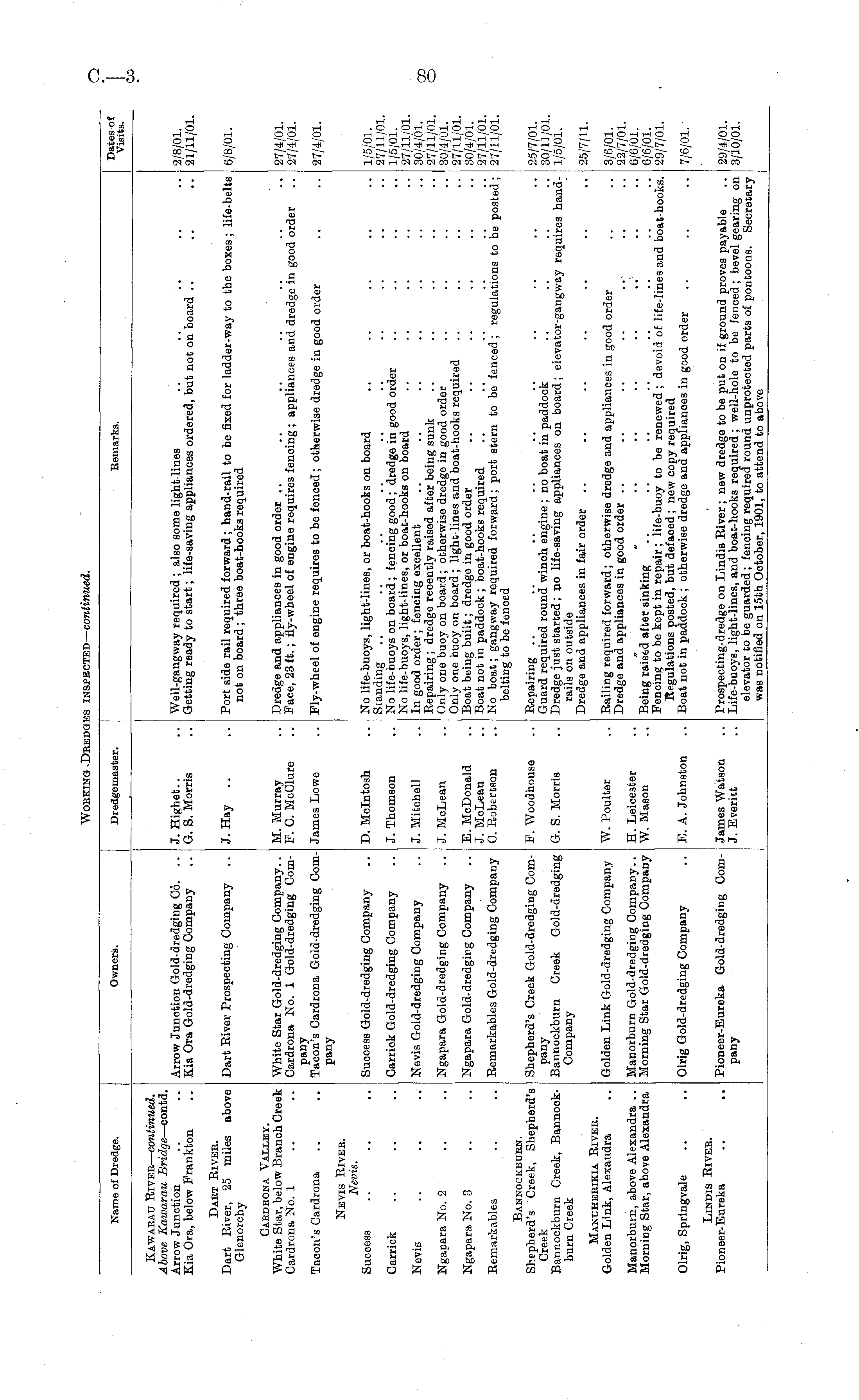 Name of Dredge. Owners. Dredgemaster. Remarks. Datea of Visits. Kawaeau River — continued. Above Kawarau Bridge —contd. Arrow Junction Kia Ora, below Frankton Arrow Junction Gold-dredging Co. Kia Ora Gold-dredging Company J. Highet.. G. S. Morris Well-gangway required ; also some light-lines Getting ready to start; life-saving appliances ordered, but not on board 2/8/01. 21/11/01. Dart Riveb. Dart River, 25 miles above Glenorchy Dart River Prospecting Company J. Hay .. Port side rail required forward; hand-rail to be fixed for ladder-way to the boxes ; life-belts not on board ; three boat-hooks required 6/8/01. Cabdrona Valley. White Star, below Branch Creek Cardrona No. 1 White Star Gold-dredging Company.. Cardrona No. 1 Gold-dredging Company Tacon's Cardrona Gold-dredging ComM. Murray P. C. McClure Dredge and appliances in good order Face, 23 ft.; fly-wheel of engine requires fencing ; appliances and dredge in good order 27/4/01. 27/4/01. Taoon's Cardrona James Lowe Fly-wheel of engine requires to be fenced; otherwise dredge in good order 27/4/01. Nevis River. Nevis. pany Success Gold-dredging Company D. Mclntosh No life-buoys, light-lines, or boat-hooks on board Standing No life-buoys on board; fencing good; dredge in good order No life-buoys, light-lines, or boat-hooks on board In good order; fencing excellent Repairing ; dredge recently raised after being sunk Only one buoy on board ; otherwise dredge in good order Only one buoy on board ; light-lines and boat-hooks required Boat being built; dredge in good order Boat not in paddock ; boat-hooks required No boat; gangway required forward ; port stern to be fenced ; regulations to be posted ; belting to be fenced 1/5/01. 27/11/01. 1/5/01. 27/11/01. 30/4/01. 27/11/01. 30/4/01. 27/11/01. 30/4/01. 27/11/01. 27/11/01. Success Carrick Carrick Gold-dredging Company J. Thomson Nevis Nevis Gold-dredging Company J. Mitchell Ngapara No. 2 Ngapara Gold-dredging Company J. McLean Ngapara No. 3 Ngapara Gold-dredgirg Company E. McDonald J. McLean C. Robertson Remarkables Remarkables Gold-dredging Company Bannockburn. Shepherd's Creek, Shepherd's Creek Bannockburn Creek, Bannockburn Creek Shepherd's Creek Gold-dredging Company Bannockburn Creek Gold-dredging Company P. Woodbouse G. S. Morris Repairing Guard required round winch engine ; no boat in paddock Dredge just started; no life-saving appliances on board; elevator-gangway requires handrails on outside Dredge and appliances in fair order 25/7/01. 30/11/01. 1/5/01. Manuherikia Rivee. Golden Link, Alexandra W. Poulter 25/7/11. Golden Link Gold-dredging Company Railing required forward; otherwise dredge and applianoes in good order Dredge and appliances in good order Being raised after sinking Fencing to be kept in repair ; life-buoy to be renewed ; devoid of life-lines and boat-hooks. Regulations posted, but defaced ; new copy required Boat not in paddock ; otherwise dredge and appliances in good order 3/6/01. 22/7/01. 6/6/01. 6/6/01. 29/7/01. Manorburn, above Alexandra .. Morning Star, above Alexandra Manorburn Gold-dredging Company.. Morning Star Gold-dredging Company H. Leicester W. Mason Olrig, Springvale Olrig Gold-dredging Company E. A. Johnston 7/6/01. Lindis Rivee. Pioneer-Eureka Pioneer-Eureka Gold-dredging Company James Watson J. Everitt 29/4/01. 3/10/01. Prospecting-dredge on Lindis River ; new dredge to be put on if ground proves payable Life-buoys, light-lines, and boat-hooks required; well-hole to be fenced; bevel gearing on elevator to be guarded; fencing required round unprotected parts of pontoons. Secretary was notified on 15th October, 1901, to attend to above