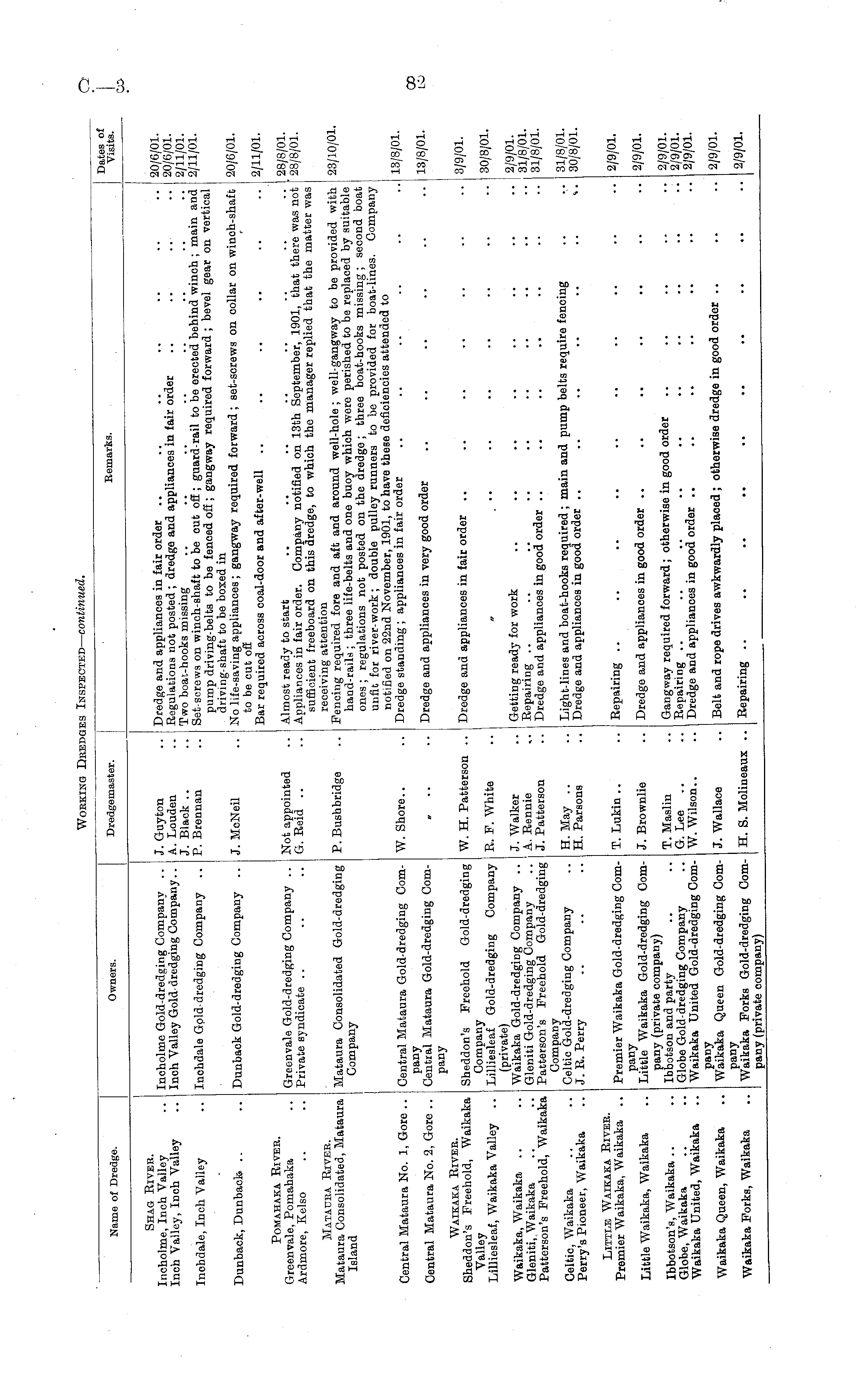 Dredgemaster. Remarks. Dates of Visits. Name of Dredge. Owners. Shag Biver. Ineholme, Inch Valley Inch Valley, Inch Valley Inoholme Gold-dredging Company .. Inch Valley Gold-dredging Company.. J. Guyton A. Louden J. Black .. P. Brennan Dredge and appliances in fair order Begulations not posted ; dredge and appliances in fair order Two boa r .-hooks missing Set-screws on winch-shaft to be out off; guard-rail to be erected behind winch ; main and pump driving-belts to be fenced off; gangway required forward ; bevel gear on vertical driving-shaft to be boxed in No life-saving appliances; gangway required forward ; set-screws on collar on winch-shaft | to be cut off Bar required across coal-door and after-well .. .. .. .. • • 20/6/01. 20/6/01. 2/11/01. 2/11/01. Inohdale, Inch Valley Inohdale Gold-dredging Company .. Dunback, Dunback- .. Dunbaok Gold-dredging Company .. J. McNeil 20/6/01. 2/11/01. POHAHAKA BlVEB. Greenvale, Pomahaka Ardmore, Kelso Greenvale Gold-dredging Company .. Private syndicate Not appointed G. Beid .. Almost ready to start Appliances in fair order. Company notified on 13th September, 1901, that there was not "sufficient freeboard on this dredge, to which the manager replied that the matter was receiving attention Fencing required fore and aft and around well-hole ; well-gangway to be provided with hand-rails ; three life-belts and one buoy which were perished to be replaced by suitable ones ; regulations not posted on the dredge; three boat-hooks missing ; second boat unfit for river-work; double pulley runners to be provided for boat-lines. Company ; notified on 22nd November, 1901, to have these deficiencies attended to Dredge standing ; appliances in fair order 28/8/01. 28/8/01. Matauba Bivee. Mataura Consolidated, Mataura Island Mataura Consolidated Gold-dredging Company P. Bushbridge 23/10/01. Central Mataura No. 1, Gore .. Central Mataura Gold-dredging ComW. Shore.. 13/8/01. Central Mataura No. 2, Gore .. pany Central Mataura Gold-dredging Company Dredge and appliances in very good order 13/8/01. Waikaka Bivee. Sheddon's Freehold, Waikaka Valley Lilliesleaf, Waikaka Valley .. Sheddon's Freehold Gold-dredging Company Lilliesleaf Gold-dredging Company (private) Waikaka Gold-dredgitig Company .. Gleniti Gold-dredging Company Patterson's Freehold Gold-dredging Company Celtic Gold-dredging Company 3. E. Perry W. H. Patterson .. Dredge and appliances in fair order 3/9/01. R. F. White 30/8/01. Waikaka, Waikaka Gleniti, Waikaka Patterson's Freehold, Waikaka J. Walker A. Bennie ,. J. Patterson Getting ready for work Bepairing .. Dredge and appliances in good order 2/9/01. 31/8/01. 31/8/01. Celtic, Waikaka Perry's Pioneer, Waikaka H. May .. H. Parsons Light-lines and boat-hooks required ; main and pump belts require fencing Dredge and appliances in good order .. .. .. .. • • • • s • 31/8/01. 30/8/01. Little Waikaka Bivee. Premier Waikaka, Waikaka .. Premier Waikaka Gold-dredging ComT. Lukin .. Bepairing 2/9/01. Little Waikaka, Waikaka pany Little Waikaka Gold-dredging Company (private company) Ibbotson and party Globe Gold-dredging Company Waikaka United Gold-dredging Company Waikaka Queen Gold-dredging Company Waikaka Forks Gold-dredging Company (privatecompany) J. Brownlie Dredge and appliances in good order 2/9/01. Ibbotson's, Waikaka Globe, Waikaka Waikaka United, Waikaka T. Maslin G. Lee W.Wilson.. Gangway required forward; otherwise in good order Bepairing .. Dredge and appliances in good order .. 2/9/01. 2/9/01. 2/9/01. Waikaka Queen, Waikaka J. Wallace Belt and rope drives awkwardly placed ; otherwise dredge in good order 2/9/01. Wftikaka Forks, Waikaka H. S. Molineaux .. Bepairing 2/9/01.