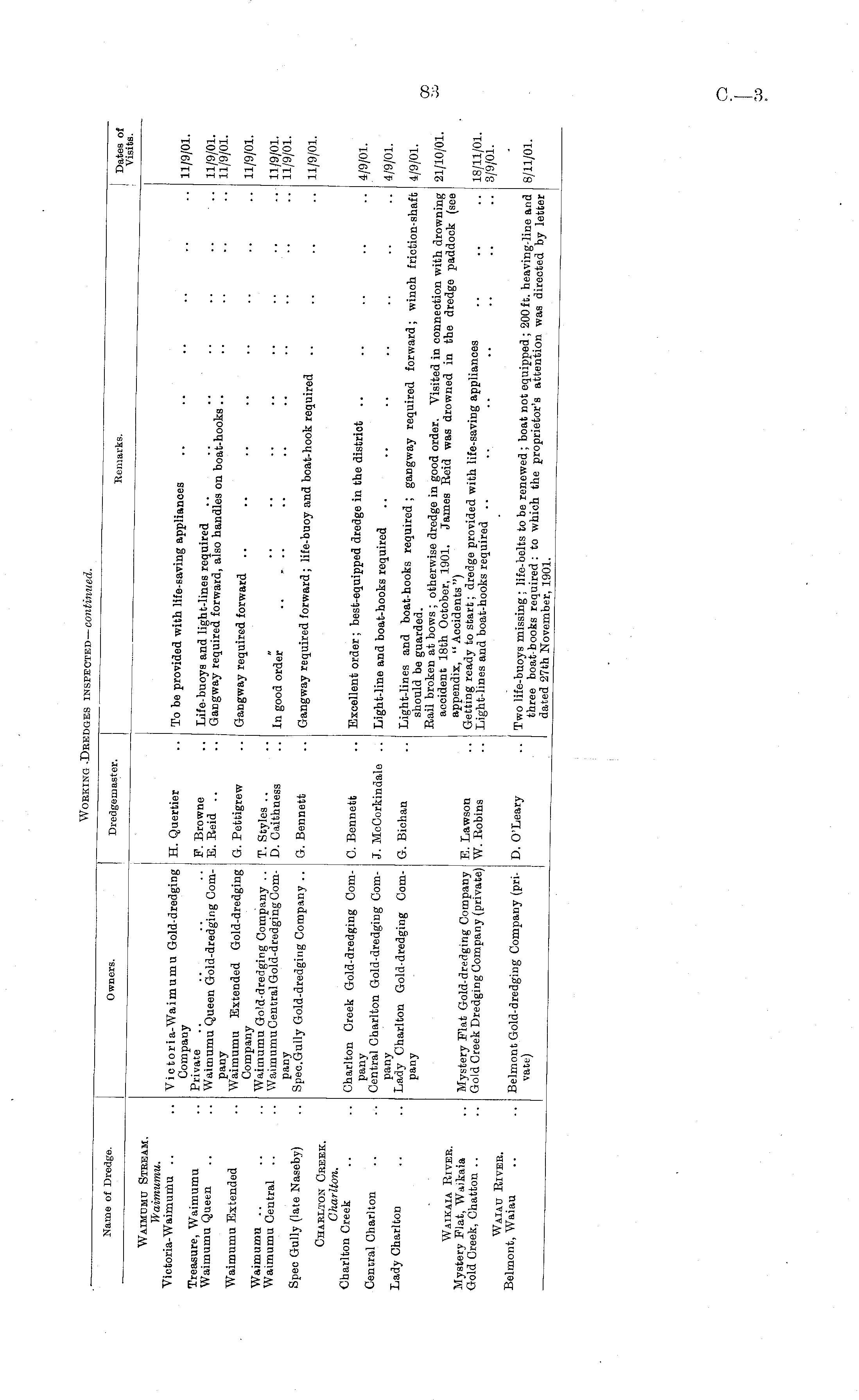 Name of Dredge. Owners. Bredgemaster. Dates of Visits. Remarks. Waimumu Stream, Victoria-Waimumu .. Treasure, Waimumu Waimumu Queen Waimumu Extended Viotoria-Waimumu Gold-dredging Company Private Waimumu Queen Gold-dredging Company Waimumu Extended Gold-dredging Company Waimumu Gold-dredging Company Waimumu Central Gold-dredging ComH. Quertier F. Browne E.Reid .. To be provided with life-saving appliances Life-buoys and light-lines required Gangway required forward, also handles on boat-hooks .. .. " 11/9/01. 11/9/01. 11/9/01. G. Pettigrew Gangway required forward .. 11/9/01. Waimumu Waimumu Central .. T. Styles .. D. Caithness In good order .. .. .' 11/9/01. 11/9/01. Spec Gully (late Naseby) pany Spec.Gully Gold-dredging Company .. G. Bennett Gangway required forward; life-buoy and boat-hook required Chablton Cbeek. Charlton Creek 11/9/01. Charlton Creek Gold-dredging Company Central Charlton Gold-dredging ComC. Bennett Excellent order; best-equipped dredge in the district 4/9/01. Central Charl ton J. McCorkindale .. Light-line and boat-hooks required Lady Charlton pany Lady Charlton Gold-dredging Company 4/9/01. G. Biehan Li sl h o t uld ne begua d rde b d Oat " hOOkS reqUired ; re 1 uired ' winoh friction- shaft Ba al 1 oi > d r^ D 1 th°n V dr T dge " g0 ° d 0rd6r - Visited in with drowning a^eldix, 1 'Accent"'') ° ™ * Padd °° k ( Se " Getting ready to start; dredge provided with life-saving appliances Light-lines and boat-hooks required 4/9/01. Waikaia Rives. Mystery Plat, Waikaia Gold Creek, Chatton .. Mystery Plat Gold-dredging Company Gold Creek Dredging Company (private) E. Lawson W. Robins 21/10/01. 18/11/01. 3/9/01. Waiau Riveb. Belmont, Waiau Belmont Gold-dredging Company (private) D. O'Leary Two life-buoys missing ; life-belts to be renewed ; boat not equipped ; 200ft. heaving-line and t:Zm^:tLiTi9oi. t0 the proprietor ' s attention was directed by ietter 8/11/01.