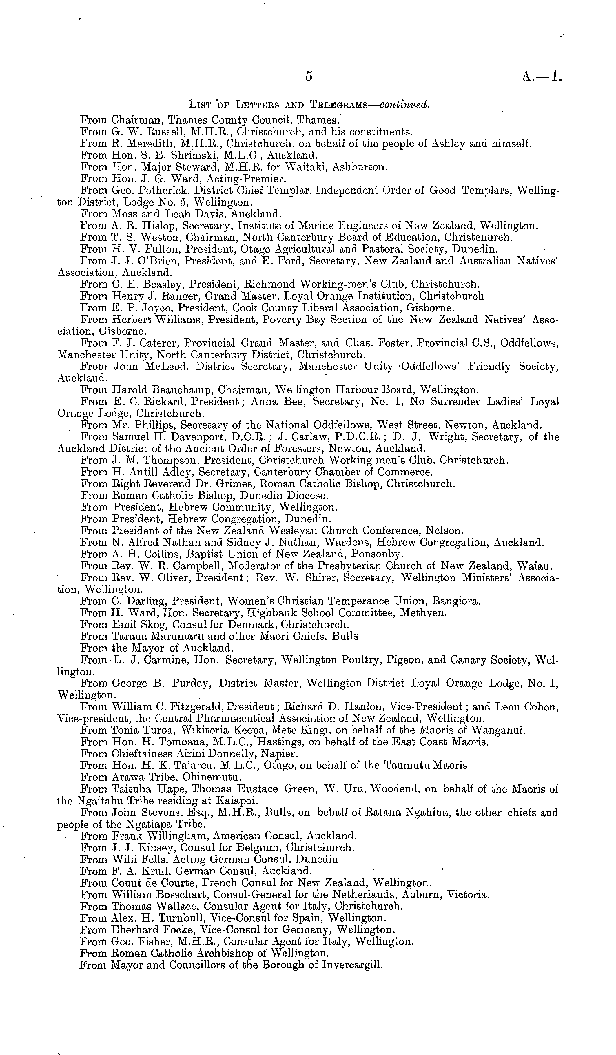 List of Letters and Telegrams— continued. From Chairman, Thames County Council, Thames. From G. W. Bussell, M.H.8., Christchurch, and his constituents. From R. Meredith, M.H.R., Christchurch, on behalf of the people of Ashley and himself. From Hon. S. B. Shrimski, M.L.C., Auckland. From Hon. Major Steward, M.H.B. for Waitaki, Ashburton. From Hon. J. G. Ward, Acting-Premier. From Geo. Petherick, District Chief Templar, Independent Order of Good Templars, Wellington District, Lodge No. 5, Wellington. From Moss and Leah Davis, Auckland. From A. R. Hislop, Secretary, Institute of Marine Engineers of New Zealand, Wellington. From T. S. Weston, Chairman, North Canterbury Board of Education, Christchurch. From H. V. Fulton, President, Otago Agricultural and Pastoral Society, Dunedin. From J. J. O'Brien, President, and E. Ford, Secretary, New Zealand and Australian Natives' Association, Auckland. From C. E. Beasley, President, Richmond Working-men's Club, Christchurch. From Henry J. Ranger, Grand Master, Loyal Orange Institution, Christchurch. From E. P. Joyce, President, Cook County Liberal Association, Gisborne. From Herbert Williams, President, Poverty Bay Section of the New Zealand Natives' Association, Gisborne. From F. J. Caterer, Provincial Grand Master, and Chas. Foster, Provincial C.S., Oddfellows, Manchester Unity, North Canterbury District, Christchurch. From John McLeod, District Secretary, Manchester Unity Oddfellows' Friendly Society, Auckland. From Harold Beauchamp, Chairman, Wellington Harbour Board, Wellington. From E. C. Rickard, President; Anna Bee, Secretary, No. 1, No Surrender Ladies' Loyal Orange Lodge, Christchurch. From Mr. Phillips, Secretary of the National Oddfellows, West Street, Newton, Auckland. From Samuel H. Davenport, D.C.R.; J. Carlaw, P.D.C.R.; D. J. Wright, Secretary, of the Auckland District of the Ancient Order of Foresters, Newton, Auckland. From J. M. Thompson, President, Christchurch Working-men's Club, Christchurch. From H. Antill Adley, Secretary, Canterbury Chamber of Commerce. From Right Reverend Dr. Grimes, Roman Catholic Bishop, Christchurch. From Roman Catholic Bishop, Dunedin Diocese. From President, Hebrew Community, Wellington. From President, Hebrew Congregation, Dunedin. From President of the New Zealand Wesleyan Church Conference, Nelson. From N. Alfred Nathan and Sidney J. Nathan, Wardens, Hebrew Congregation, Auckland. From A. H. Collins, Baptist Union of New Zealand, Ponsonby. From Rev. W. R. Campbell, Moderator of the Presbyterian Church of New Zealand, Waiau. From Rev. W. Oliver, President; Rev. W. Shirer, Secretary, Wellington Ministers' Association, Wellington. From C. Darling, President, Women's Christian Temperance Union, Rangiora. From H. Ward, Hon. Secretary, Highbank School Committee, Methven. From Emil Skog, Consul for Denmark, Christchurch. From Taraua Marumaru and other Maori Chiefs, Bulls. From the Mayor of Auckland. From L. J. Carmine, Hon. Secretary, Wellington Poultry, Pigeon, and Canary Society, Wellington. From George B. Purdey, District Master, Wellington District Loyal Orange Lodge, No. 1, Wellington. From William C. Fitzgerald, President; Richard D. Hanlon, Vice-President; and Leon Cohen, Vice-president, the Central Pharmaceutical Association of New Zealand, Wellington. From Tonia Turoa, Wikitoria Keepa, Mete Kingi, on behalf of the Maoris of Wanganui. From Hon. H. Tomoana, M.L.C., Hastings, on behalf of the East Coast Maoris. From Chieftainess Airini Donnelly, Napier. From Hon. H. K. Taiaroa, M.L.C., Otago, on behalf of the Taumutu Maoris. From Arawa Tribe, Ohinemutu. From Taituha Hape, Thomas Eustace Green, W. Uru, Woodend, on behalf of the Maoris of the Ngaitahu Tribe residing at Kaiapoi. From John Stevens, Esq., M.H.R., Bulls, on behalf of Ratana Ngahina, the other chiefs and people of the Ngatiapa Tribe. From Frank Willingham, American Consul, Auckland. From J. J. Kinsey, Consul for Belgium, Christchurch. From Willi Fells, Acting German Consul, Dunedin. From F. A. Krull, German Consul, Auckland. From Count de Courte, French Consul for New Zealand, Wellington. From William Bosschart, Consul-General for the Netherlands, Auburn, Victoria. From Thomas Wallace, Consular Agent for Italy, Christchurch. From Alex. H. Turnbull, Vice-Consul for Spain, Wellington. From Eberhard Focke, Vice-Consul for Germany, Wellington. From Geo. Fisher, M.H.R., Consular Agent for Italy, Wellington. From Roman Catholic Archbishop of Wellington. From Mayor and Councillors of the Borough of Invercargill.