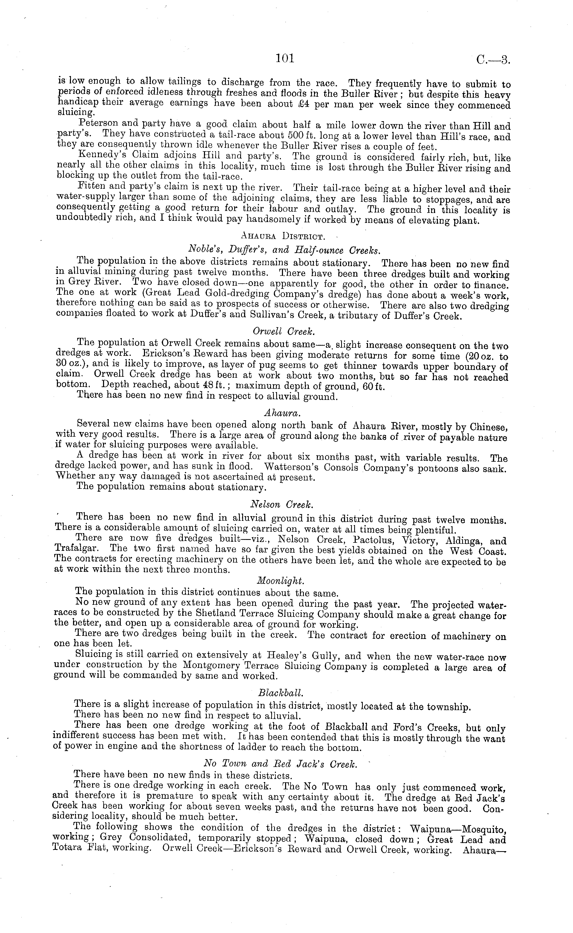 is low enough to allow tailings to discharge from the race. They frequently have to submit to periods of enforced idleness through freshes and floods in the Buller River ; but despite this heavy handicap their average earnings have been about £4 per man per week since they commenced sluicing. Peterson and party have a good claim about half a mile lower down the river than Hill and party's. They have constructed a tail-race about 500 ft. long at a lower level than Hill's race, and they are consequently thrown idle whenever the Buller Eiver rises a couple of feet. Kennedy's Claim adjoins Hill and party's. The ground is considered fairly rich, but, like nearly all the other claims in this locality, much time is lost through the Buller Eiver rising and blocking up the outlet from the tail-race. Fitten and party's claim is next up the river. Their tail-race being at a higher level and their water-supply larger than some of the adjoining claims, they are less liable to stoppages, and are consequently getting a good return for their labour and outlay. The ground in this locality is undoubtedly rich, and I think would pay handsomely if worked by means of elevating plant. Ahadba Distbict. Noble's, Duffer's, and Half-ounce Creeks. The population in the above districts remains about stationary. There has been no new find in alluvial mining during past twelve months. There have been three dredges built and working m Grey Eiver. Two have closed down—one apparently for good, the other in order to finance. The one at work (Great Lead Gold-dredging Company's dredge) has done about a week's work, therefore nothing can be said as to prospects of success or otherwise. There are also two dredging companies floated to work at Duffer's and Sullivan's Creek, a tributary of Duffer's Creek. Orwell Creek. The population at Orwell Creek remains about same—a. slight increase consequent on the two dredges at work. Erickson's Eeward has been giving moderate returns for some time (20 oz. to 30 oz.), and is likely to improve, as layer of pug seems to get thinner towards upper boundary of claim. Orwell Creek dredge has been at work about two months, but so far has not reached bottom. Depth reached, about 48 ft.; maximum depth of ground, 60 ft. There has been no new find in respect to alluvial ground. Ahaura. Several new claims have been opened along north bank of Ahaura Eiver, mostly by Chinese, with very good results. There is a large area of ground along the banks of river of payable nature if water for sluicing purposes were available. A dredge has been at work in river for about six months past, with variable results. The dredge lacked power, and has sunk in flood. Watterson's Consols Company's pontoons also sank. Whether any way damaged is not ascertained at present. The population remains about stationary. Nelson Creek. There has been no new find in alluvial ground in this district during past twelve months. There is a considerable amount of sluicing carried on, water at all times being plentiful. There are now five dredges built—viz., Nelson Creek, Pactolus, Victory, Aldinga, and Trafalgar. The two first named have so far given the best yields obtained on the West Coast. The contracts for erecting machinery on the others have been let, and the whole are expected to be at work within the next three months. Moonlight. The population in this district continues about the same. No new ground of any extent has been opened during the past year. The projected waterraces to be constructed by the Shetland Terrace Sluicing Company should make a great change for the better, and open up a considerable area of ground for working. There are two dredges being built in the creek. The contract for erection of machinery on one has been let. Sluicing is still carried on extensively at Healey's Gully, and when the new water-race now under construction by the Montgomery Terrace Sluicing Company is completed a large area of ground will be commanded by same and worked. Blackball. There is a slight increase of population in this district, mostly located at the township. There has been no new find in respect to alluvial. There has been one dredge working at the foot of Blackball and Ford's Creeks, but only indifferent success has been met with. It has been contended that this is mostly through the want of power in engine and the shortness of ladder to reach the bottom. No Town and Bed Jack's Creek. There have been no new finds in these districts. There is one dredge working in each creek. The No Town has only just commenced work, and therefore it is premature to speak with any certainty about it. The dredge at Red Jack's Creek has been working for about seven weeks past, and the returns have not been good. Considering locality, should be much better. The following shows the condition of the dredges in the district : Waipuna—Mosquito, working; Grey Consolidated, temporarily stopped; Waipuna, closed down; Great Lead and Totara Flat, working. Orwell Creek—Erickson's Reward and Orwell Creek, working. Ahaura—