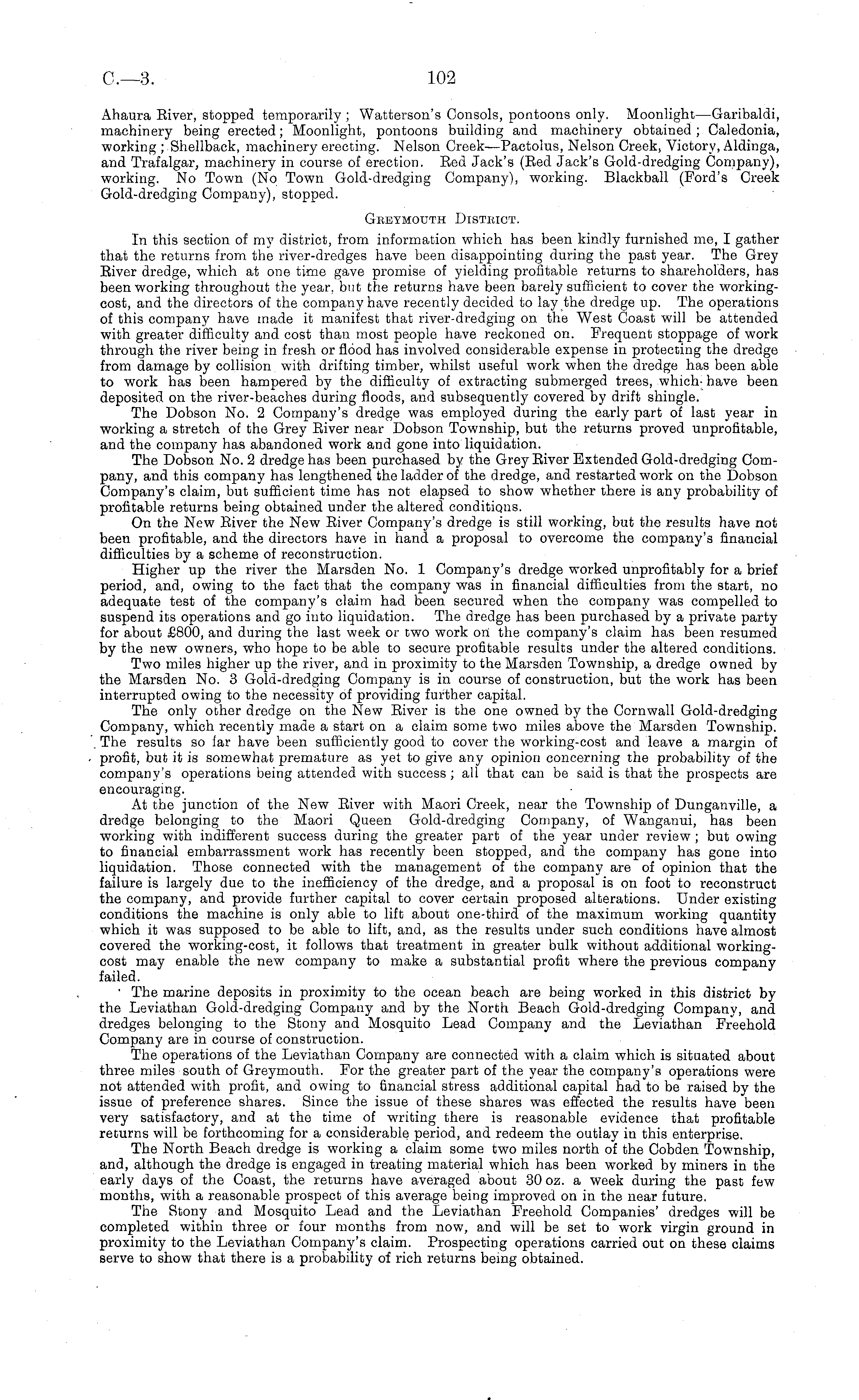 Ahaura Eiver, stopped temporarily ; Watterson's Consols, pontoons only. Moonlight—Garibaldi, machinery being erected; Moonlight, pontoons building and machinery obtained ; Caledonia, working ; Shellback, machinery erecting. Nelson Creek—Pactolus, Nelson Creek, Victory, Aldinga, and Trafalgar, machinery in course of erection. Eed Jack's (Bed Jack's Gold-dredging Company), working. No Town (No Town Gold-dredging Company), working. Blackball (Ford's Creek Gold-dredging Company), stopped. Geeymouth Distmct. In this section of my district, from information which has been kindly furnished me, I gather that the returns from the river-dredges have been disappointing during the past year. The Grey Eiver dredge, which at one time gave promise of yielding profitable returns to shareholders, has been working throughout the year, but the returns have been barely sufficient to cover the workingcost, and the directors of the company have recently decided to lay the dredge up. The operations of this company have made it manifest that river-dredging on the West Coast will be attended with greater difficulty and cost than most people have reckoned on. Frequent stoppage of work through the river being in fresh or flood has involved considerable expense in protecting the dredge from damage by collision with drifting timber, whilst useful work when the dredge has been able to work has been hampered by the difficulty of extracting submerged trees, which- have been deposited on the river-beaches during floods, and subsequently covered by drift shingle. The Dobson No. 2 Company's dredge was employed during the early part of last year in working a stretch of the Grey Eiver near Dobson Township, but the returns proved unprofitable, and the company has abandoned work and gone into liquidation. The Dobson No. 2 dredge has been purchased by the Grey Eiver Extended Gold-dredging Company, and this company has lengthened the ladder of the dredge, and restarted work on the Dobson Company's claim, but sufficient time has not elapsed to show whether there is any probability of profitable returns being obtained under the altered conditions. On the New Eiver the New Eiver Company's dredge is still working, but the results have not been profitable, and the directors have in hand a proposal to overcome the company's financial difficulties by a scheme of reconstruction. Higher up the river the Marsden No. 1 Company's dredge worked unprofitably for a brief period, and, owing to the fact that the company was in financial difficulties from the start, no adequate test of the company's claim had been secured when the company was compelled to suspend its operations and go into liquidation. The dredge has been purchased by a private party for about £800, and during the last week or two work on the company's claim has been resumed by the new owners, who hope to be able to secure profitable results under the altered conditions. Two miles higher up the river, and in proximity to the Marsden Township, a dredge owned by the Marsden No. 3 Gold-dredging Company is in course of construction, but the work has been interrupted owing to the necessity of providing further capital. The only other dredge on the New Eiver is the one owned by the Cornwall Gold-dredging Company, which recently made a start on a claim some two miles above the Marsden Township. The results so far have been sufficiently good to cover the working-cost and leave a margin of profit, but it is somewhat premature as yet to give any opinion concerning the probability of the company's operations being attended with success ; all that can be said is that the prospects are encouraging. At the junction of the New Eiver with Maori Creek, near the Township of Dunganville, a dredge belonging to the Maori Queen Gold-dredging Company, of Wanganui, has been working with indifferent success during the greater part of the year under review ; but owing to financial embarrassment work has recently been stopped, and the company has gone into liquidation. Those connected with the management of the company are of opinion that the failure is largely due to the inefficiency of the dredge, and a proposal is on foot to reconstruct the company, and provide further capital to cover certain proposed alterations. Under existing conditions the machine is only able to lift about one-third of the maximum working quantity which it was supposed to be able to lift, and, as the results under such conditions have almost covered the working-cost, it follows that treatment in greater bulk without additional workingcost may enable the new company to make a substantial profit where the previous company failed. The marine deposits in proximity to the ocean beach are being worked in this district by the Leviathan Gold-dredging Company and by the North Beach Gold-dredging Company, and dredges belonging to the Stony and Mosquito Lead Company and the Leviathan Freehold Company are in course of construction. The operations of the Leviathan Company are connected with a claim which is situated about three miles south of Greymouth. For the greater part of the year the company's operations were not attended with profit, and owing to financial stress additional capital had to be raised by the issue of preference shares. Since the issue of these shares was effected the results have been very satisfactory, and at the time of writing there is reasonable evidence that profitable returns will be forthcoming for a considerable period, and redeem the outlay in this enterprise. The North Beach dredge is working a claim some two miles north of the Cobden Township, and, although the dredge is engaged in treating material which has been worked by miners in the early days of the Coast, the returns have averaged about 30 oz. a week during the past few months, with a reasonable prospect of this average being improved on in the near future. The Stony and Mosquito Lead and the Leviathan Freehold Companies' dredges will be completed w