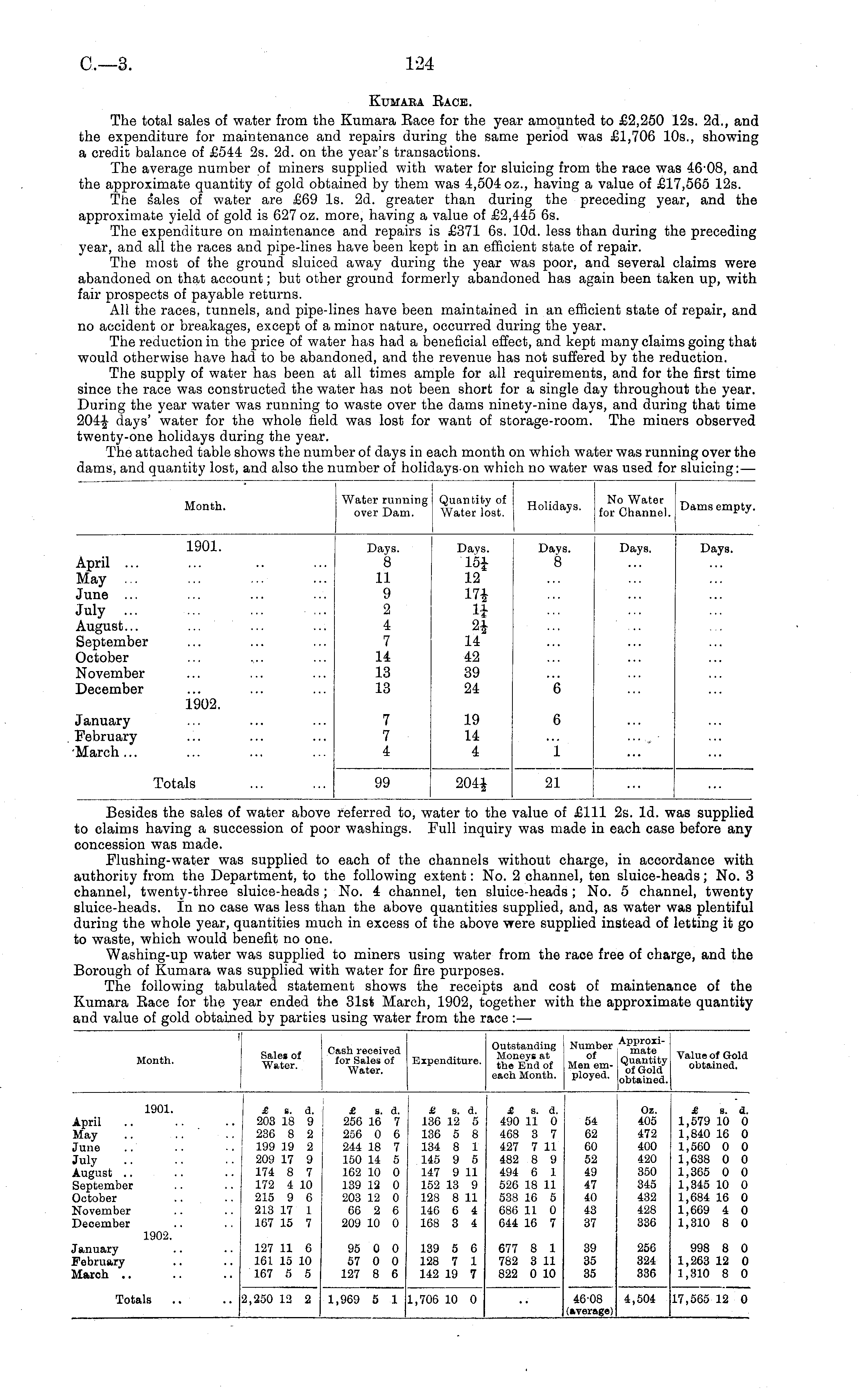 Besides the sales of water above referred to, water to the value of £111 2s. Id. was supplied to claims having a succession of poor washings. Full inquiry was made in each case before any concession was made. Flushing-water was supplied to each of the channels without charge, in accordance with authority from the Department, to the following extent: No. 2 channel, ten sluice-heads; No. 3 channel, twenty-three sluice-heads; No. 4 channel, ten sluice-heads ; No. 5 channel, twenty sluice-heads. In no case was less than the above quantities supplied, and, as water was plentiful during the whole year, quantities much in excess of the above were supplied instead of letting it go to waste, which would benefit no one. Washing-up water was supplied to miners using water from the race free of charge, and the Borough of Kumara was supplied with water for fire purposes. The following tabulated statement shows the receipts and cost of maintenance of the Kumara Eace for the year ended the 31st March, 1902, together with the approximate quantity and value of gold obtained by parties using water from the race : —