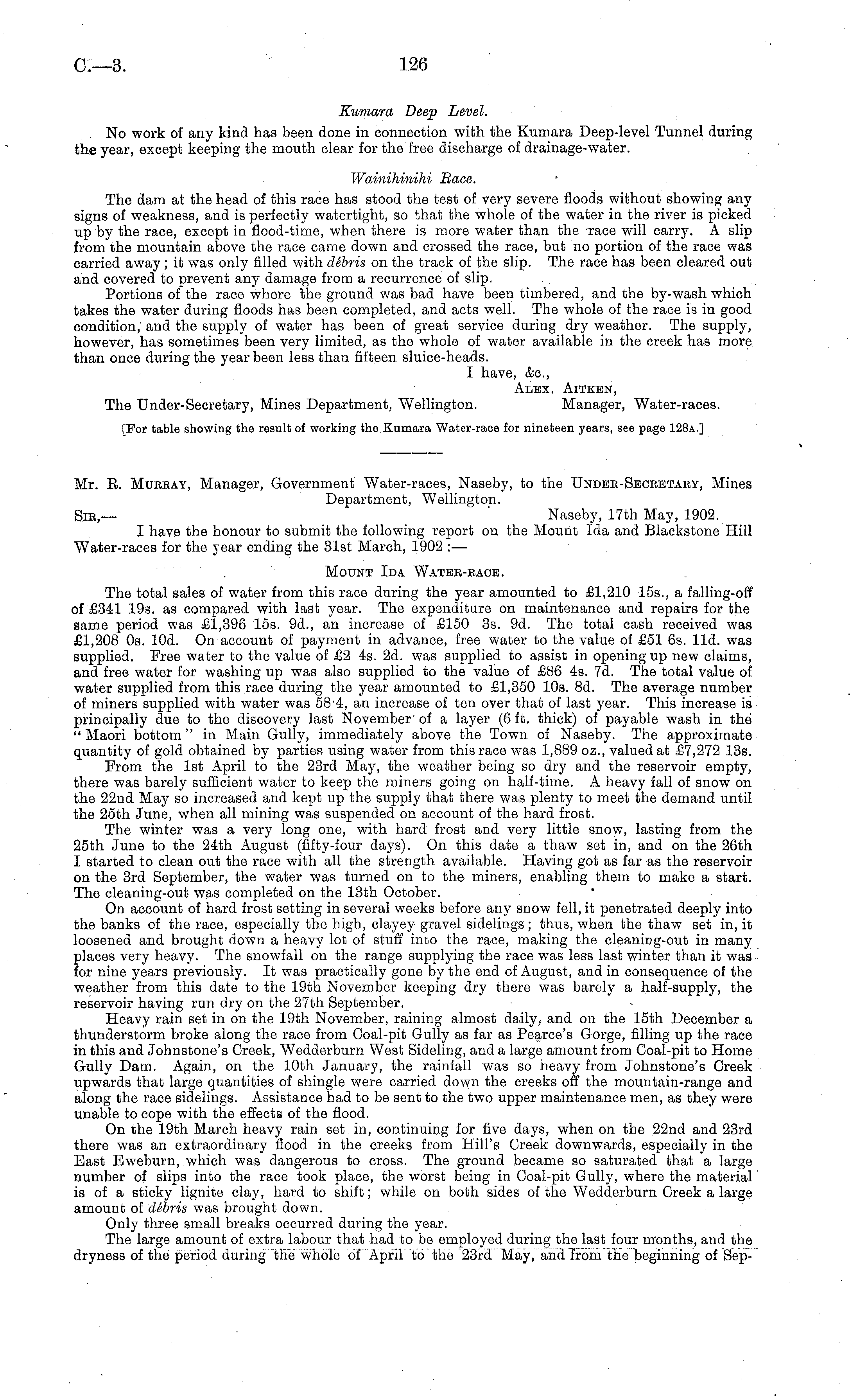 Kumara Deep Level. No work of any kind has been done in connection with the Kumara Deep-level Tunnel during the year, except keeping the mouth clear for the free discharge of drainage-water. Wainihinihi Race. The dam at the head of this race has stood the test of very severe floods without showing any signs of weakness, and is perfectly watertight, so that the whole of the water in the river is picked up by the race, except in flood-time, when there is more water than the race will carry. A slip from the mountain above the race came down and crossed the race, but no portion of the race was carried away; it was only filled with debris on the track of the slip. The race has been cleared out and covered to prevent any damage from a recurrence of slip. Portions of the race where the ground was bad have been timbered, and the by-wash which takes the water during floods has been completed, and acts well. The whole of the race is in good condition, and the supply of water has been of great service during dry weather. The supply, however, has sometimes been very limited, as the whole of water available in the creek has more than once during the year been less than fifteen sluice-heads. I have, &c, Alex. Aitken, The Under-Secretary, Mines Department, Wellington. Manager, Water-races. [For table showing the result of working the Kumara Water-race for nineteen years, see page 128 a.]