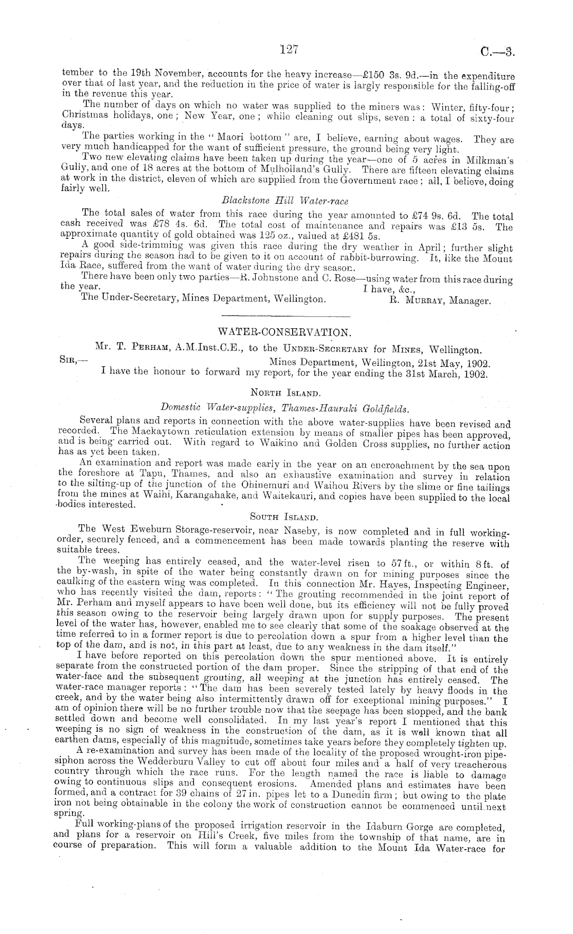 WATEB-CONSEBVATION. Mr. T. Pbrham, A.M. Inst. C.E., to the Under-Seceetaey for Mines, Wellington. SlB >— Mines Department, Wellington, 21st May, 1902. I have the honour to forward my report, for the year ending the 31st March, 1902. Noeth Island. Domestic Water-supplies, Thames-Hauraki Goldfields. Several plans and reports in connection with the above water-supplies have been revised and recorded. The Mackaycown reticulation extension by means of smaller pipes has been approved and is being carried out. With regard to Waikino and Golden Cross supplies, no further action has as yet been taken. An examination and report was made early in the year on an encroachment by the sea upon the foreshore at Tapu, Thames, and also an exhaustive examination and survey in relation to the silting-up of the junction of the Ohinemuri and Waihou Eivers by the slime or fine tailings from the mines at Waihi, Karangahake, and Waitekauri, and copies have been supplied to the local •bodies interested. South Island. The West Eweburn Storage-reservoir, near Naseby, is now completed and in full workingorder, securely fenced, and a commencement has been made towards planting the reserve with suitable trees. The weeping has entirely ceased, and the water-level risen to 57 ft., or within 8 ft. of the by-wash, in spite of the water being constantly drawn on for mining purposes since the caulking of the eastern wing was completed. In this connection Mr. Hayes, Inspecting Engineer who has recently visited the dam, reports : " The grouting recommended in the joint report of Mr. Perham and myself appears to have been well done, but its efficiency will not be fully proved this season owing to the reservoir being largely drawn upon for supply purposes. The present level of the water has, however, enabled me to see clearly that some of the soakage observed at the time referred to in a former report is due to percolation down a spur from a higher level than the top of the dam, and is not, in this part at least, due to any weakness in the dam itself." I have before reported on this percolation down the spur mentioned above. It is entirely separate from the constructed portion of the dam proper. Since the stripping of that end of the water-face and the subsequent grouting, all weeping at the junction has entirely ceased. The water-race manager reports : "The dam has been severely tested lately by heavy floods in the creek, and by the water being also intermittently drawn off for exceptional mining purposes." I am of opinion there will be no further trouble now that the seepage has been stopped, and the bank settled down and become well consolidated. In my last year's report I mentioned that this weeping is no sign of weakness in the construction of the dam, as it is well known that all earthen dams, especially of this magnitude, sometimes take years before they completely tighten up. A re-examination and survey has been made of the locality of the proposed wrought-fron pipesiphon across the Wedderburn Valley to cut off about four miles and a half of very treacherous country through which the race runs. For the length named the race is liable to damage owing to continuous slips and consequent erosions. Amended plans and estimates have been formed, and a contract for 39 chains of 27 in. pipes let to a Dunedin firm; but owing to the plate iron not being obtainable in the colony the work of construction cannot be commenced until next spring. Pull working-plans of the proposed irrigation reservoir in the Idaburn Gorge are completed and plans for a reservoir on Hill's Creek, five miles from the township of that name, are in course of preparation. This will form a valuable addition to the Mount Ida Water-race for
