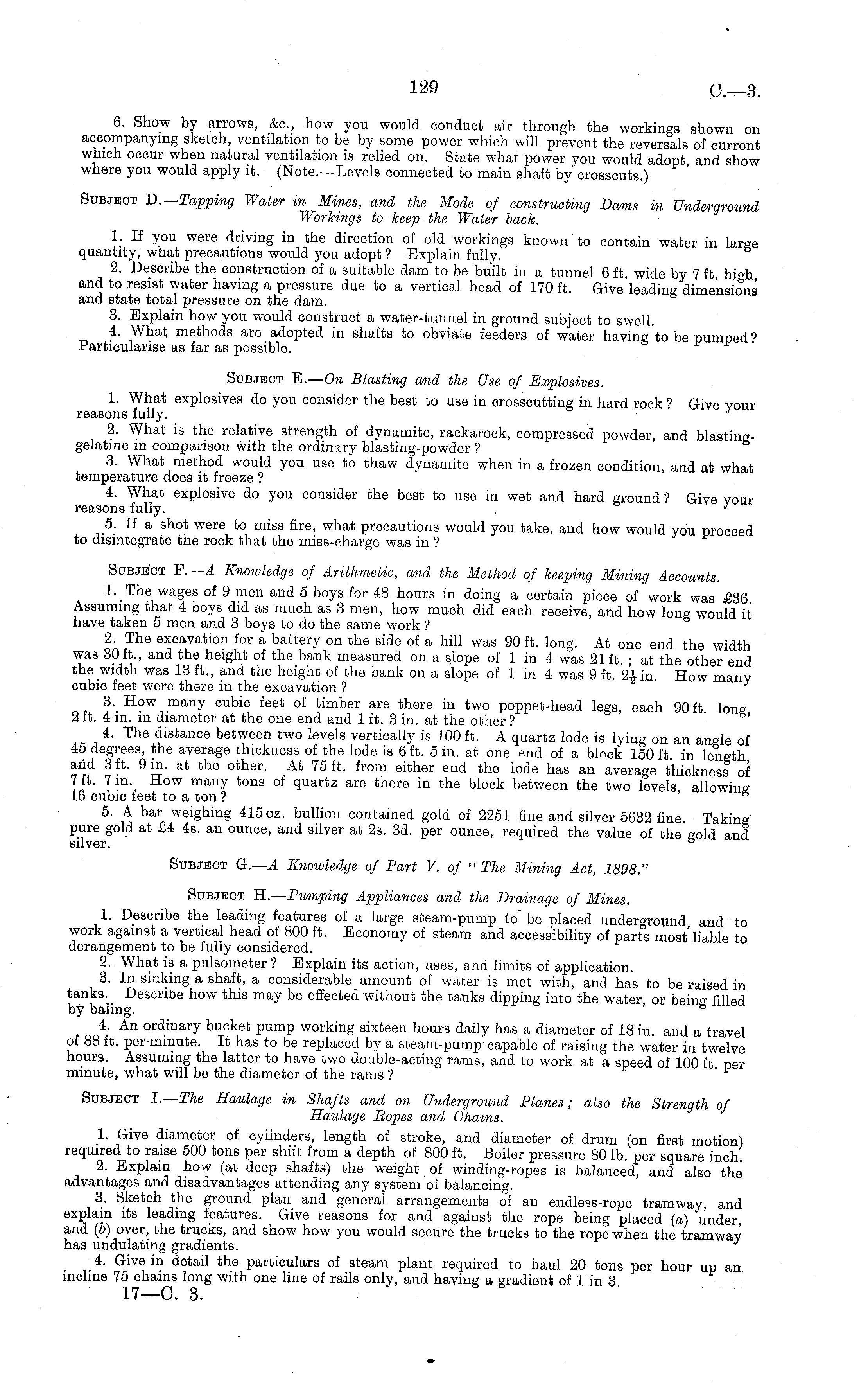 6. Show by arrows, &c, how you would conduct air through the workings shown on accompanying sketch, ventilation to be by some power which will prevent the reversals of current which occur when natural ventilation is relied on. State what power you would adopt and show where you would apply it. (Note.—Levels connected to main shaft by crosscuts.) Subject D.— Tapping Water in Mines, and the Mode of constructing Dams in Underground Workings to keep the Water back. 1. If you were driving in the direction of old workings known to contain water in large quantity, what precautions would you adopt ? Explain fully. 2. Describe the construction of a suitable dam to be built in a tunnel 6ft wide by 7ft high and to resist water having a pressure due to a vertical head of 170 ft. Give leading dimensions and state total pressure on the dam. 3. Explain how you would construct a water-tunnel in ground subject to swell. 4. What methods are adopted in shafts to obviate feeders of water having to be pumped ? Particularise as far as possible. Subject E. — On Blasting and the Use of Explosives. 1. What explosives do you consider the best to use in crosscutting in hard rock ? Give your reasons fully. •' 2. What is the relative strength of dynamite, rackarock, compressed powder, and blastinggelatine in comparison with the ordinary blasting-powder ? 3. What method would you use to thaw dynamite when in a frozen condition, and at what temperature does it freeze ? 4. What explosive do you consider the best to use in wet and hard ground ? Give your reasons fully. J 5. If a shot were to miss fire, what precautions would you take, and how would you proceed to disintegrate the rock that the miss-charge was in ? Subject F.—A Knowledge of Arithmetic, and the Method of keeping Mining Accounts. 1. The wages of 9 men and 5 boys for 48 hours in doing a certain piece of work was £36 Assuming that 4 boys did as much as 3 men, how much did each receive, and how lons would it have taken 5 men and 3 boys to do the same work ? 2. The excavation for a battery on the side of a hill was 90 ft. long. At one end the width was 30ft., and the height of the bank measured on a slope of 1 in 4 was 21 ft. ; at the other end the width was 13 ft., and the height of the bank on a slope of lin 4 was 9 ft. 2iin How many cubic feet were there in the excavation ? ' 3. How many cubic feet of timber are there in two poppet-head legs, each 90 ft lon» 2 ft. 4 m. m diameter at the one end and 1 ft. 3 in. at the other ? 4. The distance between two levels vertically is 100 ft. A quartz lode is lying on an angle of 45 degrees, the average thickness of the lode is 6 ft. 5 in. at one end of a block 150 ft in length arid 3 ft. 9 in. at the other. At 75 ft. from either end the lode has an average thickness of 7 it. 7 in. How many tons of quartz are there in the block between the two levels allowing 16 cubic feet to a ton ? 5. A bar weighing 415 oz. bullion contained gold of 2251 fine and silver 5632 fine Taking pure gold at £4 4s. an ounce, and silver at 2s. 3d. per ounce, required the value of the gold and silver. ° Subject G.— A Knowledge of Part V. of " The Mining Act, 1898." Subject H.— Pumping Appliances and the Drainage of Mines. 1. Describe the leading features of a large steam-pump to" be placed underground and to work against a vertical head of 800 ft. Economy of steam and accessibility of parts most'liable to derangement to be fully considered. 2. What is a pulsometer ? Explain its action, uses, and limits of application. 3. In sinking a shaft, a considerable amount of water is met with, and has to be raised in tanks. Describe how this may be effected without the tanks dipping into the water or being filled by baling. ° 4. An ordinary bucket pump working sixteen hours daily has a diameter of 18 in. and a travel of 88 ft. per minute. It has to be replaced by a steam-pump capable of raising the water in twelve hours. Assuming the latter to have two double-acting rams, and to work at a speed of 100 ft per minute, what will be the diameter of the rams ? ' Subject I.—The Haulage in Shafts and on Underground Planes; also the Strength of Haulage Ropes and Chains. 1. Give diameter of cylinders, length of stroke, and diameter of drum (on first motion) required to raise 500 tons per shift from a depth of 800 ft. Boiler pressure 80 lb. per square inch 2. Explain how (at deep shafts) the weight of winding-ropes is balanced, and also the advantages and disadvantages attending any system of balancing. 3. Sketch the ground plan and general arrangements of an endless-rope tramway and explain its leading features. Give reasons for and against the rope being placed (a) under and (b) over, the trucks, and show how you would secure the trucks to the rope when the tramway has undulating gradients. 4. Give in detail the particulars of steam plant required to haul 20 tons per hour up an incline 75 chains long with one line of rails only, and having a gradient of 1 in 3 17—C. 3.