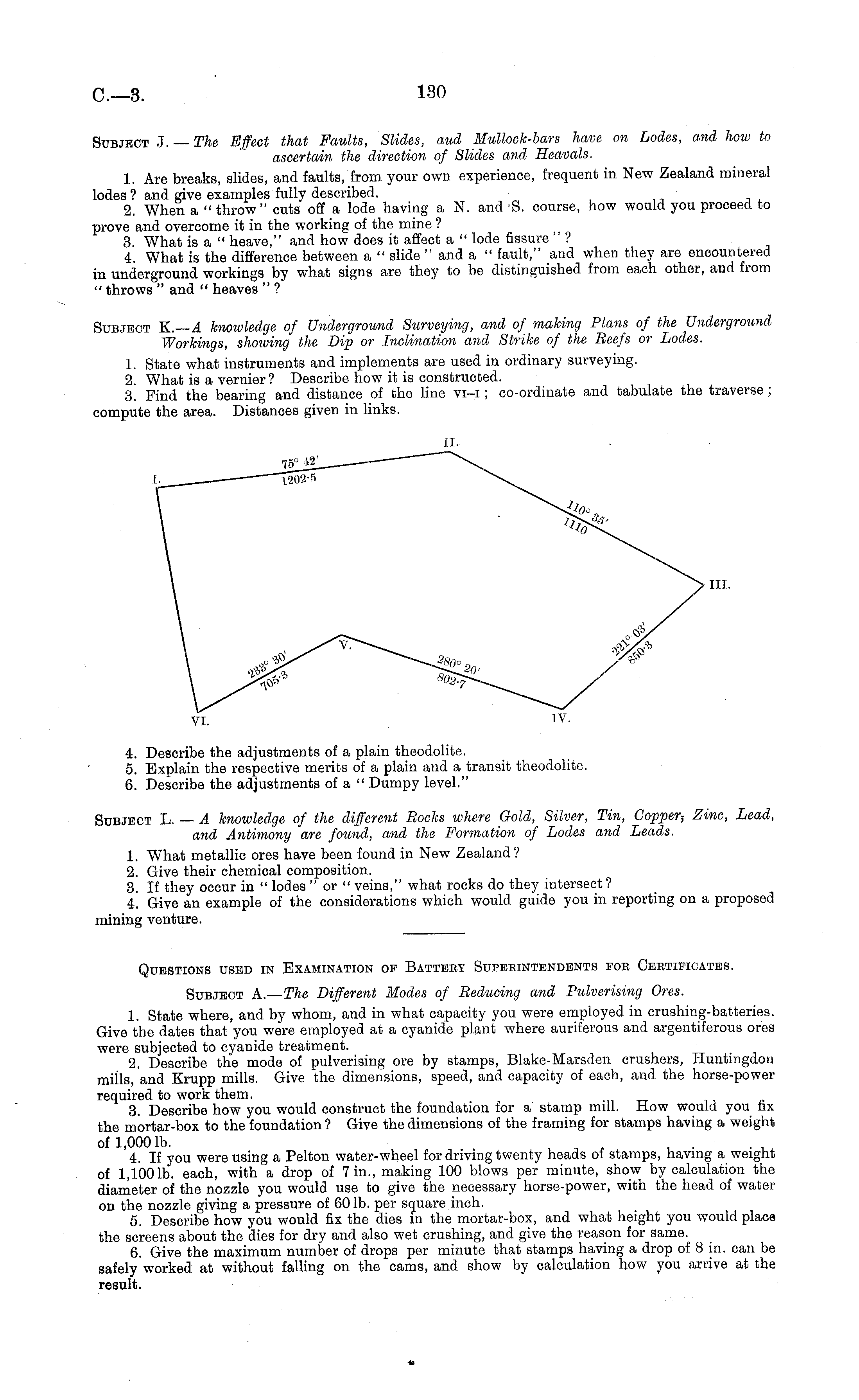 Subject J. — The Effect that Faults, Slides, aud Mullock-bars have on Lodes, and hoiv to ascertain the direction of Slides and Heavals. 1. Are breaks, slides, and faults/from your own experience, frequent in New Zealand mineral lodes ? and give examples fully described. 2. When a " throw" cuts off a lode having a N. and -S. course, how would you proceed to prove and overcome it in the working of the mine ? 3. What is a " heave," and how does it affect a " lode fissure " ? 4. What is the difference between a " slide " and a " fault," and when they are encountered in underground workings by what signs are they to be distinguished from each other, and from " throws " and " heaves " ? Subject X.—A knowledge of Underground Surveying, and of making Plans of the Underground Workings, showing the Dip or Inclination and Strike of the Beefs or Lodes. 1. State what instruments and implements are used in ordinary surveying. 2. What is a vernier ? Describe how it is constructed. 3. Find the bearing and distance of the line vi-i; co-ordinate and tabulate the traverse; compute the area. Distances given in links.