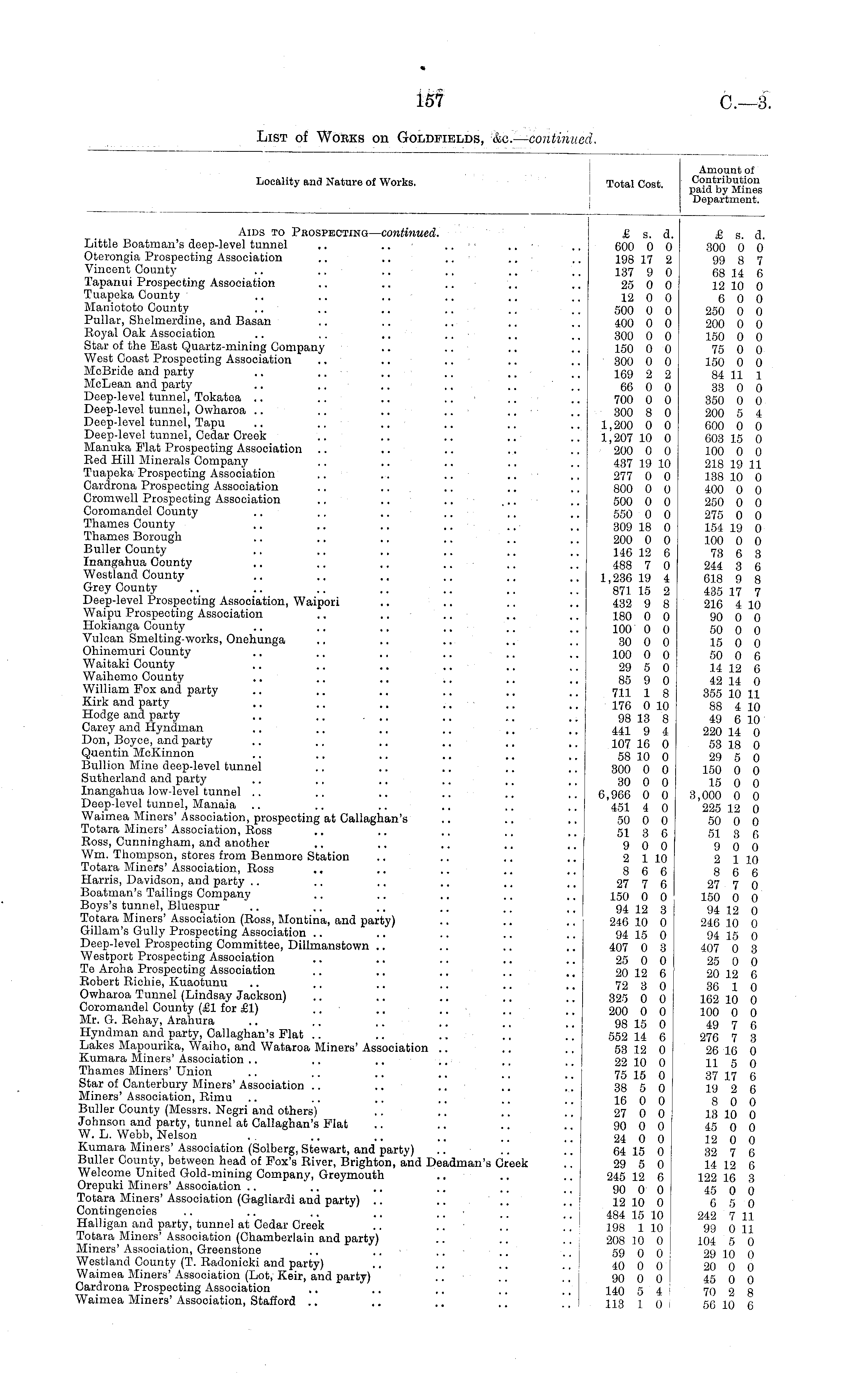 Locality and Nature of Works. Total Cost. Amount of Contribution paid by Mines Department. Aids to Prospecting— continued. Little Boatman's deep-level tunnel .. .. .. • • Oterongia Prospecting Association .. .. .. Vincent County Tapanui Prospecting Association Tuapeka County Maniototo County Pullar, Shelmerdine, and Basan Royal Oak Association Star of the East Quartz-mining Company West Coast Prospecting Association McBride and party McLean and party Deep-level tunnel, Tokatea Deep-level tunnel, Owharoa Deep-level tunnel, Tapu Deep-level tunnel, Cedar Creek Manuka Flat Prospecting Association Red Hill Minerals Company Tuapeka Prospecting Association Cardrona Prospecting Association Cromwell Prospecting Association Coromandel County Thames County Thames Borough Buller County Inangahua County Westland County Grey County Deep-level Prospecting Association, Waipori Waipu Prospecting Association Hokianga County Vulcan Smelting-works, Onehunga Ohinemuri County Waitaki County Waihemo County William Fox and party Kirk and party Hodge and party .. ,. Carey and Hyndman Don, Boyce, and party Quentin McKinnon Bullion Mine deep-level tunnel Sutherland and party Inangahua low-level tunnel Deep-level tunnel, Manaia Waimea Miners' Association, prospecting at Callaghan's Totara Miners'Association, Ross Ross, Cunningham, and another Wm. Thompson, stores from Benmore Station Totara Miners' Association, Ross Harris, Davidson, and party Boatman's Tailings Company Boys's tunnel, Bluespur Totara Miners' Association (Ross, Montina, and party) Gillam's Gully Prospecting Association Deep-level Prospecting Committee, Dillmanstown .. .. Westport Prospecting Association Te Aroha Prospecting Association Robert Richie, Kuaotunu Owharoa Tunnel (Lindsay Jackson) Coromandel County (£1 for £1) Mr. G. Rehay, Arahura Hyndman and party, Callaghan's Flat .. Lakes Mapourika, Waiho, and Wataroa Miners' Association .. Kumara Miners' Association Thames Miners' Union Star of Canterbury Miners' Association Miners' Association, Rimu Buller County (Messrs. Negri and others) Johnson and party, tunnel at Callaghan's Flat W. L. Webb, Nelson Kumara Miners' Association (Solberg, Stewart, and party) Buller County, between head of Fox's River, Brighton, and Deadman's Creek Welcome United Gold-mining Company, Greymouth Orepuki Miners' Association Totara Miners' Association (Gagliardi and party) .. Contingencies .. .. .. ,, Halligan and party, tunnel at Cedar Creek Totara Miners' Association (Chamberlain and party) Miners' Association, Greenstone Westland County (T. Radonicki and party) Waimea Miners' Association (Lot, Keir, and party) Cardrona Prospecting Association Waimea Miners' Association, Stafford •■ J M s. d. 600 0 0 198 17 2 137 9 0 25 0 0 12 0 0 500 0 0 400 0 0 300 0 0 150 0 0 300 0 0 169 2 2 66 0 0 700 0 0 300 8 0 1,200 0 0 1,207 10 0 200 0 0 437 19 10 277 0 0 800 0 0 500 0 0 550 0 0 309 18 0 200 0 0 146 12 6 488 7 0 1,236 19 4 871 15 2 432 9 8 180 0 0 100 0 0 30 0 0 100 0 0 29 5 0 85 9 0 711 1 8 176 0 10 98 13 8 441 9 4 107 16 0 58 10 0 300 0 0 30 0 0 0,960 0 0 451 4 0 50 0 0 51 3 6 9 0 0 2 1 10 8 6 6 27 7 6 150 0 0 94 12 3 246 10 0 94 15 0 407 0 3 25 0 0 20 12 6 72 3 0 325 0 0 200 0 0 98 15 0 552 14 6 53 12 0 22 10 0 I 75 15 0 38 5 0 16 0 0 27 0 0 90 0 0 24 0 0 64 15 0 29 5 0 245 12 6 90 0 0 12 10 0 484 15 10 198 1 10 208 10 0 59 0 0 40 0 0 90 0 0 140 5 4 118 1 0 £ s. d. 300 0 0 99 8 7 68 14 6 12 10 0 6 0 0 250 0 0 200 0 0 150 0 0 75 0 0 150 0 0 84 11 1 33 0 0 350 0 0 200 5 4 600 0 0 603 15 0 100 0 0 218 19 11 138 10 0 400 0 0 250 0 0 275 0 0 154 19 0 100 0 0 73 6 3 244 3 6 618 9 8 435 17 7 216 4 10 90 0 0 50 0 0 15 0 0 50 0 6 14 12 6 42 14 0 355 10 11 88 4 10 49 6 10 220 14 0 53 18 0 29 5 0 150 0 0 15 0 0 3,000 0 0 225 12 0 50 0 0 51 3 6 9 0 0 2 1 10 8 6 6 27 7 0 150 0 0 94 12 0 246 10 0 94 15 0 407 0 3 25 0 0 20 12 6 36 1 0 162 10 0 100 0 0 49 7 6 276 7 3 26 16 0 11 5 0 37 17 6 19 2 6 8 0 0 13 10 0 45 0 0 12 0 0 32 7 6 14 12 6 122 16 3 45 0 0 6 5 0 242 7 11 99 OH 104 5 0 29 10 0 20 0 0 45 0 0 70 2 8 56 10 6