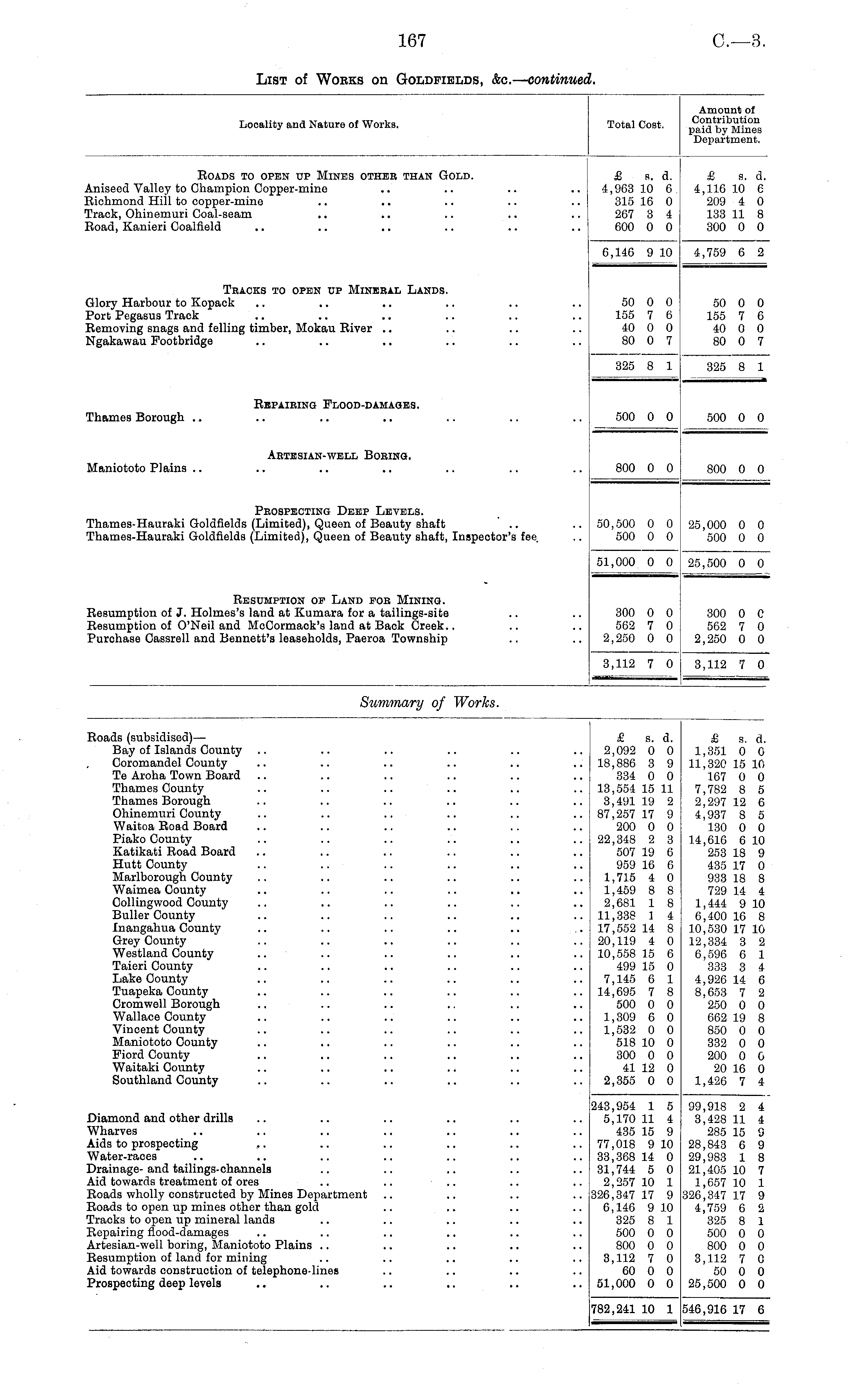 Locality and Nature of Works. Total Cost. Amount of Contribution paid by Mines Department. Roads to open up Mines other than Gold. Aniseed Valley to Champion Copper-mine Richmond Hill to copper-mine Track, Ohinemuri Coal-seam Road, Kanieri Coalfield £ s. d. 4,963 10 6 315 16 0 267 3 4 600 0 0 £ s. d. 4,116 10 e 209 4 0 133 11 8 300 0 0 6,146 9 10 4,759 6 2 Tracks to open up Mineral Lands. Glory Harbour to Kopack Port Pegasus Track Removing snags and felling timber, Mokau River Ngakawau Footbridge 50 0 0 155 7 6 40 0 0 80 0 7 50 0 0 155 7 6 40 0 0 80 0 7 325 8 1 325 8 1 Repairing Flood-damages. Thames Borough 500 0 0 500 0 0 Artesian-well Boring. Maniototo Plains 800 0 0 800 0 0 Prospecting Deep Levels. Thames-Hauraki Goldfields (Limited), Queen of Beauty shaft Thames-Hauraki Goldfields (Limited), Queen of Beauty shaft, Inspector's fee. 50,500 0 0 500 0 0 25,000 0 0 500 0 0 51,000 0 0 25,500 0 0 Resumption op Land for Mining. Resumption of J. Holmes's land at Kumara for a tailings-site Resumption of O'Neil and McCormack's land at Back Creek.. Purchase Cassrell and Bennett's leaseholds, Paeroa Township 300 0 0 562 7 0 2,250 0 0 300 0 C 562 7 0 2,250 0 0 3,112 7 0 3,112 7 0 Summary of Works. Roads (subsidised) — Bay of Islands County Coromandel County Te Aroha Town Board Thames County Thames Borough Ohinemuri County Waitoa Road Board Piako County Katikati Road Board Hutt County Marlborough County Waimea County Collingwood County Buller County Inangahua County Grey County Westland County Taieri County Lake County Tuapeka County Cromwell Borough Wallace County Vincent County Maniototo County Fiord County Waitaki County Southland County £ s. d. 2,092 0 0 18,886 3 9 334 0 0 13,554 15 11 3,491 19 2 87,257 17 9 200 0 0 22,348 2 3 507 19 6 959 16 6 1,715 4 0 1,459 8 8 2,681 1 8 11,338 1 4 17,552 14 8 20,119 4 0 10,558 15 6 499 15 0 7,145 6 1 14,695 7 8 500 0 0 1,309 6 0 1,532 0 0 518 10 0 300 0 0 41 12 0 2,355 0 0 £ s. d. 1,351 0 0 11,320 15 10 167 0 0 7,782 8 5 2,297 12 6 4,937 8 5 130 0 0 14,616 6 10 253 18 9 435 17 0 933 18 8 729 14 4 1,444 9 10 6,400 16 8 10,530 17 10 12,334 3 2 6,596 6 1 333 3 4 4,926 14 6 8,653 7 2 250 0 0 662 19 8 850 0 0 332 0 0 200 0 0 20 16 0 1,426 7 4 Diamond and other drills Wharves Aids to prospecting Water-races Drainage- and tailings-channels Aid towards treatment of ores Roads wholly constructed by Mines Department Roads to open up mines other than gold Tracks to open up mineral lands Repairing flood-damages Artesian-well boring, Maniototo Plains .. Resumption of land for mining Aid towards construction of telephone-lines Prospecting deep levels 243,954 1 5 5,170 11 4 435 15 9 77,018 9 10 33,368 14 0 31,744 5 0 2,257 10 1 326,347 17 9 6,146 9 10 325 8 1 500 0 0 800 0 0 3,112 7 0 60 0 0 51,000 0 0 99,918 2 4 3,428 11 4 285 15 9 28,843 6 9 29,983 1 8 21,405 10 7 1,657 10 1 326,347 17 9 4,759 6 2 325 8 1 500 0 0 800 0 0 3,112 7 0 50 0 0 25,500 0 0 782,241 10 1 546,916 17 6