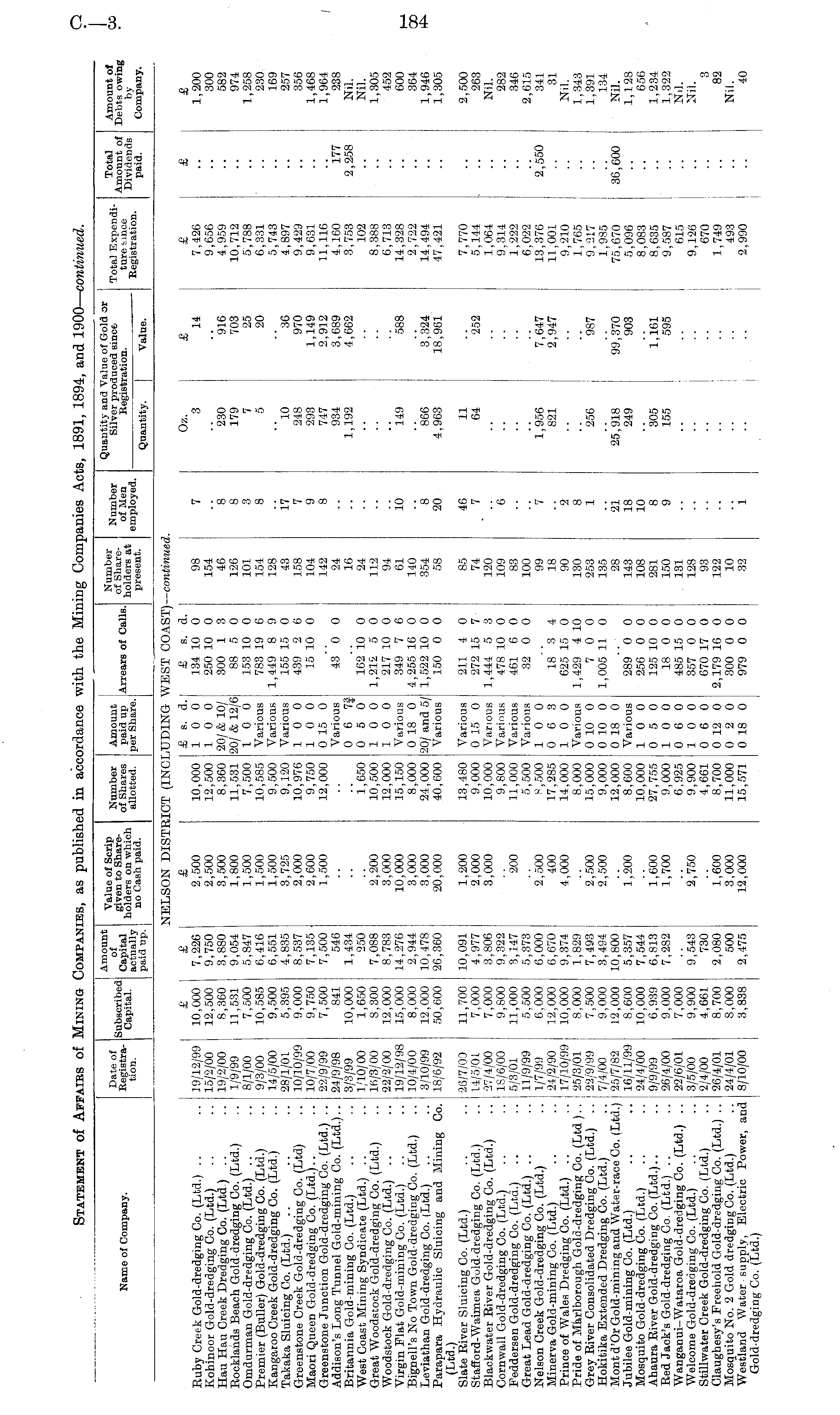 Amount of Capital actually paid up. luantity and Value of GoL Silver produced siuc& Registration. or Name of Company. Date of Registration. Subscribed Capital. Value of Scrip given to Shareholders on which no Cash paid. Number of Shares allotted. Amount paid up Arrears of Calls, per Share. Number of Shareholders at present. Number of Men employed. Total Expenditure f-mce Total Amount of Dividends paid. Amount of Debts owing by Company. Quantity. Value. NELSON DISTRICT (INC: 1 ?EST COAST) — continued. Ruby Creek Gold-dredging Co. (Ltd.) .. Kohinoor Gold-dredging Co. (Ltd.) Hau Hau Creek Dredging Co. (Ltd) .. Rocklands Beach Gold dredging Co. (Ltd.) Omdurman Gold-dredging Co. (Ltd.) Premier (Buller) Gold-dredging Co. (Ltd.) Kangaroo Creek Gold-dredging Co. (Ltd.) Takaka Sluicing Co. (Ltd.) Greenstone Creek Gold-dredging Co. (Ltd) Maori Queen Gold-dredging Co. (Ltd.).. Greenstone Junction Gold-dredging Co. (Ltd.) .. Addison's Long Tunnel Gold-mining Co. (Ltd.).. Britannia Gold -mining Co. (Ltd.) West Coast Mining Syndicate (Ltd.) Great Woodstock Gold-dredging Co. (Ltd.) Woodstock Gold-dredging Co. (Ltd.) Virgin Plat Gold-mining Co. (Ltd.) Bignell's No Town Gold-dredging Co. (Ltd.) Leviathan Gold-dredging Co. (Ltd.) Parapara Hydraulic Sluicing and Mining Co. (Ltd.) Slate River Sluicing Co. (Ltd.) Stafford-Waimea Gold-dredging Co. (Ltd.) Blackwater River Gold-dredging Co. (Ltd.) Cornwall Gold-dredging Co. (Ltd.) Feddersen Gold-dredging Co. (Ltd.) Great Lead Gold-dredging Co. (Ltd.) Nelson Creek Gold-dredging Co. (Ltd.) Minerva Gold-mining Co. (Ltd.) Prince of Wales Dredging Co. (Ltd.) Pride of Marlborough Gold-dredging Co. (Ltd ).. Grey River Consolidated Dredging Co. (Ltd.) Hokitika Extended Dredging Co. (Ltd.) Mont d'Or Gold-mining and Water-race Co. (Ltd.) Jubilee Gold-mining Co. (Ltd.) Mosquito Gold-dredging Co. (Ltd.) Ahaura River Gold-dredging Co. (Ltd.).. Red Jack's Gold-dredging Co. (Ltd.) Wanganui-Wataroa Gold-dredging Co. (Ltd.) .. Welcome Gold-dredging Co. (Ltd.) Stillwater Creek Gold-dredging Co. (Ltd.) Claughesy's Freehold Gold-dredging Co. (Ltd.) .. Mosquito No. 2 Gold dredging Co. (Ltd.) Westland Water supply, Electric Power, and Gold-dredging Co. (Ltd.) 19/12/99 15/2/00 19/2/00 1/9/99 8/1/00 9/3/00 14/5/00 28/1/01 10/10/99 10/7/00 22/9/99 24/9/98 3/3/99 1/10/00 16/3/00 22/2/00 19/12/98 10/4/00 3/10/99 18/6/92 £ 10,000 12,500 8,360 11,531 7,500 10,585 9,500 5,395 9,000 9,750 7,500 841 10,000 1,650 8,300 12,000 15,000 8,000 12,000 50,600 £ 7,226 9,750 3,880 9,054 5,847 6,416 6,551 4,835 8,537 7,135 7,500 546 1,434 250 7,088 8,783 14,276 2,944 10,478 26,360 2,500 10,000 2,500 12,500 3,500 8,360 1,800 11,531 1,500 7,500 1,500 10,585 1,500 9,500 3,725 9,120 2,000 10,976 2,600 9,750 1,500 12,000 £ s. a. I 10 0 10 0 20/ & 10/ 20/ & 12/6 10 0 Various Various Various 10 0 10 0 0 15 0 Various 0 6 7| 0 5 0 10 0 10 0 Various 0 18 0 20/ and 5/j Various £ s. d. P 134 10 0 250 10 0 300 1 3 88 5 0 153 10 0 783 19 6 1,449 8 9 155 15 0 439 2 6 15 10 0 98 154 46 126 101 154 128 43 j 58 104 142 24 16 24 112 94 61 140 354 58 7 8 S 3 8 17 7 9 8 io 20 Oz. 3 230 179 7 5 10 248 293 747 934 1,192 & 14 916 703 25 20 36 970 1,149 2,912 3,689 4,662 £ 7,426 9,656 4,959 10,712 5,788 6,331 5,743 4,897 9,429 9,631 11,116 4,160 3,753 102 8,388 6,713 14,328 2,722 14,494 47,421 £ 'l77 2,258 £ 1,200 300 582 974 1,258 230 169 257 356 1,468 1,964 238 Nil. Nil. 1,305 452 600 364 1,946 1,305 43 0 0 .. 1,650 2,200 10,500 3,000 12,000 10,000 15,150 3,000 8,000 3,000 24,000 20,000 40,600 162 10 0 1,212 5 0 217 10 0 349 7 6 4,255 16 0 1,522 10 0 150 0 0 149 588 866 4,963 3,324 18,961 26/7/00 14/5/0 L 27/4/00 18/6/00 5/3/01 11/9/99 1/7/99 24/2/90 17/10/99 25/3/01 22/9/99 7/4/00 25/7/82 16/11/99 24/4/00 9/9/99 26/4/00 22/6/01 3/5/00 2/4/00 26/4/01 24/4/01 8/10/00 11,700 7,000 7,000 9,800 11,000 5,500 6,000 12.000 10,000 8,000 7,500 9,000 12,000 8,600 10,000 6,939 9,000 7,000 9,900 4,661 8,700 8,000 3,838 10,091 4,977 3,806 9,322 3,147 5,373 6,000 6,670 9,374 1,829 7,493 3,494 10,800 5,357 7,544 6,813 7,282 1,200 13,480 2,000 9,000 3,000 10,000 9,800 200 11,000 5,500 2,500 R, 500 400 17,285 4,000 14,000 8,000 2,500 15,000 2,500 9,000 12,000 1,200 8,600 10,000 1,600 27,755 1,700 9,000 6.925 2,750 9,900 4,661 1,600 8,700 3,000 11,000 12,000 15,571 Various 0 15 0 Various Various Various Various 10 0 0 6 3 10 0 j Various S 0 10 0 0 10 0 0 18 0 Various 10 0 0 5 0 10 0 0 6 0 10 0 0 6 0 0 12 0 0 2 0 0 18 0 211 4 0 272 15 7 1,444 5 3 478 10 0 461 6 0 32 0 0 18 3 4 625 15 0 1,429 4 10 7 0 0 1,005 11 0 85 74 120 109 83 100 99 18 90 130 253 135 28 143 108 281 150 131 128 93 122 10 32 46 7 6 7 2 8 1 21 18 10 8 9 1 11 64 1,956 821 256 252 7,647 2,947 "987 7,770 5,144 1,064 9,314 1,222 6,022 13,376 11,001 9,210 1,765 9,217 1,985 75,670 5,096 8,083 8,635 9,587 615 9,126 670 1,749 493 2,990 2,550 36,600 2,500 263 Nil. 282 346 2,615 341 31 Nil. 1,343 1,391 134 Nil. 1,128 656 1,234 1,322 Nil. Nil. 3 82 Nil. 40 289 0 0 256 0 0 125 10 0 18 0 0 485 15 0 357 0 0 670 17 0 2,179 16 0 300 0 0 979 0 0 25,918 249 99,370 903 305 155 1,161 595 9,543 730 2,080 500 2,475
