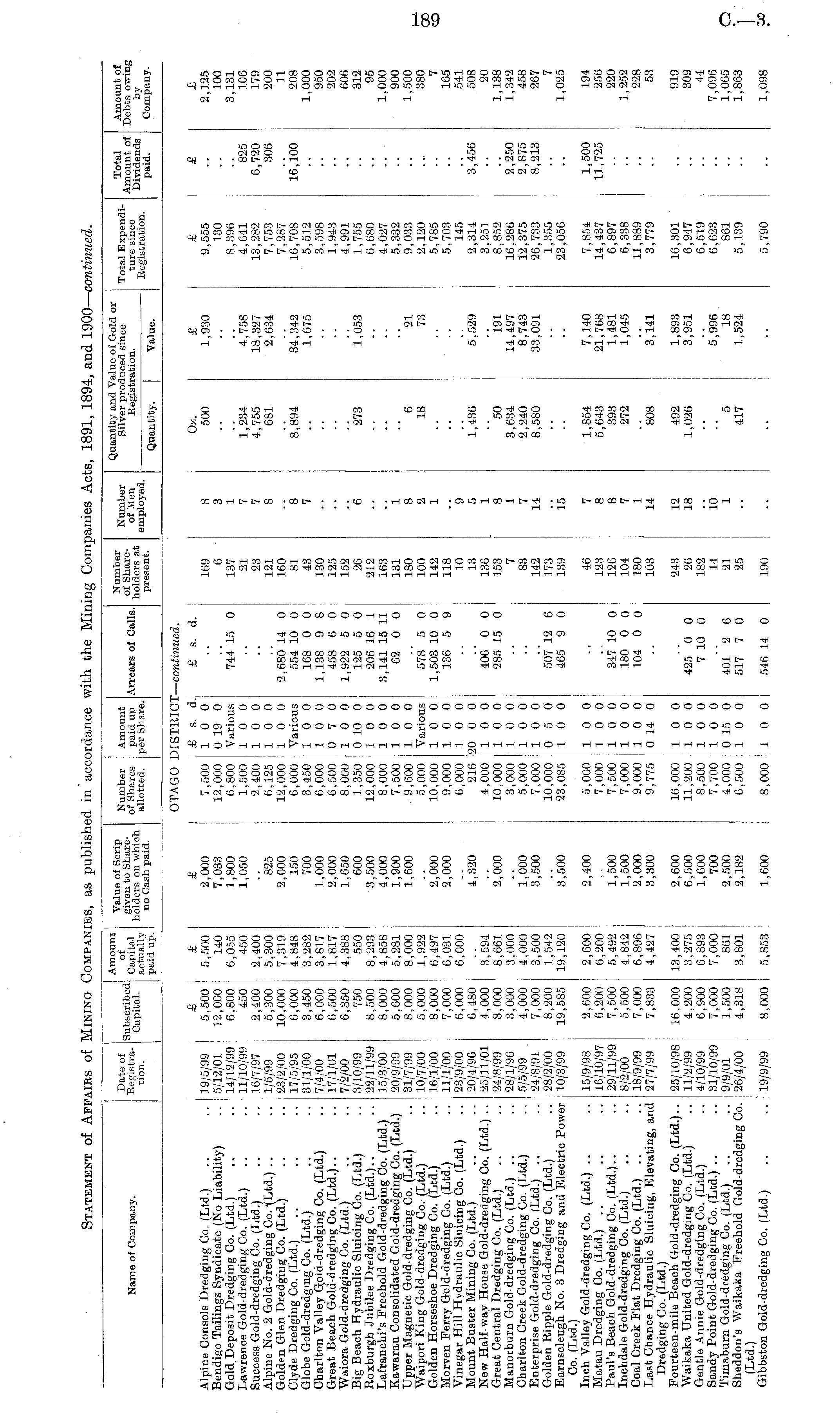 Name of Company. Amount valiip nf Sprin Number Quantity and Value of Gold or Date of a lihapr , hpfl of pivm, to SW? Number Amount ".S" Number Silver produced since "a*r °" ssx SS* ■slssa? psSL Arrears of Calls - «£* em °&. ssjs-r paid up. nocasftpa,d. piesent. - Quantity. Value. Total Expenditure since Total Amount of Dividends paid. Amount of Debts owing by Company. Quantity. Value. OTAGO DISTRICT— continued. Alpine Consols Dredging Co. (Ltd.) Bendigo Tailings Syndicate (No Liability) Gold Deposit Dredging Co. (Ltd.) Lawrence Gold-dredging Co. (Ltd.) Success Gold-dredging Co. (Ltd.) Alpine No. 2 Gold-dredging Co. "(Ltd.) .. Golden Glen Dredging Co. (Ltd.) Clyde Dredging Co. (Ltd.) Globe Gold-dredging Co. (Ltd.) Cbarlton Valley Gold-dredging Co. (Ltd.) Great Beach Gold-dredging Co. (Ltd.).. Waiora Gold-dredging Co. (Ltd.) Big Beach Hydraulic Sluicing Co. (Ltd.) Eoxburgh Jubilee Dredging Co. (Ltd.).. Lafrancbi's Freehold Gold-dredging Co. (Ltd.) Kawarau Consolidated Gold-dredging Co. (Ltd.) Upper Magnetic Gold-dredging Co. (Ltd.) Waipori King Gold dredging Co. (Ltd.) Golden Horseshoe Dredging Co. (Ltd.) Morven Ferry Gold-dredging Co. (Ltd.) Vinegar Hill Hydraulic Sluicing Co. (Ltd.) Mount Buster Mining Co. (Ltd.) New Half-way House Gold-dredging Co. (Ltd.) .. Great Central Dredging Co. (Ltd.) Manorburn Gold dredging Co. (Ltd.) .. Charlton Creek Gold-dredging Co. (Ltd.) Enterprise Gold-dredging Co. (Ltd.) Golden Ripple Gold-dredging Co. (Ltd.) Earnscleugh No. 3 Dredging and Electric Power Co. (Ltd.) Inch Valley Gold-dredging Co. (Ltd.) .. Matau Dredging Co. (Ltd.) .. Paul's Beach Gold-dredging Co. (Ltd.).. Inchdale Gold-dredging Co. (Ltd.) Coal Creek Flat Dredging Co. (Ltd.) .. Last Chance Hydraulic Sluicing, Elevating, and Dredging Co. (Ltd.) Fourteen-mile Beach Gold-dredging Co. (Ltd.).. Waikaka United Gold-dredging Co. (Ltd.) Gentle Annie Gold-dredging Co. (Ltd.) Sandy Point Gold-dredging Co. (Ltd.) Tirnaburn Gold-dredging Co. (Ltd.) Sneddon's Waikaka Freehold Gold-dredging Co. (Ltd.) Gibbston Gold-dredging Co. (Ltd.) 19/5/99 5/12/01 14/12/99 ] 1/10/99 16/7/97 1/5/99 23/2/00 17/5/95 31/1/00 7/4/00 17/1/01 7/2/00 3/10/99 22/11/99 15/3/00 20/9/99 31/7/99 10/7/00 16/1/00 11/1/00 23/9/00 20/4/96 25/11/01 24/8/99 28/1/96 5/5/99 24/8/91 28/2/00 10/3/99 £ 5,500 12,000 6.800 450 2,400 5,300 10,000 6,000 3,450 6,000 6,500 6,350 750 8,500 8,000 5,600 8,000 5,000 8,000 7,000 6,000 6,480 4,000 8,000 3,000 4,000 7,000 8,200 19,585 5,500 140 6,055 450 2,400 5,300 7,319 4,848 3,282 3,817 1,817 4,388 550 8,293 4,858 5,281 8,000 1,922 6,497 6,031 6,000 £ 2,000 7,033 1,800 1,050 825 2,000 150 700 1,000 2,000 1,650 600 3,500 4,000 1,900 1,600 7,500 12,000 6,800 1,500 2,400 6,125 12,000 6,000 3,450 6,000 6,500 8,000 1,350 12,000 8,000 7,500 . 9,600 5,000 10,000 9,000 6,000 216 4,000 10,000 3,000 5,000 7,000 10,000 23,085 £ s. a.| £ s. d. 10 0 0 19 0 Various 744 15 0 10 0 10 0 10 0 10 0 2,680 14 0 Various 554 10 0 10 0 168 0 0 10 0 1,138 9 8 0 7 0 458 6 0 10 0 1,922 5 0 0 10 0 125 5 0 10 0 206 16 1 10 0 3,141 15 11 10 0 62 0 0 10 0 Various 578 5 0 10 0 1,503 10 0 10 0 136 5 9 10 0! '20 0 O 1 0 0 I 406 0 0 1 0 0 j 285 15 0 10 0 10 0 10 0 0 5 0 507 12 6 10 0 465 9 0 169 6 137 21 23 121 160 81 43 130 125 152 26 212 163 131 180 100 142 118 10 13 136 153 7 83 142 173 139 8 3 1 7 7 8 7 6 Oz. 500 1,234 4,755 681 8,894 '273 £ 1,930 4,758 18,327 2,634 34,342 1,675 l^053 £ 9,555 130 8,396 4,641 13,282 7,753 7,287 16,708 5,512 3,598 1,943 4,991 1,755 6,680 4,027 5,332 9,033 2,120 5,785 5,703 145 2,314 3,251 8,852 16,286 12,375 26,733 1,355 23,056 £ 825 6,720 306 16,100 £ 2,125 100 3,131 106 179 200 11 208 1,000 950 202 606 312 95 1,000 900 1,500 380 7 165 541 508 20 1,138 1,342 458 267 7 1,025 1 8 2 1 6 18 21 73 2,000 2,000 3,594 8,661 3,000 4,000 3,500 1,542 19,120 4,320 2,000 9 5 1 8 1 7 14 1,436 50 3,634 2,240 8,580 5,529 191 14,497 8,743 33,091 3^456 2,250 2,875 8,213 i|6oo 3,500 3,500 15 15/9/98 16/10/97 29/11/99 8/2/00 18/9/99 27/7/99 2,600 6,200 7,500 5,500 7,000 7,833 2,600 6,200 5,492 4,842 6,896 4,427 2,400 5,000 7,000 7,500 7,000 9,000 9,775 10 0 10 0 10 0 347 10 0 10 0 180 0 0 10 0 104 0 0 0 14 0 46 123 126 104 180 103 7 8 8 7 1 14 1,854 5,643 393 272 7,140 21,768 1,481 1,045 7,854 14,437 6,897 6,338 11,889 3,779 1,500 11,725 194 256 220 1,252 228 53 1,500 1,500 2,000 3,300 "808 3,141 25/10/98 11/2/99 4/10/99 31/10/99 9/9/01 26/4/00 16.000 4,200 6,900 7,000 1,500 4,318 13,400 3,275 6,893 7,000 861 3,801 2,600 6,500 1,600 700 2,500 2,182 16,000 11,200 8,500 7,700 4,000 6,500 10 0 10 0 425 0 0 10 0 7 10 0 10 0 0 15 0 401 2 6 10 0 517 7 0 243 26 182 14 21 25 12 18 io i 492 1,026 1,89.3 3,951 5,996 18 1,524 16,301 6,947 6,519 6,623 861 5,139 919 309 44 7,096 1,065 1,863 5 417 19/9/99 8,000 5,853 1,600 8,000 I 1 0 0 I 546 14 0 190 5,790 1,098