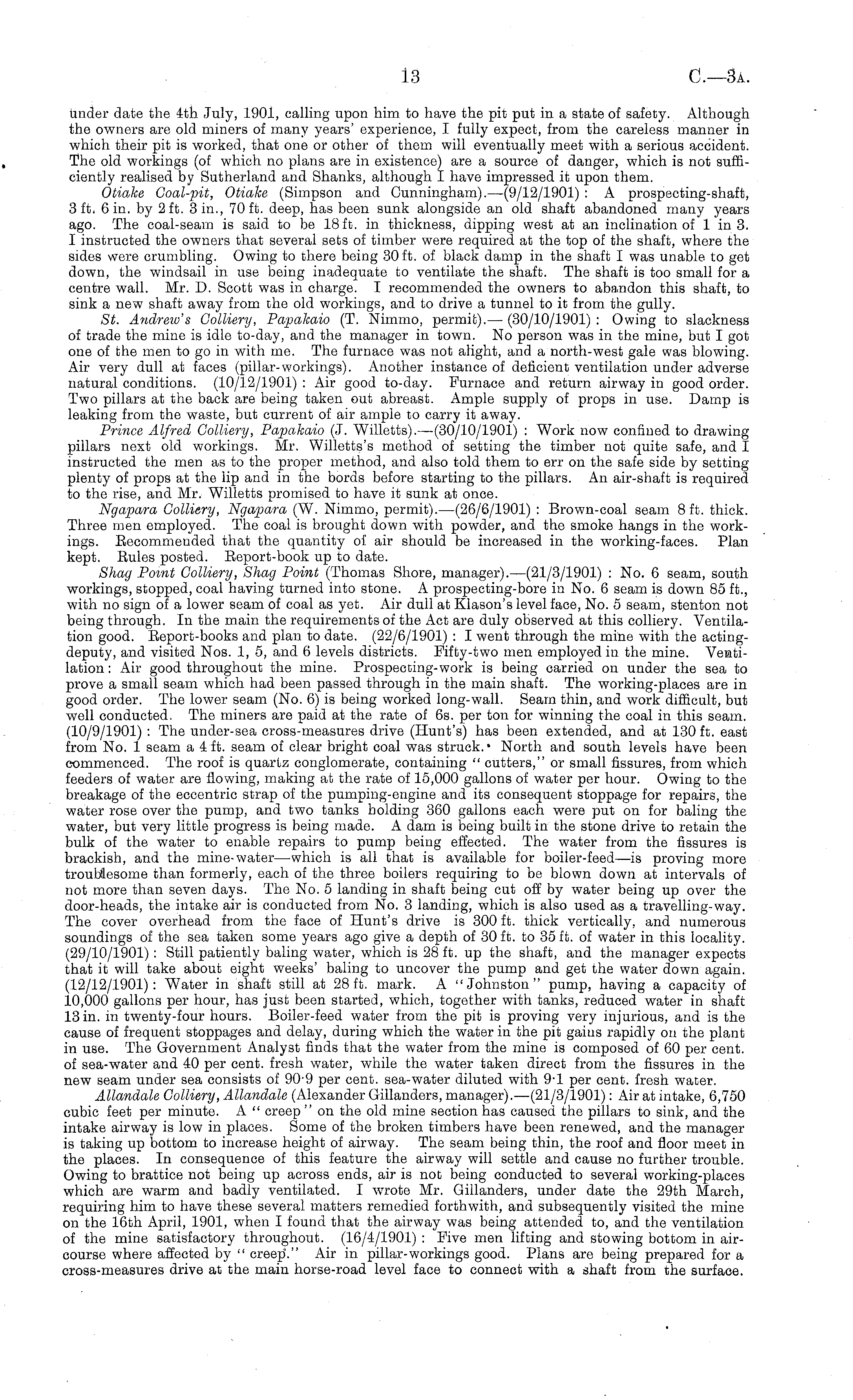 under date the 4th July, 1901, calling upon him to have the pit put in a state of safety. Although the owners are old miners of many years' experience, I fully expect, from the careless manner in which their pit is worked, that one or other of them will eventually meet with a serious accident. The old workings (of which no plans are in existence) are a source of danger, which is not sufficiently realised by Sutherland and Shanks, although I have impressed it upon them. Otiake Goal-pit, Otiahe (Simpson and Cunningham).—(9/12/1901) : A prospecting-shaft, 3 ft, 6 in. by 2 ft. 3 in., 70 ft. deep, has been sunk alongside an old shaft abandoned many years ago. The coal-seam is said to be 18 ft. in thickness, dipping west at an inclination of lin 3. I instructed the owners that several sets of timber were required at the top of the shaft, where the sides were crumbling. Owing to there being 30 ft. of black damp in the shaft I was unable to get down, the windsail in use being inadequate to ventilate the shaft. The shaft is too small for a centre wall. Mr. D. Scott was in charge. I recommended the owners to abandon this shaft, to sink a new shaft away from the old workings, and to drive a tunnel to it from the gully. Si. Andrew & Colliery, Papakaio (T. Nimmo, permit).— (30/10/1901) : Owing to slackness of trade the mine is idle to-day, and the manager in town. No person was in the mine, but I got one of the men to go in with me. The furnace was not alight, and a north-west gale was blowing. Air very dull at faces (pillar-workings). Another instance of deficient ventilation under adverse natural conditions. (10/12/1901) : Air good to-day. Furnace and return airway in good order. Two pillars at the back are being taken out abreast. Ample supply of props in use. Damp is leaking from the waste, but current of air ample to carry it away. Prince Alfred Colliery, Papakaio (J. Willetts). —(30/10/1901) : Work now confined to drawing pillars next old workings. Mr. Willetts's method of setting the timber not quite safe, and I instructed the men as to the proper method, and also told them to err on the safe side by setting plenty of props at the lip and in the bords before starting to the pillars. An air-shaft is required to the rise, and Mr. Willetts promised to have it sunk at once. Ngapara Colliery, Ngapara (W. Nimmo, permit). —(26/6/1901) : Brown-coal seam 8 ft. thick. Three men employed. The coal is brought down with powder, and the smoke hangs in the workings. Recommended that the quantity of air should be increased in the working-faces. Plan kept. Rules posted. Report-book up to date. Shag Point Colliery, Shag Point (Thomas Shore, manager).—(2l/3/1901) : No. 6 seam, south workings, stopped, coal having turned into stone. A prospecting-bore in No. 6 seam is down 85 ft., with no sign of a lower seam of coal as yet. Air dull at Klason's level face, No. 5 seam, stenton not being through. In the main the requirements of the Act are duly observed at this colliery. Ventilation good. Report-books and plan to date. (22/6/1901) : I went through the mine with the actingdeputy, and visited Nos. 1, 5, and 6 levels districts. Fifty-two men employed in the mine. Ventilation : Air good throughout the mine. Prospecting-work is being carried on under the sea to prove a small seam which had been passed through in the main shaft. The working-places are in good order. The lower seam (No. 6) is being worked long-wall. Seam thin, and work difficult, but well conducted. The miners are paid at the rate of 6s. per ton for winning the coal in this seam. (10/9/1901) : The under-sea cross-measures drive (Hunt's) has been extended, and at 130 ft. east from No. 1 seam a 4 ft. seam of clear bright coal was struck. • North and south levels have been commenced. The roof is quartz conglomerate, containing " cutters," or small fissures, from which feeders of water are flowing, making at the rate of 15,000 gallons of water per hour. Owing to the breakage of the eccentric strap of the pumping-engine and its consequent stoppage for repairs, the water rose over the pump, and two tanks holding 360 gallons each were put on for baling the water, but very little progress is being made. A dam is being built in the stone drive to retain the bulk of the water to enable repairs to pump being effected. The water from the fissures is brackish, and the mine-water —which is all that is available for boiler-feed—is proving more troublesome than formerly, each of the three boilers requiring to be blown down at intervals of not more than seven days. The No. 5 landing in shaft being cut off by water being up over the door-heads, the intake air is conducted from No. 3 landing, which is also used as a travelling-way. The cover overhead from the face of Hunt's drive is 300 ft. thick vertically, and numerous soundings of the sea taken some years ago give a depth of 30 ft. to 35 ft. of water in this locality. (29/10/1901) : Still patiently baling water, which is 28 ft. up the shaft, and the manager expects that it will take about eight weeks' baling to uncover the pump and get the water down again. (12/12/1901): Water in shaft still at 28ft. mark. A "Johnston" pump, having a capacity of 10,000 gallons per hour, has just been started, which, together with tanks, reduced water in shaft 13 in. in twenty-four hours. Boiler-feed water from the pit is proving very injurious, and is the cause of frequent stoppages and delay, during which the water in the pit gains rapidly on the plant in use. The Government Analyst finds that the water from the mine is composed of 60 per cent, of sea-water and 40 per cent, fresh water, while the water taken direct from the fissures in the new seam under sea consists of 909 per cent, sea-water diluted with 9-1 per cent, fresh water. AllandaU Colliery, Allandale (Alexander Gillanders, manager).—(2l/3/1901): Air at intake, 6,750 cubic feet per minute. A " creep "on the old mine section has caused the pillars to sink, an