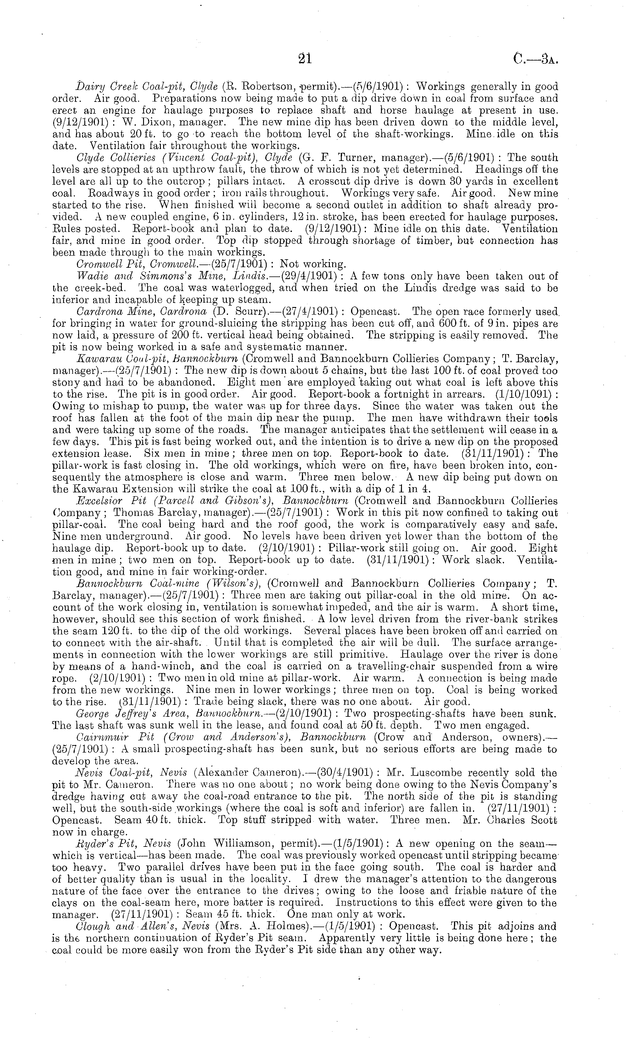 Dairy Greek Goal-pit, Clyde (B. Robertson, permit).—(s/6/1901) : Workings generally in good order. Air good. Preparations now being made to put a dip drive down in coal from surface and erect an engine for haulage purposes to replace shaft and horse haulage at present in use. (9/12/1901) :W. Dixon, manager. The new mine dip has been driven down to the middle level, and has about 20 ft. to go to reach the bottom level of the shaft-workings. Mine, idle on this date. Ventilation fair throughout the workings. Clyde Collieries (Vincent Coal-fit), Clyde (G. F. Turner, manager).—(s/6/1901) : The south levels are stopped at an upthrow fault, the throw of which is not yet determined. Headings off the level are all up to the outcrop ; pillars intact. A crosscut dip drive is down 30 yards in excellent coal. Roadways in good order ; iron rails throughout. Workings very safe. Air good. New mine started to the rise. When finished will become a second outlet in addition to shaft already provided. A new coupled engine, Gin. cylinders, 12 in. stroke, has been erected for haulage purposes. Rules posted. Report-book and plan to date. (9/12/1901): Mine idle on this date. Ventilation fair, and mine in good order. Top dip stopped through shortage of timber, but connection has been made through to the main workings. Cromwell Pit, Cromwell— (2s/7/1901) : Not working. Wadie and Simmons''s Mine, Lindis. —(29/4/1901) : A few tons only have been taken out of the creek-bed. The coal was waterlogged, and when tried on the Lindis dredge was said to be inferior and incapable of keeping up steam. Gardrona Mine, Cardrona (D. Scurr). —(27/4/1901) : Opencast. The open race formerly used, for bringing in water for ground-sluicing the stripping has been cut off, and 600 ft. of 9 in. pipes are now laid, a pressure of 200 ft. vertical head being obtained. The stripping is easily removed. The pit is now being worked in a safe and systematic manner. Kawarau Goal-pit, Bannockburn (Cromwell and Bannockburn Collieries Company; T. Barclay, manager).—(2s/7/1901) : The new dip is down about 5 chains, but the last 100 ft. of coal proved too stony and had to be abandoned. Eight men are employed taking out what coal is left above this to the rise. The pit is in good order. Air good. Report-book a fortnight in arrears. (1/10/1091) : Owing to mishap to pump, the water was up for three days. Since the water was taken out the roof has fallen at the foot of the main dip near the pump. The men have withdrawn their tools and were taking up some of the roads. The manager anticipates that the settlement will cease in a few days. This pit is fast being worked out, and the intention is to drive a new dip on the proposed extension lease. Six men in mine ; three men on top. Report-book to date. (31/11/1901): The pillar-work is fast closing in. The old workings, which were on fire, have been broken into, consequently the atmosphere is close and warm. Three men below. A new dip being put down on the Kawarau Extension will strike the coal at 100 ft., with a dip of 1 in 4. Excelsior Pit (Parcell and Gibson's), Bannockburn (Cromwell and Bannockburn Collieries Company ; Thomas Barclay, manager). —(25/7/1901) : Work in this pit now confined to taking out pillar-coal. The coal being hard and the roof good, the work is comparatively easy and safe. Nine men underground. Air good. No levels have been driven yet lower than the bottom of the haulage dip. Report-book up to date. (2/10/1901) : Pillar-work still going on. Air good. Eight men in mine ; two men on top. Report-book up to date. (31/11/1901) : Work slack. Ventilation good, and mine in fair working-order. Bannockburn Coal-mine (Wilson s), (Cromwell and Bannockburn Collieries Company; T. Barclay, manager).—(2s/7/1901) : Three men are taking out pillar-coal in the old mine. On account of the work closing in, ventilation is somewhat impeded, and the air is warm. A short time, however, should see this section of work finished. A low level driven from the river-bank strikes the seam 120 ft. to the dip of the old workings. Several places have been broken off and carried on to connect with the air-shaft. Until that is completed the air will bo dull. The surface arrangements in connection with the lower workings are still primitive. Haulage over the river is done by means of a hand-winch, and the coal is carried on a travelling-chair suspended from a wire rope. (2/10/1901) : Two men in old mine at pillar-work. Air warm. A connection is being made from the new workings. Nine men in lower workings ; three men on top. Coal is being worked to the rise. (31/11/1901) : Trade being slack, there was no one about. Air good. George Jeffrey's Area, Bannockburn. —(2/10/1901) : Two prospecting-shafts have been sunk. The last shaft was sunk well in the lease, and found coal at 50 ft. depth. Two men engaged. Gairnmuir Pit (Grow and Anderson's), Bannockburn (Crow and Anderson, owners). — (25/7/1901) : A small prospecting-shaft has been sunk, but no serious efforts are being made to develop the area. Nevis Goal-pit, Nevis (Alexander Cameron). —(30/-4/1901) : Mr. Luscombe recently sold the pit to Mr. Cameron. There was no one about; no work being done owing to the Nevis Company's dredge having cut away the coal-road entrance to the pit. The north side of the pit is standing well, but the south-side workings (where the coal is soft and inferior) are fallen in. (27/11/1901) : Opencast. Seam 40 ft. thick. Top stuff stripped with water. Three men. Mr. Charles Scott now in charge. Ryder's Pit, Nevis (John Williamson, permit). —(1/5/1901) : A new opening on the seam— which is vertical—has been made. The coal was previously worked opencast until stripping became too heavy. Two parallel drives have been put in the face going south. The coal is harder and of better quality than is usual in the locality. I drew the manager's attention to the dangerous nature of the face over the entrance to the drives; owing to t