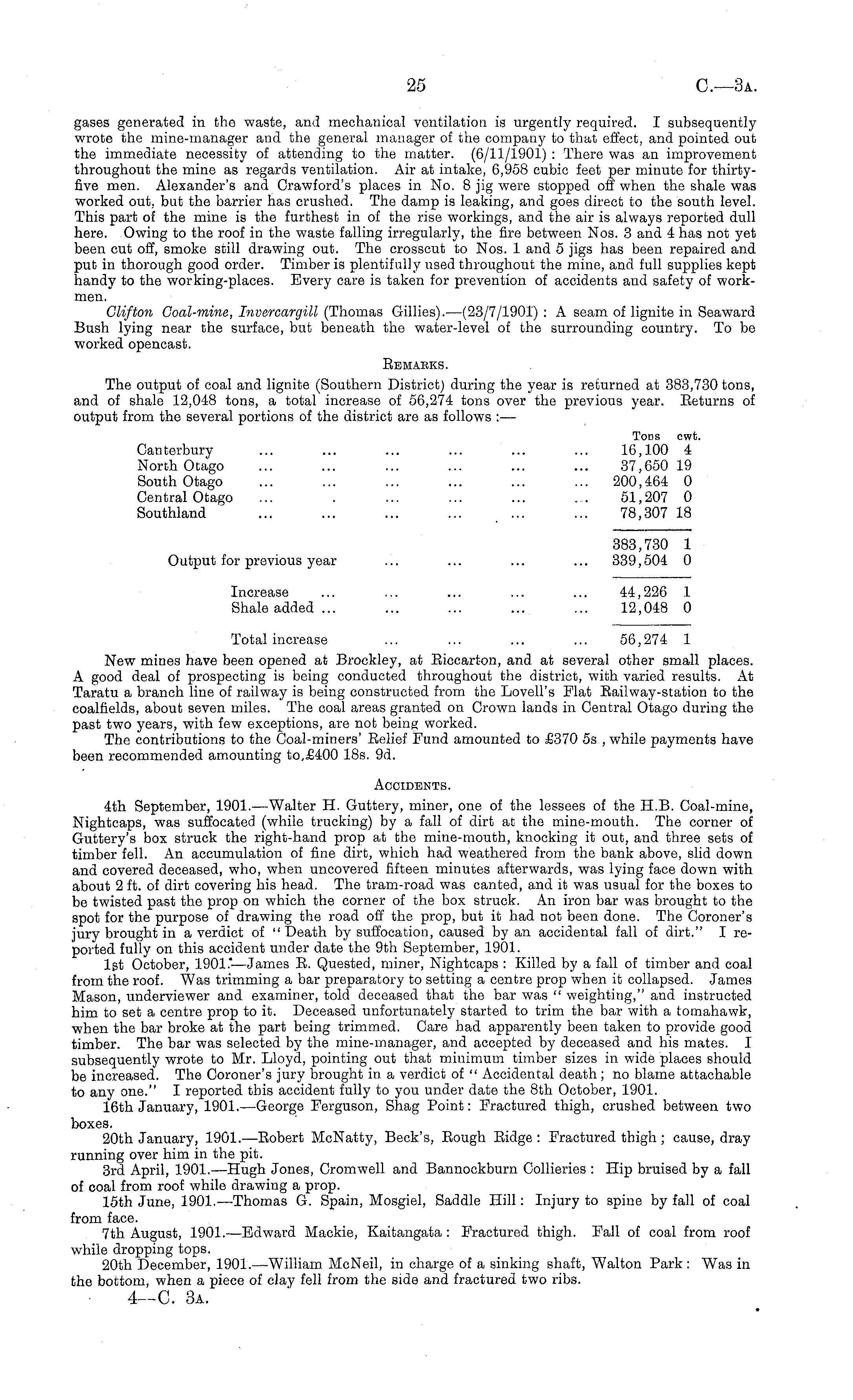 gases generated in the waste, and mechanical ventilation is urgently required. I subsequently wrote the mine-manager and the general manager of the company to that effect, and pointed out the immediate necessity of attending to the matter. (6/11/1901) : There was an improvement throughout the mine as regards ventilation. Air at intake, 6,958 cubic feet per minute for thirtyfive men. Alexander's and Crawford's places in No. 8 jig were stopped off when the shale was worked out. but the barrier has crushed. The damp is leaking, and goes direct to the south level. This part of the mine is the furthest in of the rise workings, and the air is always reported dull here. Owing to the roof in the waste falling irregularly, the fire between Nos. 3 and 4 has not yet been cut off, smoke still drawing out. The crosscut to Nos. 1 and 5 jigs has been repaired and put in thorough good order. Timber is plentifully used throughout the mine, and full supplies kept handy to the working-places. Every care is taken for prevention of accidents and safety of workmen. Clifton Goal-mine, Invercargill (Thomas Gillies). —(23/7/1901) : A seam of lignite in Seaward Bush lying near the surface, but beneath the water-level of the surrounding country. To be worked opencast. Eemaeks. The output of coal and lignite (Southern District) during the year is returned at 383,730 tons, and of shale 12,048 tons, a total increase of 56,274 tons over the previous year. Eeturns of output from the several portions of the district are as follows :— Tons cwt. Canterbury ... ... ... ... ... ... 16,100 4 North Otago ... ... ... ... ... ... 37,650 19 South Otago ... ... ... ... ... ... 200,464 0 Central Otago ... . ... ... ... .... 51,207 0 Southland ... ... ... ... ... ... 78,307 18 383,730 1 Output for previous year ... ... ... ... 339,504 0 Increase ... ... ... ... ... 44,226 1 Shale added ... ... ... ... ... 12,048 0 Total increase ... ... ... ... 56,274 1 New mines have been opened at Brockley, at Eiccarton, and at several other small places. A good deal of prospecting is being conducted throughout the district, with varied results. At Taratu a branch line of railway is being constructed from the Lovell's Flat Bailway-station to the coalfields, about seven miles. The coal areas granted on Crown lands in Central Otago during the past two years, with few exceptions, are not being worked. The contributions to the Coal-miners' Belief Fund amounted to £370 5s , while payments have been recommended amounting t0,£400 18s. 9d. Accidents. 4th September, 1901.—Walter H. Guttery, miner, one of the lessees of the H.B. Coal-mine, Nightcaps, was suffocated (while trucking) by a fall of dirt at the mine-mouth. The corner of Guttery's box struck the right-hand prop at the mine-mouth, knocking it out, and three sets of timber fell. An accumulation of fine dirt, which had weathered from the bank above, slid down and covered deceased, who, when uncovered fifteen minutes afterwards, was lying face down with about 2 ft. of dirt covering his head. The tram-road was canted, and it was usual for the boxes to be twisted past the prop on which the corner of the box struck. An iron bar was brought to the spot for the purpose of drawing the road off the prop, but it had not been done. The Coroner's jury brought in a verdict of " Death by suffocation, caused by an accidental fall of dirt." I reported fully on this accident under date the 9th September, 1901. Ist October, 1901*—James E. Quested, miner, Nightcaps : Killed by a fall of timber and coal from the roof. Was trimming a bar preparatory to setting a centre prop when it collapsed. James Mason, underviewer and examiner, told deceased that the bar was " weighting," and instructed him to set a centre prop to it. Deceased unfortunately started to trim the bar with a tomahawk, when the bar broke at the part being trimmed. Care had apparently been taken to provide good timber. The bar was selected by the mine-manager, and accepted by deceased and his mates. I subsequently wrote to Mr. Lloyd, pointing out that minimum timber sizes in wide places should be increased. The Coroner's jury brought in a verdict of " Accidental death ; no blame attachable to any one." I reported this accident fully to you under date the Bth October, 1901. 16th January, 1901. —George Ferguson, Shag Point: Fractured thigh, crushed between two boxes. 20th January, 1901.—Eobert McNatty, Beck's, Bough Bidge : Fractured thigh; cause, dray running over him in the pit. 3rd April, 1901. —Hugh Jones, Cromwell and Bannockburn Collieries : Hip bruised by a fall of coal from roof while drawing a prop. 15th June, 1901. —Thomas G. Spain, Mosgiel, Saddle Hill: Injury to spine by fall of coal from face. 7th August, 1901. —Edward Mackie, Kaitangata : Fractured thigh. Fall of coal from roof while dropping tops. 20th December, 1901. —William McNeil, in charge of a sinking shaft, Walton Park : Was in the bottom, when a piece of clay fell from the side and fractured two ribs. 4—C. 3a.