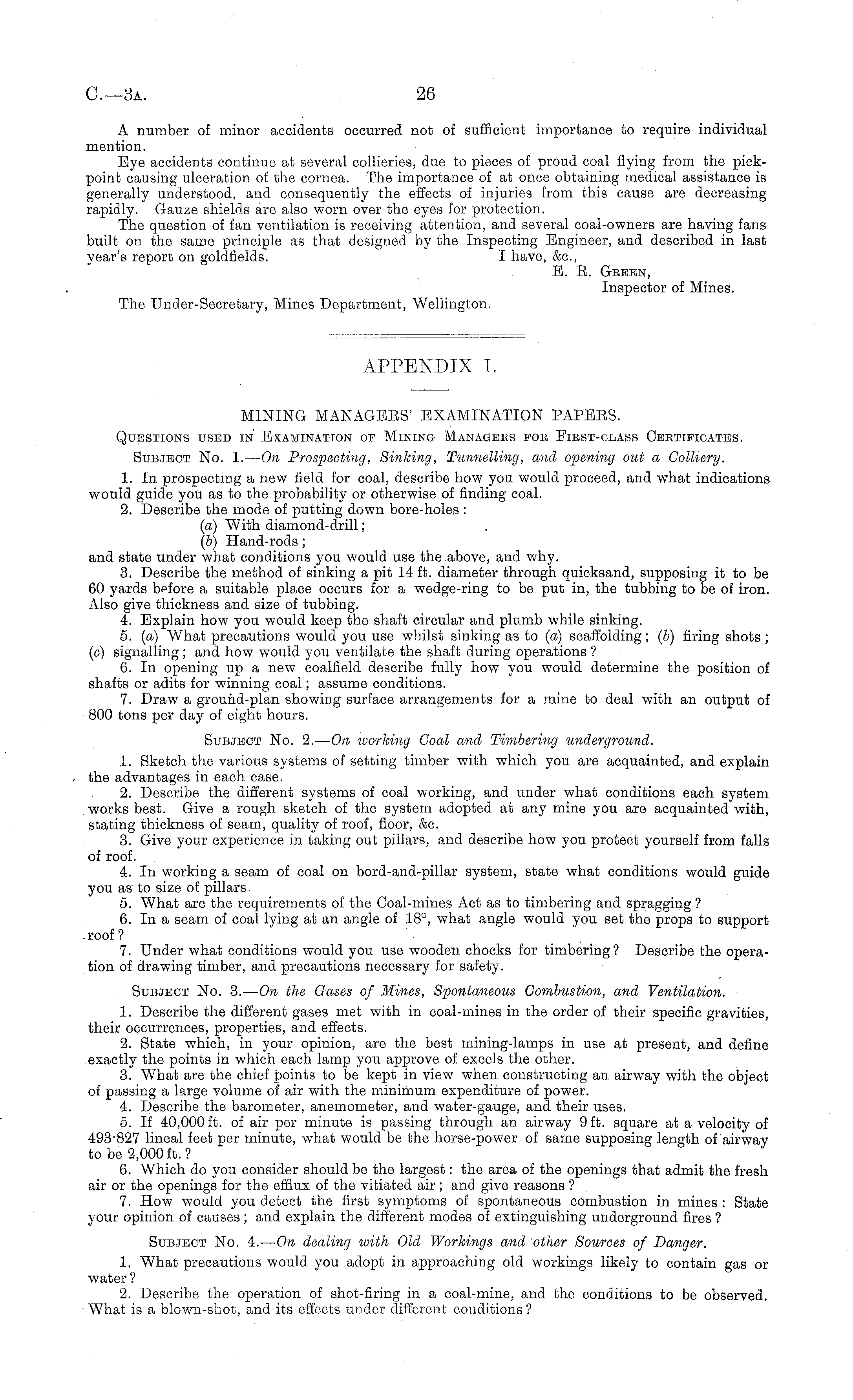 A number of minor accidents occurred not of sufficient importance to require individual mention. Eye accidents continue at several collieries, due to pieces of proud coal flying from the pickpoint causing ulceration of the cornea. The importance of at once obtaining medical assistance is generally understood, and consequently the effects of injuries from this cause are decreasing rapidly. Gauze shields are also worn over the eyes for protection. The question of fan ventilation is receiving attention, and several coal-owners are having fans built on the same principle as that designed by the Inspecting Engineer, and described in last year's report on goldfields. I have, &c, E. E. Green, Inspector of Mines. The Under-Secretary, Mines Department, Wellington.