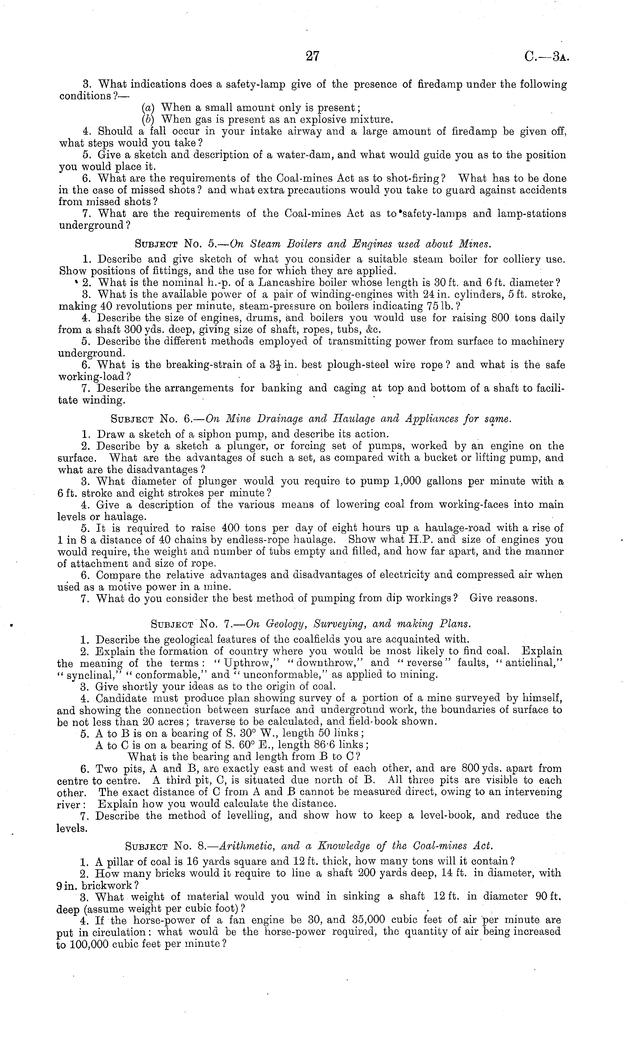3. What indications does a safety-lamp give of the presence of firedamp under the following conditions ?— (a) When a small amount only is present; (b) When gas is present as an explosive mixture. 4. Should a fall occur in your intake airway and a large amount of firedamp be given off, what steps would you take ? 5. Give a sketch and description of a water-dam, and what would guide you as to the position you would place it. 6. What are the requirements of the Coal-mines Act as to shot-firing? What has to be done in the case of missed shots? and what extra precautions would you take to guard against accidents from missed shots ? 7. What are the requirements of the Coal-mines Act as to'safety-lamps and lamp-stations underground ? Subject No. 5. — On Steam Boilers and Engines used about Mines. 1. Describe and give sketch of what you consider a suitable steam boiler for colliery use. Show positions of fittings, and the use for which they are applied. 2. What is the nominal h.-p. of a Lancashire boiler whose length is 30ft. and 6ft. diameter? 3. What is the available power of a pair of winding-engines with 24 in. cylinders, 5 ft. stroke, making 40 revolutions per minute, steam-pressure on boilers indicating 751b.? 4. Describe the size of engines, drums, and boilers you would use for raising 800 tons daily from a shaft 300 yds. deep, giving size of shaft, ropes, tubs, &c. 5. Describe the different methods employed of transmitting power from surface to machinery underground. 6. What is the breaking-strain of a in. best plough-steel wire rope ? and what is the safe working-load? 7. Describe the arrangements for banking and caging at top and bottom of a shaft to facilitate winding. Subject No. 6.— On Mine Drainage and Haulage and Appliances for same. 1. Draw a sketch of a siphon pump, and describe its action. 2. Describe by a sketch a plunger, or forcing set of pumps, worked by an engine on the surface. What are the advantages of such a set, as compared with a bucket or lifting pump, and what are the disadvantages ? 3. What diameter of plunger would you require to pump 1,000 gallons per minute with a 6 ft. stroke and eight strokes per minute ? 4. Give a description of the various means of lowering coal from working-faces into main levels or haulage. 5. It is required to raise 400 tons per day of eight hours up a haulage-road with a rise of lin 8 a distance of 40 chains by endless-rope haulage. Show what H.P. and size of engines you would require, the weight and number of tubs empty and filled, and how far apart, and the manner of attachment and size of rope. 6. Compare the relative advantages and disadvantages of electricity and compressed air when used as a motive power in a mine. 7. What do you consider the best method of pumping from dip workings? Give reasons. Subject No. 7. — On Geology, Surveying, and malting Plans. 1. Describe the geological features of the coalfields you are acquainted with. 2. Explain the formation of country where you would be most likely to find coal. Explain the meaning of the terms: "Upthrow," " downthrow," and "reverse" faults, "anticlinal," " synclinal," " conformable," and " unconformable," as applied to mining. 3. Give shortly your ideas as to the origin of coal. 4. Candidate must produce plan showing survey of a portion of a mine surveyed by himself, and showing the connection between surface and underground w T ork, the boundaries of surface to be not less than. 20 acres; traverse to be calculated, and field-book shown. 5. A to B is on a bearing of S. 30° W., length 50 links; AtoCis on a bearing of S. 60° E., length 866 links; What is the bearing and length from B to C ? 6. Two pits, A and B, are exactly east and west of each other, and are 800 yds. apart from centre to centre. A third pit, C, is situated due north of B. All three pits are visible to each other. The exact distance of C from A and B cannot be measured direct, owing to an intervening river : Explain how you would calculate the distance. 7. Describe the method of levelling, and show how to keep a level-book, and reduce the levels. Subject No. B.— Arithmetic, and a Knoiuledge of the Goal-mines Act. 1. A pillar of coal is 16 yards square and 12ft. thick, how many tons will it contain? 2. How many bricks would it require to line a shaft 200 yards deep, 14 ft. in diameter, with 9in. brickwork? 3. What weight of material would you wind in sinking a shaft 12 ft. in diameter 90 ft. deep (assume weight per cubic foot) ? 4. If the horse-power of a fan engine be 30, and 35,000 cubic feet of air per minute are put in circulation: what would be the horse-power required, the quantity of air being increased to 100,000 cubic feet per minute ?