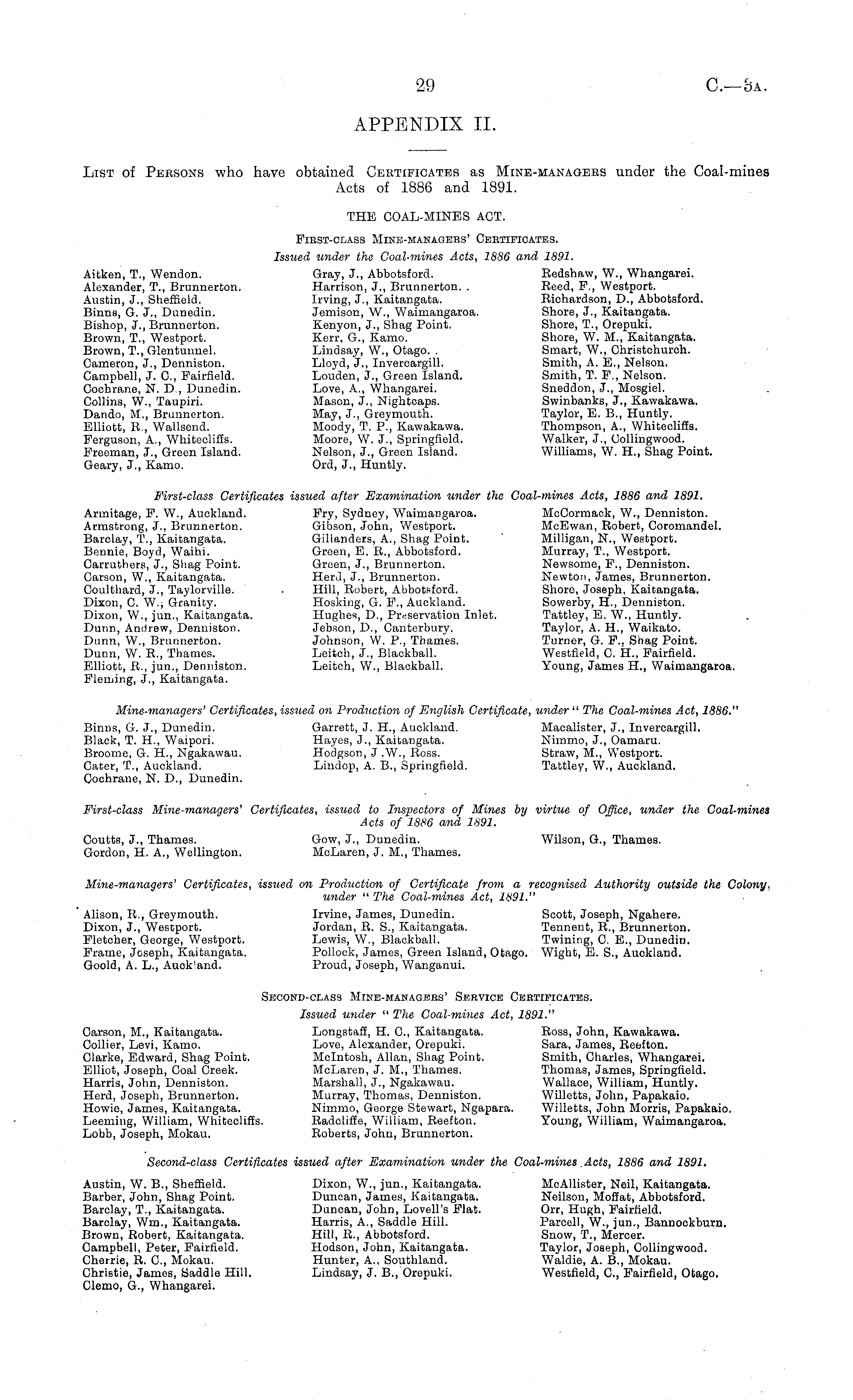 List of Pebsons who have obtained Certificates as Mine-managees under the Coal-mines Acts of 1886 and 1891. THE COAL-MINES ACT. FIBST-CLASS MINE-MANAGEBS' CeBTIFIOATES. Issued under the Coal-mines Acts, 1886 and 1891. Aitken, T., Wendon. Gray, J., Abbotsford. Bedshaw, W., Whangarei. Alexander, T., Brunnerton. Harrison, J., Brunnerton. Eeed, F., Westport. Austin, J., Sheffield. Irving, J., Kaitangata. Eichardson, D., Abbotsford. Binns, G. J., Dunedin. Jemison, W., Waimangaroa. Shore, J., Kaitangata. Bishop, J., Brunnerton. Kenyon, J., Shag Point. Shore, T., Orepuki. Brown, T., Westport. Kerr, G., Kamo. Shore, W. M., Kaitangata. Brown, T., Glentuimel. Lindsay, W., Otago. . Smart, W., Ghristchureh. Cameron, J., Denniston. Lloyd, J., Inveroargill. Smith, A. E., Nelson. Campbell, J. C, Pairfield. Louden, J., Green Island. Smith, T. P., Nelson. Cochrane, N. D , Dunedin. Love, A., Whangarei. Sneddon, J., Mosgiel. Collins, W., Taupiri. Mason, J., Nightcaps. Swinbanks, J., Kawakawa. Dando, M., Brunnerton. May, J., Greymouth. Taylor, E. 8., Huntly. Elliott, E., Wallsend. Moody, T. P., Kawakawa. Thompson, A., Whitecliffs. Ferguson, A., Whitecliffs. Moore, W. J., Springfield. Walker, J., Collingwood. Freeman, J., Green Island. Nelson, J., Green Island. Williams, W. H., Shag Point. Geary, J., Kamo. Ord, J., Huntly. E'irst-class Certificates issued after Examination under the Coal-mines Acts, 1886 and 1891. Armitage, P. W., Auckland. Pry, Sydney, Waimangaroa. McCormack, W., Denniston. Armstrong, J., Brunnerton. Gibson, John, Westport. McEwan, Eoberb, Coromandel. Barclay, T., Kaitangata. Gillanders, A., Shag Point. Milligan, N., Weatport. Beimie, Boyd, Waihi. Green, E. E., Abbotsford. Murray, T., Westport. Carruthers, J., Shag Point. Green, J., Brunnerton. Newsome, P., Denniston. Carson, W., Kaitangata. Herd, J., Brunnerton. Newton, James, Brunnerton. Coulthard, J., Taylorville. Hill, Eoberfc, Abbotfiford. Shore, Joseph, Kaitangata. Dixon, G. W., Granity. Hosking, G. F., Auckland. Sowerby, H., Denniston. Dixon, W., jun., Kaitangata. Hughes, D., Preservation Inlet. Tattley, E. W., Huntly. Dunn, Andrew, Denniston. Jebson, D., Canterbury. Taylor, A. H., Waikato. Dunn, W., Brunnerton. Johnson, W. P., Thames. Turner, G. P.. Shag Point. Dunn, W. E., Thames. Leitch, J., Blackball. Westfield, C. H., Pairfield. Elliott, E., jun., Denniston. Leitch, W., Blackball. Young, James H., Waimangaroa. Fleming, J., Kaitangata. Mine-managers' Certificates, issued on Production of English Certificate, under " The Coal-mines Act, 1886." Binns, G. J., Dunedin. Garrett, J. H., Auckland. Macalister, J., Invercargill. Black, T. H., Waipori. Hayes, J., Kaitangata. Nimmo, J., Oamaru. Broome, G. H., Ngakawau. Hodgson, J .W., Eoss. Straw, M., Westport. Cater, T., Auckland. Lindop, A. 8., Springfield. Tattley, W., Auckland. Cochrane, N. D., Dunedin. First-class Mine-managers' Certificates, issued to Inspectors of Mines by virtue of Office, under the Coal-mines Acts of 1886 and 1891. Coutts, J., Thames. Gow, J., Dunedin. Wilson, G., Thames. Gordon, H. A., Wellington. McLaren, J. M., Thames. Mine-managers' Certificates, issued mi Production of Certificate from a recognised Authority outside the Colony, under " The Coal-mines Act, 1891." Alison, E., Greymouth. Irvine, James, Dunedin. Scott, Joseph, Ngahere. Dixon, J., Westport. Jordan, E. S., Kaitangata. Tennent, E., Brunnerton. Fletcher, George, Westport. Lewis, W., Blackball. Twining, C. E., Dunedin. Frame, Joseph, Kaitangata. Pollock, James, Green Island, Otago. Wight, E. S., Auckland. Goold, A. L., Auck ! and. Proud, Joseph, Wanganui. Second-class Mine-managers' Service Certificates. Issued under " The Coal-mines Act, 1891." Carson, M., Kaitangata. Longstaff, H. C, Kaitangata. Eoss, John, Kawakawa. Collier, Levi, Kamo. Love, Alexander, Orepuki. Sara, James, Beefton. Clarke, Edward, Shag Point. Mclntosh, Allan, Shag Point. Smith, Charles, Whangarei. Elliot, Joseph, Coal Creek. McLaren, J. M., Thames. Thomas, James, Springfield. Harris, John, Denniston. Marshall, J., Ngakawau. Wallace, William, Huntly. Herd, Joseph, Brunnerton. Murray, Thomas, Denniston. Willetts, John, Papakaio. Howie, James, Kaitangata. Nimmo, George Stewart, Ngapara. Willetts, John Morris, Papakaio. Leeming, William, Whitecliffs. Badclifie, William, Eeefton. Young, William, Waimangaroa. Lobb, Joseph, Mokau. Eoberts, John, Brunnerton. Second-class Certificates issued after Examination under the Coal-mines Acts, 1886 and 1891. Austin, W. 8., Sheffield. Dixon, W., jun., Kaitangata. McAllister, Neil, Kaitangata. Barber, John, Shag Point. Duncan, James, Kaitangata. Neilson, Moffat, Abbotsford. Barclay, T., Kaitangata. Duncan, John, Lovell's Flat. Orr, Hugh, Pairfield. Barclay, Wm., Kaitangata. Harris, A., Saddle Hill. Parcel], W., jun., Bannockburn. Brown, Eobert, Kaitangata. Hill, 8., Abbotsford. Snow, T., Mercer. Campbell, Peter, Pairfield. Hodson, John, Kaitangata. Taylor, Joseph, Collingwood. Cherrie, E. C, Mokau. Hunter, A., Southland. Waldie, A. 8., Mokau. Christie, James, Saddle Hill. Lindsay, J. 8., Orepuki. Westfield, C, Pairfield, Otago. Clemo, G., Whangarei.