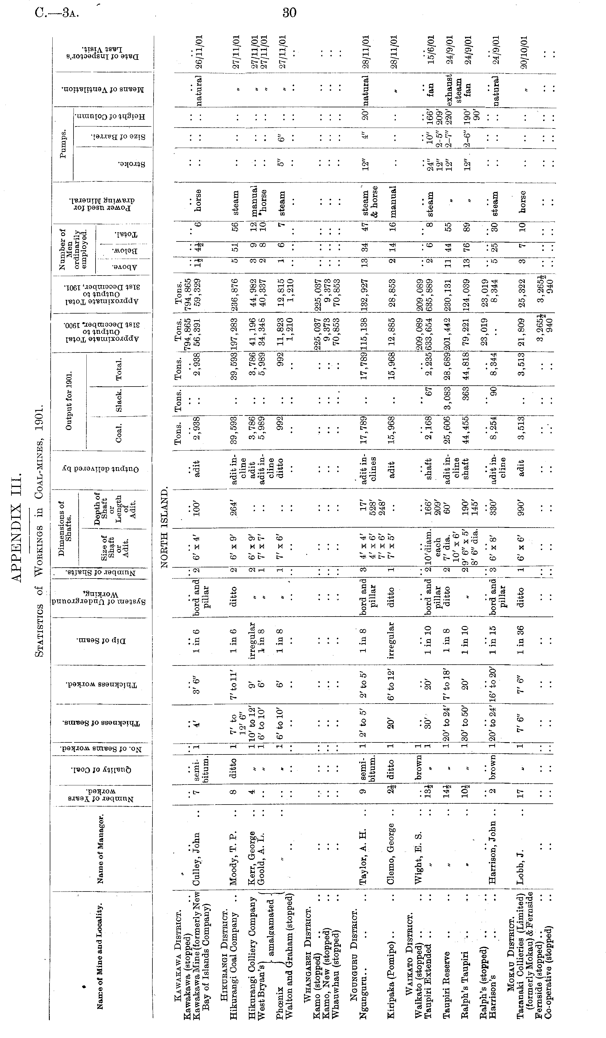 Statist: cs of WOBKINGS ill Cl lAL-MINES, 1901. • Name of Mine and Locality. Name of Manager. r o © CO o* •s a '3 M O m o 3 a Cβ in o 5 0 CD it ID ui I I I Depth of Size of I Shaft Shaft or or I Length Adit. I of Adit. Dimensions of Shafts. 9 5 £1 Coal. J Slack. Total. Output for 1901. SHo J ft <fi I 1 Number of Men ordinarilyemployed. I 6 I 3 < ' ffl ■ H II Pumps. S ! o I .2 o K 1 a Cβ a P P "ORTH SLAND, I Kawakawa Distbict. Kawakawa (stopped) Kawakawa Mine (formerly New Bay of Islands Company) Culley, John 7 semibitum. i 4' 3' 6" 1 in 6 bord and pillar '2 6' x4' 100' adit Tons. 2^938 Tons. Tons. , 2^938 Tons. 794,865 56,391 Tons. 794,865 59,329 ij % "e horse natural 26/11/0: HlKUEANGI DlSTEICT. Hikurangi Goal Company Moody, T. P. ditto 7' to 12' 6" 10' to 12' 6' to 10' 7'toll' 1 in 6 ditto 6' x9' 264' adit incline adit adit incline ditto 39,593| 197,283 236,876 steam „ ! 27/11/0: : \ 27/11/0: „ ! 27/11/0: 8 39,593 51 56 Hikurangi Colliery Company West Bryan's) I V amalgamated •! Phcenix J ( Walton and Graham (stopped) Kerr, George Goold, A. L. 4 1 i 9' 6' irregular 1 in 8 2 1 6' x9' 7' x7' 3,786 5,989 3,786 5,989 41,196 34,345 44,982 40,337 3 2 9 8 12 lOi manual horse „ 1 6' to 10' 6' 1 in 8 7' x6' 992 992 11,823 1,210 12,815 1,210 1 6 7 steam 5" 6" . J 27/11/0: Whangarei Distbiot. Kamo (stopped) Kamo, New (stopped) Whauwhau (stopped) ■■ i I 225,037 9,373 70,853 225,037 9,373 70,853 •• ! I Ngungubu Distbict. Ngunguru Taylor, A. H. semibitum. 2' to 5' 2'to 5' 1 in 8 bord and pillar 4' x4' 4' x6' 7'x6' 7' x5' 17' 528' 248' adit inclines 17,789 17,789 115,138 132,927 i:i steam & horse 12" natural j 28/11/0: oil 47 4" 20' Kiripaka (Pomipo) Clemo, George .. 2J : ditto 20' ! 6' to 12' irregular ditto .. adit 15,968 15,968 12,885 28,853 14 16 manual „ I 28/11/0: Waikato District. Waikato (stopped) Taupiri Extended Wight, E. S. brown 1 30' 20' 1 in 10 bord and pillar ditto 10'diam. each T dia. 10' x6' 9' 6" x 5' 8' 6" dia. 166' 209' ; 60' shaft 2,168 2,'235 209,089 633,654 209,089 635,889 steam 24" 12" 12" fan \ 15/6/0: 13J 2 67 2 6 "8 10" 2-5" 2-7" 166' 209' 220' Taupiri Reserve H* 20' to 24' 7'to 18' 1 in 8 adit incline shaft 25,606 3,083 28,689| 201,442 230,131 11 44 55 exhaust 24/9/0: steam fan J 24/9/0] Ralph's Taupiri 10J 30' to 50' 20' 1 in 10 190' : 145' j 44,455 363 44,818 79,221 124,039 j 13 76 89J 12" 2-6" 190' 90' Ralph's (stopped) .. Harrison's Harrison, John .. 2 brown 20' to 24' 16' to 20' 1 in 15 bord and pillar ' 3 ! 6' xV 330' adit incline 8,254 "90! 8,344 23,019 23,019 I 8,344 J 5 25 30 : natural. 24/9/Oj steam Mokau District. Taranaki Collieries (Limited) (formerly Mokau) & Fernside Fernside (stopped) Co-operative (stopped) Lobb, J. 17 I 7' 6" 7' 6" 1 in 36 ditto 6' x 6' 990' adit 3,513 3,513 21,809 25,322 10 horse „ I 20/10/0] ! .. 1 3,265J 940 3,265j! 940 .. i .. .. •■ I ■• I .. ..