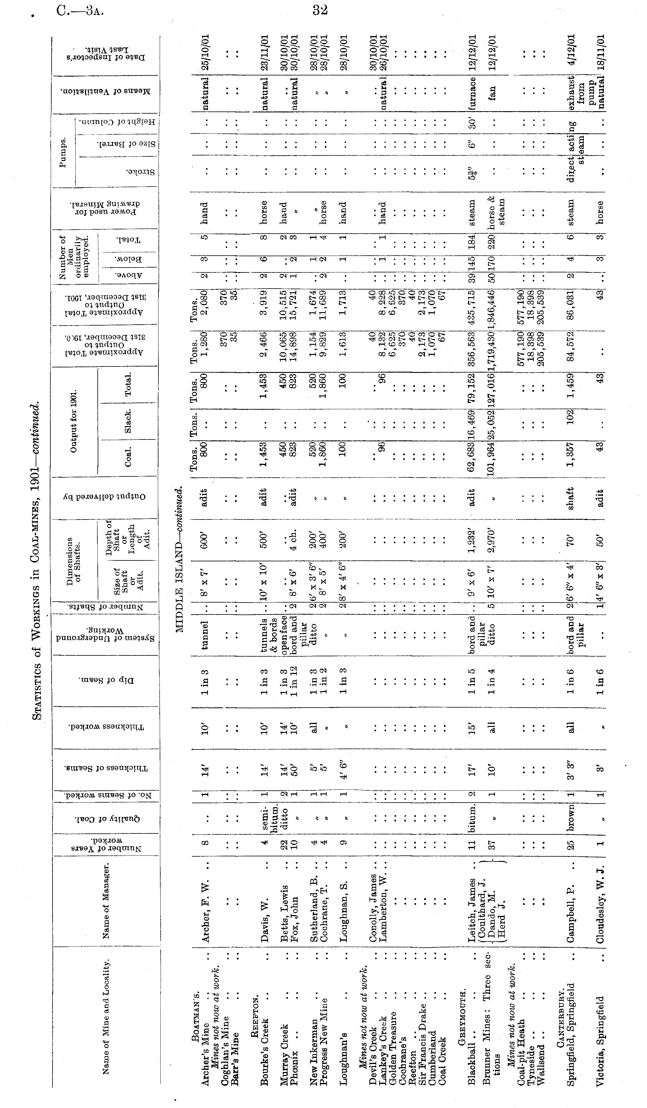 I "o 6 GO o o a p O "3 3 3 S III X 3 O I s ! Number of Men ordinarily employed. Pumps. a "a m § 'A ■a o a> Dimensious of Shafts. Output for 1901. ll i is C3 Q Name of Mine and Locality. : Name of Manager. O "S O , S s 02 S Depth of Size of Shaft Shaft or or Length Adit. of Adit. Coal. Slack. Total. ill £ S < 53 g jj d <! ffl rt I $ o CO 02 3 o to I Mil LE ISL4 JNTD — coni itinued. Boatman's. Archer's Mine Mines not now at work. Coghlan's Mine Barr's Mine Archer, F. W. 14' 10' 1 in 3 tunnel 8' x 7' j 600' adit I Tons. 800 Tons. Tons. 800 Tons. 1,280 Tons. 2,080 band natural 25/10/0: •• ! - 370 35 370 35 .. Beefton. Bourke's Creek Davis, W. semiditto 14' 10' 1 in 3 tunnels & bords openfaoe bord and pillar ditto 10' x 10' 500' adit 1,453 1,453 2,466 3,919 horse natural 23/11/0: 4 Murray Creek Phcenix Betts, Lewis Fox, John 22 10 2 1 14' 50' 14' 10' 1 in 3 1 in 12 2 8' x6' 4ch. adit 450 823 450 823 10,065 14,898 10,515 15,721 2 1 2 2 3 hand natural 30/10/0] 30/10/0: New Inkerman Progress New Mine Sutherland, B. .. Cochrane, T. 4 4 v i 5' 5' all 1 in 3 1 in 2 2 2 6' x 3' 6" 8' x 5' 200' 400' ' " 520 1,860 520 1,860 1,154 9,829 1,674 11,689 2 1 2 1 4 horse 28/10/0: 28/10/0] Loughnan's Loughnan, S. 9 4' 6" 1 in 3 8' x A' 6" 200' I 100 100 1,613 1,713 1 hand I 28/10/0] Mines not now at work. Devil's Creek Lankey's Creek Golden Treasure Cochrane's Eeefton Sir Francis Drake Cumberland Coal Creek Conolly, James .. Lamberton, W. .. •• i .. '■ •■ "96 I * * ( "96 40| 8,132 6,625 370 40 2,173! 1,070 67 40 8,228 6,625 370 40 2,173 1,070 67 ■ 1 hand aaturai 30/10/0: 26/10/0] i I -• I t i " I "" •• •• •• •• •• •■ .. .. •■ Geeymouth. Blackball Leifcch, James .. (Coulthard, J. ) \ Dando, M. (Herd J. J bitum. 17' 15' 1 in 5 bord and pillar ditto 9' x 6' 1,232' adit 62,683 16,469 79,152 356,563 435,715 steam 5|-" furnace 12/12/0] 11 2 39 145j 184 30' Brunner Mines: Three seotions 37 II 10' all 1 in 4 10' x 7' 2,970' 101,964 25,052 127,016 1,719,430 1;846,446 50 170 220 horse & steam fan 12/12/0] Mines not now at work. Coal-pit Heath Tyneside Wallsend ■• 577,190 18,398 205,539 577,190 18,398 205,539 ■■ i .. .. i _._ Canterbury. Springfield, Springfield Campbell, P. 25 brown 3' 3" all 1 in 6 bord and pillar 6' 6" x 4' 70' shaft 1,357 102) 1,459 84,572! 86,031 steam direct st acti earn exhaust from 4/12/0: rig Victoria, Springfield Cloudesley, W. J. 3' 1 in 6 ■• 4' 6" x 3' 50' adit 43 43| 43 horse pump j natural 18/n/o: