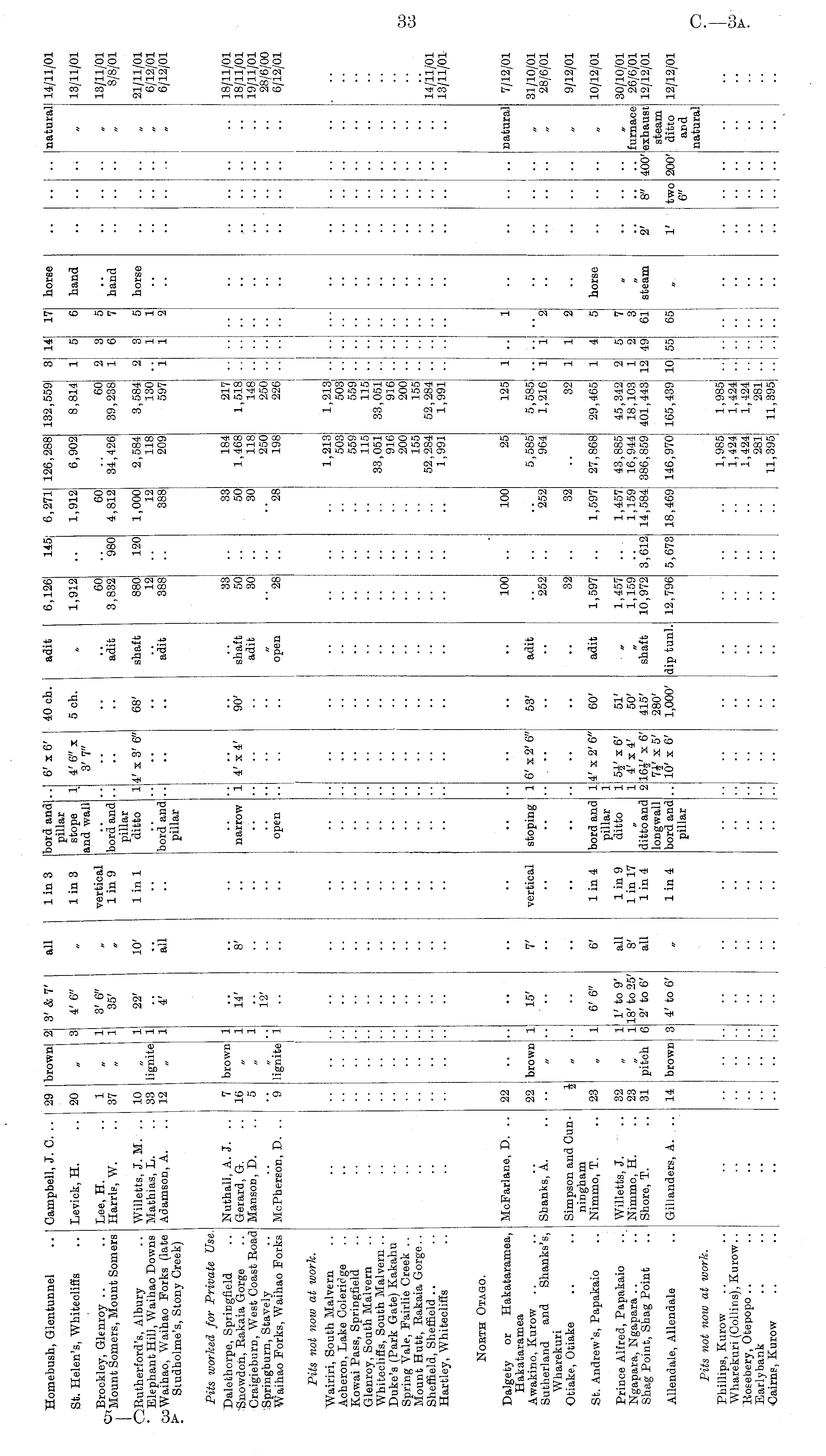 Homebush, Glentunnel Campbell, J. C, .. 29 brown 3'&7' all Iin3 bord and pillar stope and wall 6' x6' 10 ch adit U, J..4U Zα) , £oo\ l< A 17 horse natural 14/n/o: St. Helen's, Whitecliffs Levick, H. 20 4' 6" 1 in 3 1 4' 6" x 3'7" 5 ch. 1,912 1,912 6,902 8,814 5 6 hand 13/n/o: Brockley, Glenroy Mount Somers, Mount Somers OButherford's, Albury ' Elephant Hill, Waihao Downs CoWaihao, Waihao Forks (late f" Siudholme's, Stony Creek) Lee, H. Harris, W. 1 37 1 1 3' 6" 35' vertical 1 in 9 bord and pillar ditto adit 60 3,832 980 60 4,812 34,426 60 39,238 2 1 3 6 5 7 hand 13/n/o: 8/8/0: Willetts, J. M. .. Mathias, L. Adamson, A. 10 33 12 lignite 1 1 1 22' 10' 1 in 1 4' x 3' 6" 68' shaft 880 12 388 120 1,000 12 388 2,584 118 2091 3,584 130 597 2 3 1 1 5 1 2 horse 21/n/o: 6/12/0: 6/12/0: 4' all bord and pillar adit ■ • ■ Pits worked for Private Use. Daleihorpe, Springfield "Snowdoh, Rakaia Gorge Craigieburn, West Coast Boad Springburn, Stavely Waihao Forks, Waihao Forks Nuthall, A. J. .. Gerard, G. Maneon, D. 7 16 5 brown 1 1 1 14' 8' •• narrow 1 4' x4' 90' shaft adit 33 50 30 33 30 184 1,468 118 250 198 217 1,518 148 250 226 18/n/o: 18/n/o: 19/n/o: 28/6/01 6/12/0: 12' open open "28 "28 McPherson, D. .. 9 lignite 1 Pits not now at work. 1,213 503 559 115 33,051 916 200 155 52,284 1,991 Wairiri, South Malvern Acheron, Lake Coleridge Kowai Pass, Springfield Glenroy, South Malvern Whitecliffs, South Malvern .. Duke'a (Park Gate) Kakahu Spring Vale, Fairlie Creek .. Mount Hutt, Rakaia Gorge.. Sheffield, Sheffield Hartley, Whitecliffs 1,2131 503 559 115 33,051 916 200 155 52,284 1,991 14/ii/o: 13/n/o: •• North Otago. McFarlane, D. .. Dalgety or Hakataramea, Hakataramea Awakino, Kurow Sutherland and Shanke's, Wharekuri Otiake, Otiake Sbanks, A. 22 22 brown X l 15' V vertical •• stoping j •• 6' x 2' 6" 53' - adit 100 252 I 100 252 25 5,585 964 125 5,585 1,216 i "2 natural I 7/12/01 31/10/01 28/6/01 • • •• Simpson and Cunningham Nimmo, T. i 6' 6" 6' lin.4 bord and pillar ditto 4' x 2' 6" 60' adit 30 1,597 32 1,597 • • 27,868 32 29,465 1 2 5 horse " 9/12/01 St. Andrew's, Papakaio 23 1 1 1 1 2 10/12/01 Prince Alfred, Papakaio Ngapara, Ngapara Shag Point, Shag Point Willetts, J. Nimmo, H. Shore, T. 32 23 31 pitch 1 1 6 1' to 9' 18' to 25' 2' to 6' all 8' all Iin9 1 in 17 1 in 4 ditto and longwall bord and pillar 5J' x 6' 4' x 4' x 6' 7J' x 5' 10' x 6' 51' 50' 415' 280' 1,000' shaft 1,457 1,159 10,972 3,'612 1,457 1,159 14,584 43,885 16,944 386,859 45,342 18,103 401,443 2 1 12 5 2 49 7 3 61 steam 2' 8" 400' furnace exhaust steam ditto and natural 30/10/01 26/6/01 12/12/01 Allendale, Allendale Gillanders, A. 14 brown 4' to 6' 1 in 4 dip tunl. 12,796 5,6731 18,469 146,970 165,439 10 55 65 r two 6" 200' 12/12/01 Pits not now at work. 1,985 1,424 1,424 281 11,395 1,985 1,424 1,424 281 11,395 Phillips, Kurow Wharekuri (Collins), Kurow.. Kosebery, Otepopo .. Earlybank •Cairns, Kurow I • • • • .. ..
