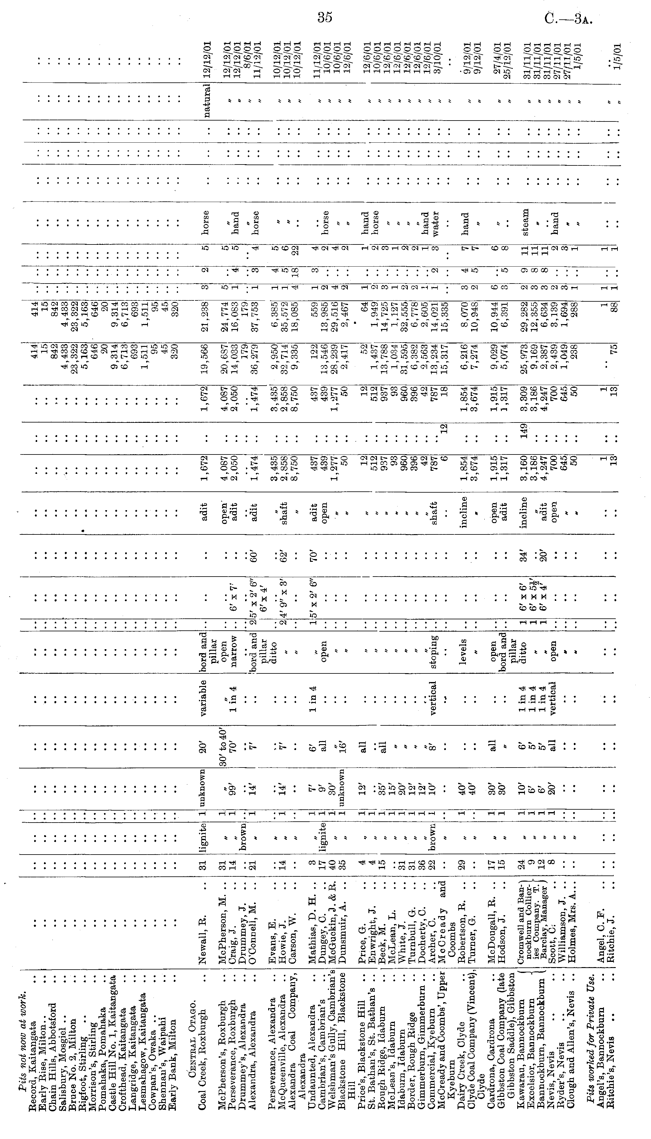 Pits not now at work. Record, Kaitangata Early Eise, Milton.. Chain Hills, Abbotsford Salisbury, Mosgiel Bruce No. 2, Milton Rigfoot, Stirling Morrison's, Stirling Pomahaka, Pomahaka Castle Hill No. 1, Kaitangata Crofthead, Kaitangata Langridge, Kaitangata Lesmahagow, Kaitangata .. Cowpan's, Owaka .. Shennan'e, Waipahi Early Bank, Milton •• - ■• ■■ 414 15 842 4,433 23,322 5,163 646 20 9,314 6,713 693 1,511 95 45 320 4141 15 842 4,433 23,322 5,1631 646' 20 9,314 6,713 693 1,511 95 45 320 Central Otago. Coal Creek, Eoxburgh Newall, E. lignite unknown 20' variable bord and pillar open narrow adit 1,672 1,672 19,566 21,238 horse natural 12/12/01 31 McPherson's, Roxburgh Perseverance, Eoxburgh Drummey's, Alexandra Alexandra, Alexandra McPherson, M. .. Craig, J. Drummey, J. O'Connell, M. .. 31 14 1 1 99' 30' to 40' 70' Ii'n4 •■ 6' x r open adit 4,087 2,050 4,087 2,050 20,6871 14,033 179 36,279 24,774 16,083 179 37,753 5 1 5 5 hand 12/12/01 12/12/01 8/6/01 11/12/01 brown 4 21 ! i 14' I bord and pillar ditto 2 5' x 2' 6" I 6'x4' 60' adit 1,474 1,474 1 3 •• 4 horse Perseverance, Alexandra McQueenville, Alexandra Alexandra Coal Company, Alexandra Undaunted, Alexandra Cambrian's, Cambrian's Welshman's Gully, Cambrian's Blackstone Hill, Blackstone Hill Price's, Blackstone Hill St. Bathan's, St. Bathan's .. Eough Eidge, Idaburn McLean's, Idaburn Idaburn, Idaburn Border, Eough Ridge Gimmerburn, Gimmerburn .. Commercial, Kyeburn McCready and Coombs', Upper Kyeburn Dairy Creek, Clyde Clyde Coal Company (Vincent), Clyde Cardrona, Cardrona Gibbston Coal Company (late Gibbston Saddle), Gibbston Kawarau, Bannockburn ( Excelsior, Bannockburn \ Bannockburn, Bannockburn [ Nevis, Nevis Eyder's, Nevis Clough and Allen's, Nevis .. Evans, E. Howie, J. Carson, W. 14 1 14' 2 4'9"'x3' 62' shaft 3,435 2,858 8,750 3,435 2,858 8,750 2,950 32,714 9,335 6,385 35,572 18,085 1 1 4 4 5 6 22 10/12/01 10/12/01 10/12/01 Mathias, D. H. .. Dungey, C. McGuckin,3.&E. Dunsmuir, A. 3 17 40 35 lignite 1 1 1 7' 9' 30' unknown 6' all 1 in 4 open 5' x 2' 6" 70' adit open 437 439 1,277 50 437 439 1,277 50 122 13,546 28,239 2,417 559 13,985 29,516 2,467 1 2 4 2 3 4 2 4 2 horse 11/12/01 10/6/01 10/6/01 12/6/01 " 16' Price, G. Enwright, 3. Beck, M. McLean, L. Wtute, J. Turnbull, G. Docherty, C. Archer, C. MoCready and Coombs Robertson, E. Turner, G. 4 4 15 1 1 1 1 1 1 1 1 12' all I 12 512 937 93 960 396 42 787 6 12 512 937 93 960; 396 42 787 18 52 1,437 13,788 1,034 31,595 6,382 2,563 13,234 15,317 64 1,949 14,725 1,127 32,555 6,778 2,605 14,021 15,335 hand horse 12/6/01 10/6/01 12/6/01 12/6/01 12/6/01 12/6/01 12/6/01 3/10/01 31 31 36 22 35' 15' 20' 12' 12' 10' all i - 3 1 •2 2 1 1 •• '" I 1 2 3 1 2 2 1 * * I brown 8' vertical stoping shaft A hand water "l2 29 40' 40' levels incline 1,854 3,674 1,8541 3,674 6,216 7,274 8,070 10,948 3 2 4 5 hand 9/12/01 9/12/01 McDougall, E. .. Hodson, J. 17 15 H 1 1 30' 30' all open bord and pillar ditto open adit 1,915 1,317 1,915J 1,317 9,029 5,074 10,944 6,391 6 3 5 6 8 27/4/01 25/12/01 Cromwell and Ban-"\ nockburn Collier- [ ies Company. T. [ Barclay, Manager ) Scott, C. Williamson, J. .. Holmes, Mrs. A... 24 9 12 8 n 1 1 1 1 10' 6' 6' 20' 6' 5' 5' all 1 in 4 1 in 4 1 in 4 vertical 1 1 1 6' x6' 6' x 5|' 6'x4' 34' 20' incline adit 3,160 3,186 4,247 700 645 50 149 3,309 3,186 4,247 700 645! 50 25,973 9,169 2,387 2,439 1,049 238 29,282 12,355 6,634 3,139 1,694 288 2 3 3 2 3 1 8 11 11 11 2 3 1 steam 31/11/01 31/11/01 31/11/01 27/11/01 27/11/01 1/5/01 open open hand ■• n> • • IV .. Pits worked for Private Use. Angel's, Bannockburn Ritchie's, Nevis Angel, C. F. Ritchie, J. 1 88 1/5/01 1 13 1 13 75l 1 1 1 1 I .. .. I I .. ' .. I I .. '01