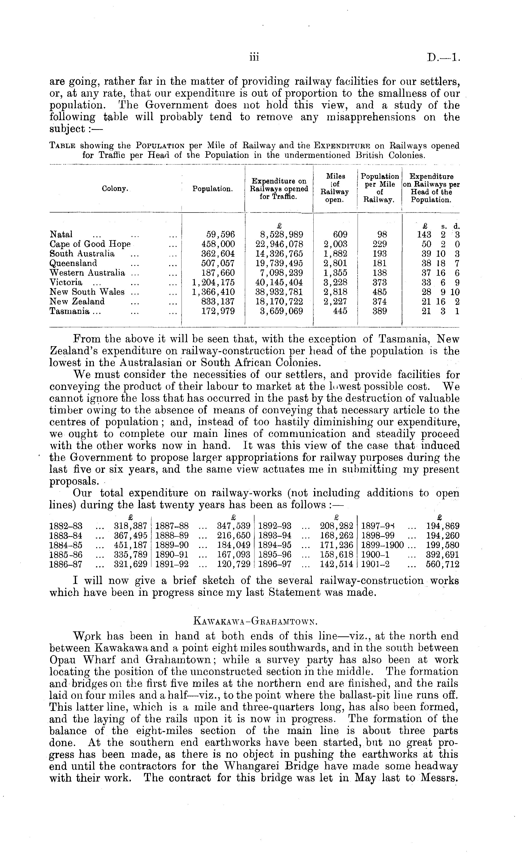From the above it will be seen that, with the exception of Tasmania, New Zealand's expenditure on railway-construction per head of the population is the lowest in the Australasian or South African Colonies. We must consider the necessities of our settlers, and provide facilities for conveying the product of their labour to market at the 1-west possible cost. We cannot ignore the loss that has occurred in the past by the destruction of valuable timber owing to the absence of means of conveying that necessary article to the centres of population; and, instead of too hastily diminishing our expenditure, we ought to complete our main lines of communication and steadily proceed with the other works now in hand. It was this view of the case that induced the Government to propose larger appropriations for railway purposes during the last five or six years, and the same view actuates me in submitting my present proposals. Our total expenditure on railway-works (not including additions to open lines) during the last twenty years has been as follows :— £ i £ £ I £ 1882-83 ... 318,387 ! 1887-88 ... 347,539 1892-93 ... 208,282 1897-9 i ... 194,869 1883-84 ... 367,495 11888-89 ... 216,650 1893-94 ... 168,262 1898-99 ... 194,260 1884-85 ... 451,187 1889-90 ... 184,049 1894-95 ... 171,236 1899-1900... 199,580 1885-86 ... 335,789 1890-91 ... 167,093 1895-96 ... 158,618 1900-1 ... 392,691 1886-87 ... 321,629 1891-92 ... 120,729 1896-97 ... 142,514 1901-2 ... 560,712 I will now give a brief sketch of the several railway-construction works which have been in progress since my last Statement was made. Kawakawa-Grahamtown. Wprk has been in hand at both ends of this line—viz., at the north end between Kawakawa and a point eight miles southwards, and in the south between Opau Wharf and Grahamtown; while a survey party has also been at work locating the position of the unconstructed section in the middle. The formation and bridges on the first five miles at the northern end are finished, and the rails laid on four miles and a half—viz., to the point where the ballast-pit line runs off. This latter line, which is a mile and three-quarters long, has also been formed, and the laying of the rails upon it is now in progress. The formation of the balance of the eight-miles section of the main line is about three parts done. At the southern end earthworks have been started, but no great progress has been made, as there is no object in pushing the earthworks at this end until the contractors for the Whangarei Bridge have made some headway with their work. The contract for this bridge was let in May last to Messrs.