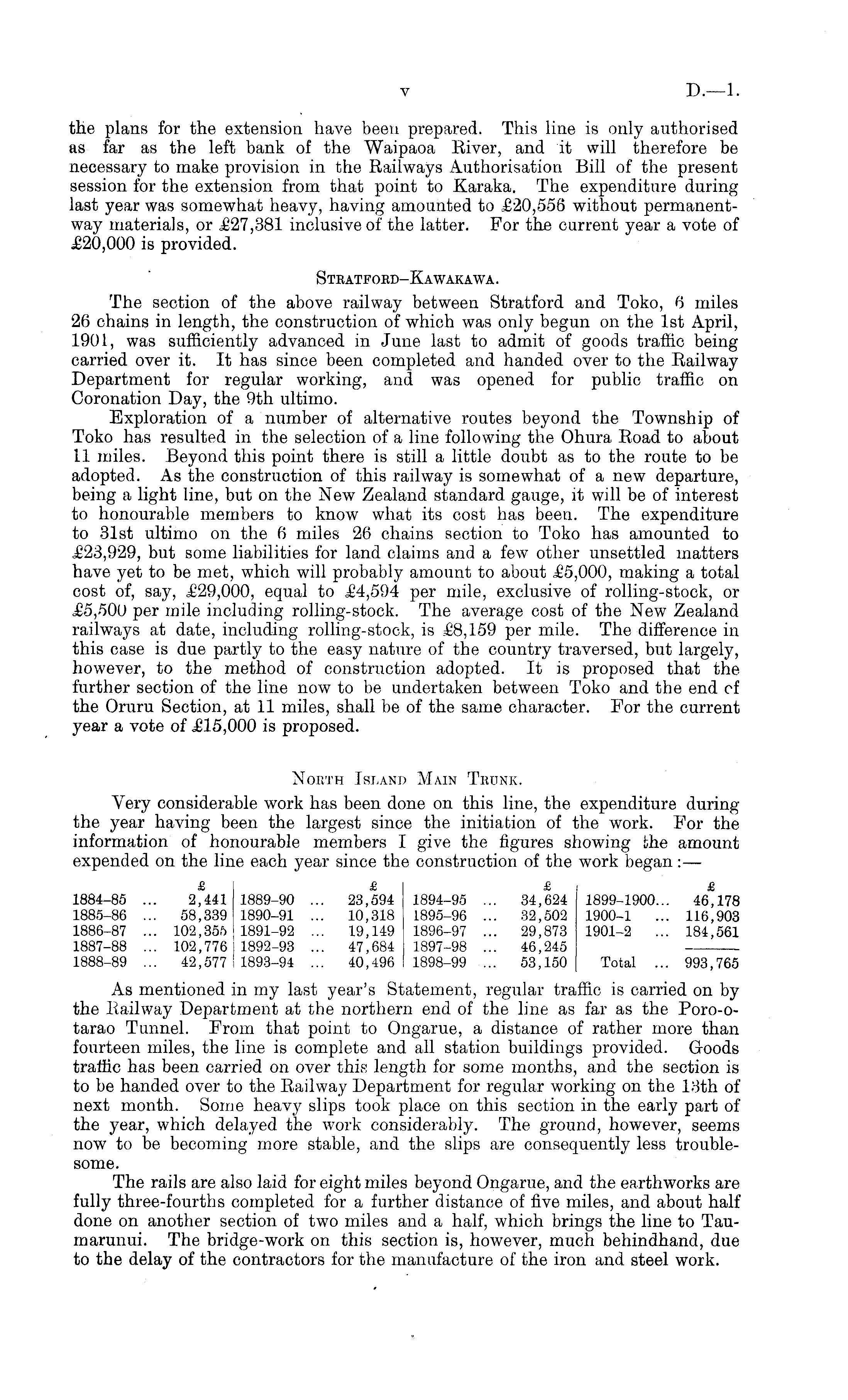 the plans for the extension have been prepared. This line is only authorised as far as the left bank of the Waipaoa River, and it will therefore be necessary to make provision in the Railways Authorisation Bill of the present session for the extension from that point to Karaka. The expenditure during last year was somewhat heavy, having amounted to £20,556 without permanentway materials, or £27,381 inclusive of the latter. For the current year a vote of £20,000 is provided. Stratford-Kawakawa. The section of the above railway between Stratford and Toko, 6 miles 26 chains in length, the construction of which was only begun on the Ist April, 1901, was sufficiently advanced in June last to admit of goods traffic being carried over it. It has since been completed and handed over to the Railway Department for regular working, and was opened for public traffic on Coronation Day, the 9th ultimo. Exploration of a number of alternative routes beyond the Township of Toko has resulted in the selection of a line following the Ohura Road to about 11 miles. Beyond this point there is still a little doubt as to the route to be adopted. As the construction of this railway is somewhat of a new departure, being a light line, but on the New Zealand standard gauge, it will be of interest to honourable members to know what its cost has been. The expenditure to 31st ultimo on the 6 miles 26 chains section to Toko has amounted to £23,929, but some liabilities for land claims and a few other unsettled matters have yet to be met, which will probably amount to about £5,000, making a total cost of, say, £29,000, equal to £4,594 per mile, exclusive of rolling-stock, or £5,500 per mile including rolling-stock. The average cost of the New Zealand railways at date, including rolling-stock, is £8,159 per mile. The difference in this case is due partly to the easy nature of the country traversed, but largely, however, to the method of construction adopted. It is proposed that the further section of the line now to be undertaken between Toko and the end of the Oruru Section, at 11 miles, shall be of the same character. For the current year a vote of £15,000 is proposed. North Island Main Trunk. Very considerable work has been done on this line, the expenditure during the year having been the largest since the initiation of the work. For the information of honourable members I give the figures showing the amount expended on the line each year since the construction of the work began: — £ £ £ £ 1884-85 ... 2,441 1889-90 ... 23,594 1894-95 ... 34,624 1899-1900... 46,178 1885-86 ... 58,339 1890-91 ... 10,318 1895-96 ... 32,502 1900-1 ... 116,903 1886-87 ... 102,355 1891-92 ... 19,149 1896-97 ... 29,873 1901-2 ... 184,561 1887-88 ... 102,776 1892-93 ... 47,684 1897-98 ... 46,245 . 1888-89 ... 42,577 1893-94 ... 40,496 1898-99 ... 53,150 Total ... 993,765 As mentioned in my last year's Statement, regular traffic is carried on by the R ail way Department at the northern end of the line as far as the Poro-o-tarao Tunnel. From that point to Ongarue, a distance of rather more than fourteen miles, the line is complete and all station buildings provided. Goods traffic has been carried on over this length for some months, and the section is to be handed over to the Railway Department for regular working on the 13th of next month. Some heavy slips took place on this section in the early part of the year, which delayed the work considerably. The ground, however, seems now to be becoming more stable, and the slips are consequently less troublesome. The rails are also laid for eight miles beyond Ongarue, and the earthworks are fully three-fourths completed for a further distance of five miles, and about half done on another section of two miles and a half, which brings the line to Taumarunui. The bridge-work on this section is, however, much behindhand, due to the delay of the contractors for the manufacture of the iron and steel work.