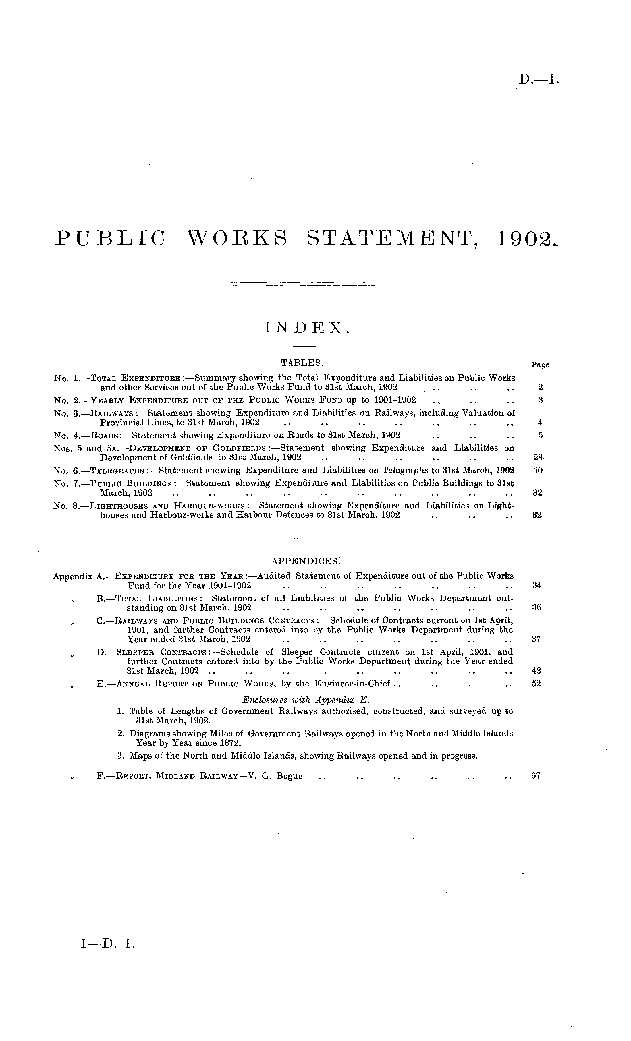 TABLES. Pa gs No. I.—Total Expenditure:—Summary showing the Total Expenditure and Liabilities on Public Works and other Services out of the Public Works Fund to 31st March, 1902 .. .. .. 2 No. 2.—Yearly Expenditure out op the Public Works Fund up to 1901-1902 .. .. .. 3 No. 3.—Railways :—Statement showing Expenditure and Liabilities on Railways, including Valuation of Provincial Lines, to 31st March, 1902 .. .. .. .. .. .. .. 4 No. 4.—Roads:—Statement showing Expenditure on Roads to 31st March, 1902 .. .. .. 5 Nos. 5 and sa.—Development of Goldfields :—Statement showing Expenditure and Liabilities on Development of Goldfields to 31st March, 1902 .. .. .. .. .. .. 28 No. 6.—Telegraphs:—Statement showing Expenditure and Liabilities on Telegraphs to 31st March, 1902 30 No. 7.—Public Buildings :—Statement showing Expenditure and Liabilities on Public Buildings to 31st March, 1902 .. .. .. .. .. .. .. .. .. .. 32 No. 8. —Lighthouses and Harbour-works :—Statement showing Expenditure and Liabilities on Lighthouses and Harbour-works and Harbour Defences to 31st March, 1902 .. .. .. 32. appendices: Appendix A.—Expenditure for the Year :—Audited Statement of Expenditure out of the Public Works Fund for the Year 1901-1902 .. .. .. .. .. .. .. 34 , B.—Total Liabilities :—Statement of all Liabilities of the Public Works Department outstanding on 31st March, 1902 .. .. .. .. .. .. .. 36 C —Railways and Public Buildings Contracts :— Schedule of Contracts current on Ist April, 1901, and further Contracts entered into by the Public Works Department during the Year ended 31st March, 1902 .. .. .. .. .. .. .. 37 D.—Sleeper Contracts:—Schedule of Sleeper Contracts current on Ist April, 1901, and further Contracts entered into by the Public Works Department during the Year ended 31st March, 1902 .. .. .. .. .. .. .. .. .. 43 E.—Annual Report on Public Works, by the Engineer-in-Chief .. .. ... .. 52 Enclosures with Appendix E. 1. Table of Lengths of Government Railways authorised, constructed, and surveyed up to 31st March, 1902. 2. Diagrams showing Miles of Government Railways opened in the North and Middle Islands Year by Year since 1872. 3. Maps of the North and Middle Islands, showing Railways opened and in progress. F.—Report, Midland Railway—V. G. Bogue .. .. .. .. .. .. 67