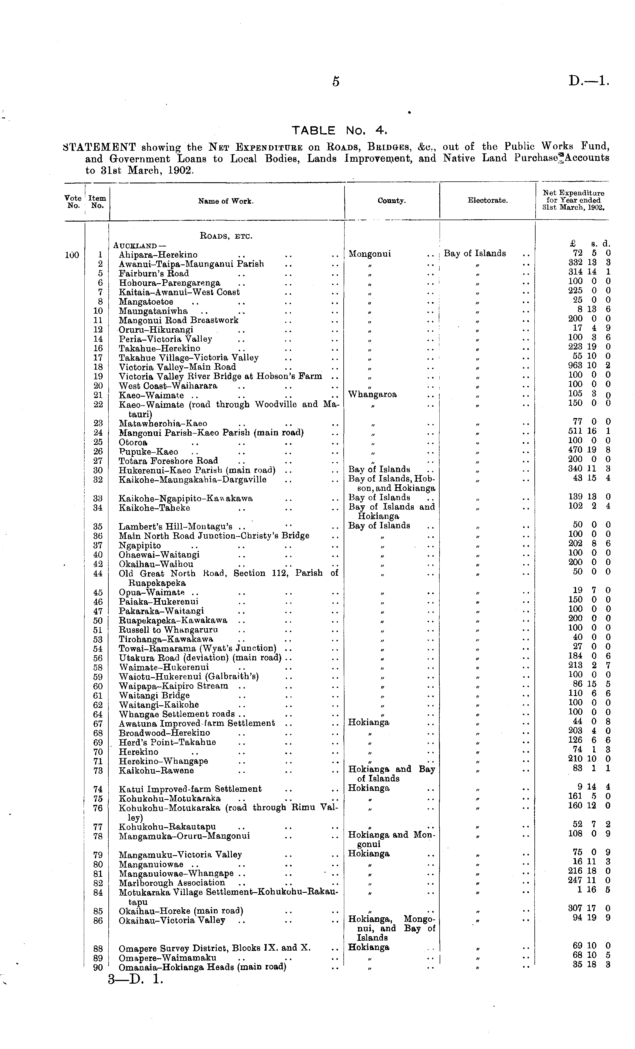 TABLE No. 4. STATEMENT showing the Net Expenditure on Roads, Bridges, &c., out of the Public Works Fund, and Government Loans to Local Bodies, Lands Improvement, and Native Land Purchase Accounts to 31st March, 1902.