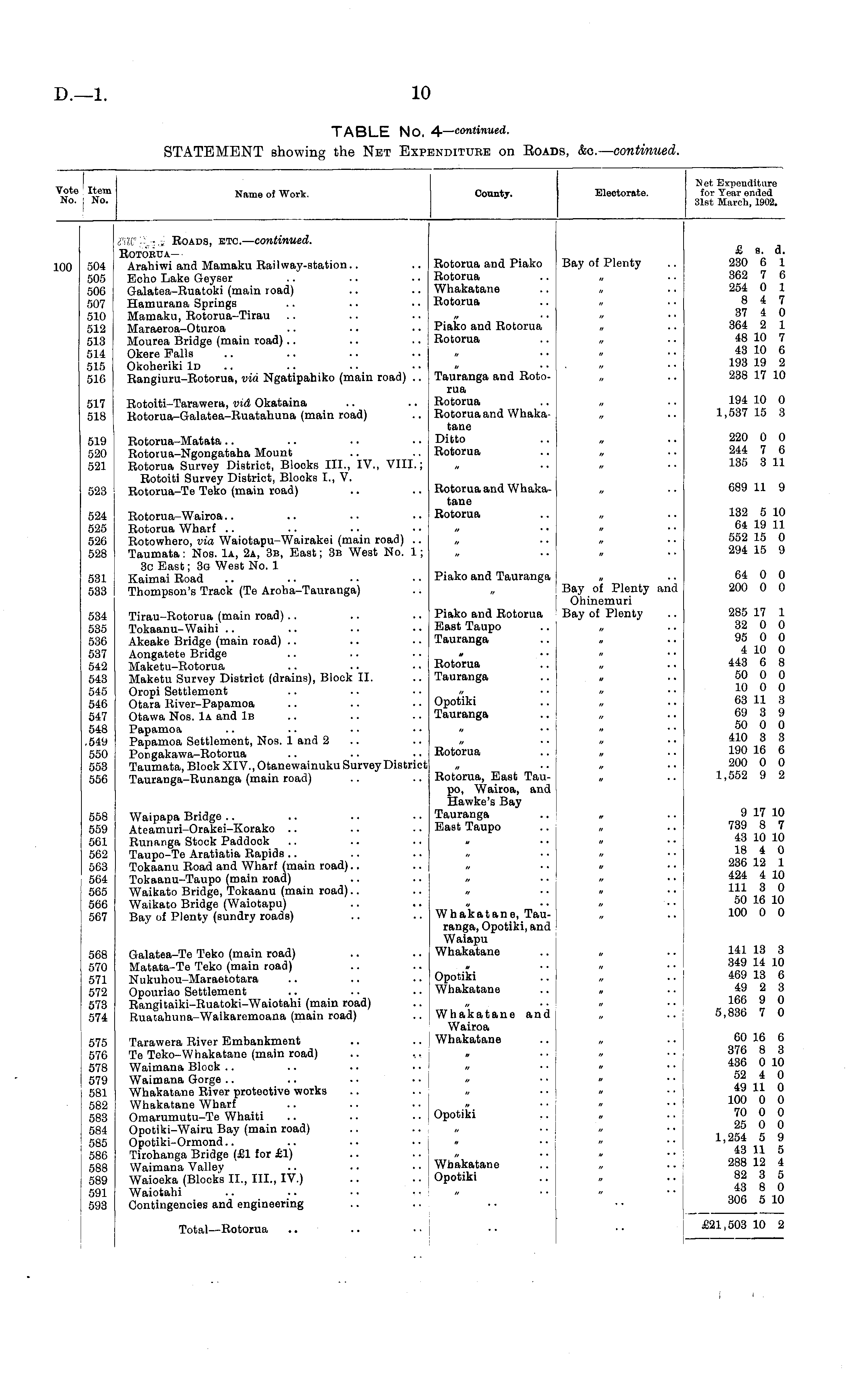 | Vote Item No. , No. Name of Work. County. Electorate. Net Expenditure for Year ended 31st March, 1902. .00 504 505 506 507 510 512 513 514 515 516 fflJPfvis Roads, etc.— continued. RotoruaArahiwi and Mamaku Railway-station.. Echo Lake Geyser Galatea-Ruatoki (main road) Hamurana Springs Mamaku, Rotorua-Tirau Maraeroa-Oturoa Mourea Bridge (main road) Okere Falls Okoheriki Id Rangiuru-Rotorua, vid Ngatipahiko (main road) .. Rotorua and Piako Rotorua Whakatane Rotorua Piako and Rotorua Rotorua Bay of Plenty £ s. d. 230 6 1 362 7 6 254 0 1 8 4 7 37 4 0 364 2 1 48 10 7 43 10 6 193 19 2 238 17 10 517 518 Rotoiti-Tarawera, vid Okataina Rotorua-Galatea-Ruatahuna (main road) Tauranga and Rotorua Rotorua Rotorua and Whakatane Ditto Rotorua 194 10 0 1,537 15 3 519 520 521 Rotorua-Matata Rotorua-Ngongataha Mount Rotorua Survey District, Blocks III., IV., VIII.; Rotoiti Survey District, Blocks I., V. Rotorua-Te Teko (main road) 220 0 0 244 7 6 135 3 11 523 Rotorua and Whakatane Rotorua 689 11 9 524 525 526 528 Rotorua-Wairoa Rotorua Wharf Rotowhero, via Waiotapu-Wairakei (main road) .. Taumata: Nos. 1a, 2a, 3b, East; 3b West No. 1; 3c East; 3g West No. 1 Kaimai Road Thompson's Track (Te Aroha-Tauranga) 132 5 10 64 19 11 552 15 0 294 15 9 531 533 Piako and Tauranga Bay of Plenty and Ohinemuri Bay of Plenty 64 0 0 200 0 0 534 535 536 537 542 543 545 546 547 548 .549 550 553 556 Tirau-Rotorua (main road) Tokaanu-Waihi Akeake Bridge (main road) Aongatete Bridge Maketu-Rotorua Maketu Survey District (drains), Block II. Oropi Settlement Otara River-Papamoa Otawa Nos. 1a and 1b Papamoa Papamoa Settlement, Nos. 1 and 2 .. Por gakawa-Rotorua Taumata, Block XIV., Otanewainuku Survey District Tauranga-Runanga (main road) Piako and Rotorua East Taupo Tauranga Rotorua Tauranga Opotiki Tauranga 285 17 1 32 0 0 95 0 0 4 10 0 443 6 8 50 0 0 10 0 0 63 11 3 69 3 9 50 0 0 410 3 3 190 16 6 200 0 0 1,552 9 2 Rotorua 558 559 561 562 563 564 565 566 567 Waipapa Bridge Ateamuri-Orakei-Korako Runanga Stock Paddock Taupo-Te Aratiatia Rapids Tokaanu Road and Wharf (main road) Tokaanu-Taupo (main road) Waikato Bridge, Tokaanu (main road) Waikato Bridge (Waiotapu) Bay of Plenty (sundry roads) Rotorua, East Taupo, Wairoa, and Hawke's Bay Tauranga East Taupo 9 17 10 739 8 7 43 10 10 18 4 0 236 12 1 424 4 10 111 3 0 50 16 10 100 0 0 Whakatane, Tauranga, Opotiki, and Waiapu Whakatane 568 570 571 572 573 574 Galatea-Te Teko (main road) Matata-Te Teko (main road) Nukuhou-Maraetotara Opouriao Settlement Rangitaiki-Ruatoki-Waiotahi (main road) Ruatahuna-Waikaremoana (main road) Opotiki Whakatane 141 13 3 349 14 10 469 13 6 49 2 3 166 9 0 5,836 7 0 Whakatane and Wairoa Whakatane 575 576 578 579 581 582 583 584 585 586 588 589 591 593 Tarawera River Embankment Te Teko-Whakatane (main road) Waimana Block .. .. .. • • ' Waimana Gorge .. .. .. Whakatane River protective works Whakatane Wharf .. .. .. Omarumutu-Te Whaiti .. .. • • J Opotiki-Wairu Bay (main road) Opotiki-Ormond.. Tirohanga Bridge (£1 for £1) Waimana Valley .. .. Waioeka (Blocks II., III., IV.) .. .. Waiotahi Contingencies and engineering " Opotiki 60 16 6 376 8 3 436 0 10 52 4 0 49 11 0 100 0 0 70 0 0 25 0 0 1,254 5 9 43 11 5 288 12 4 82 3 5 43 8 0 306 5 10 Whakatane Opotiki Total—Rotorua £21,503 10 2