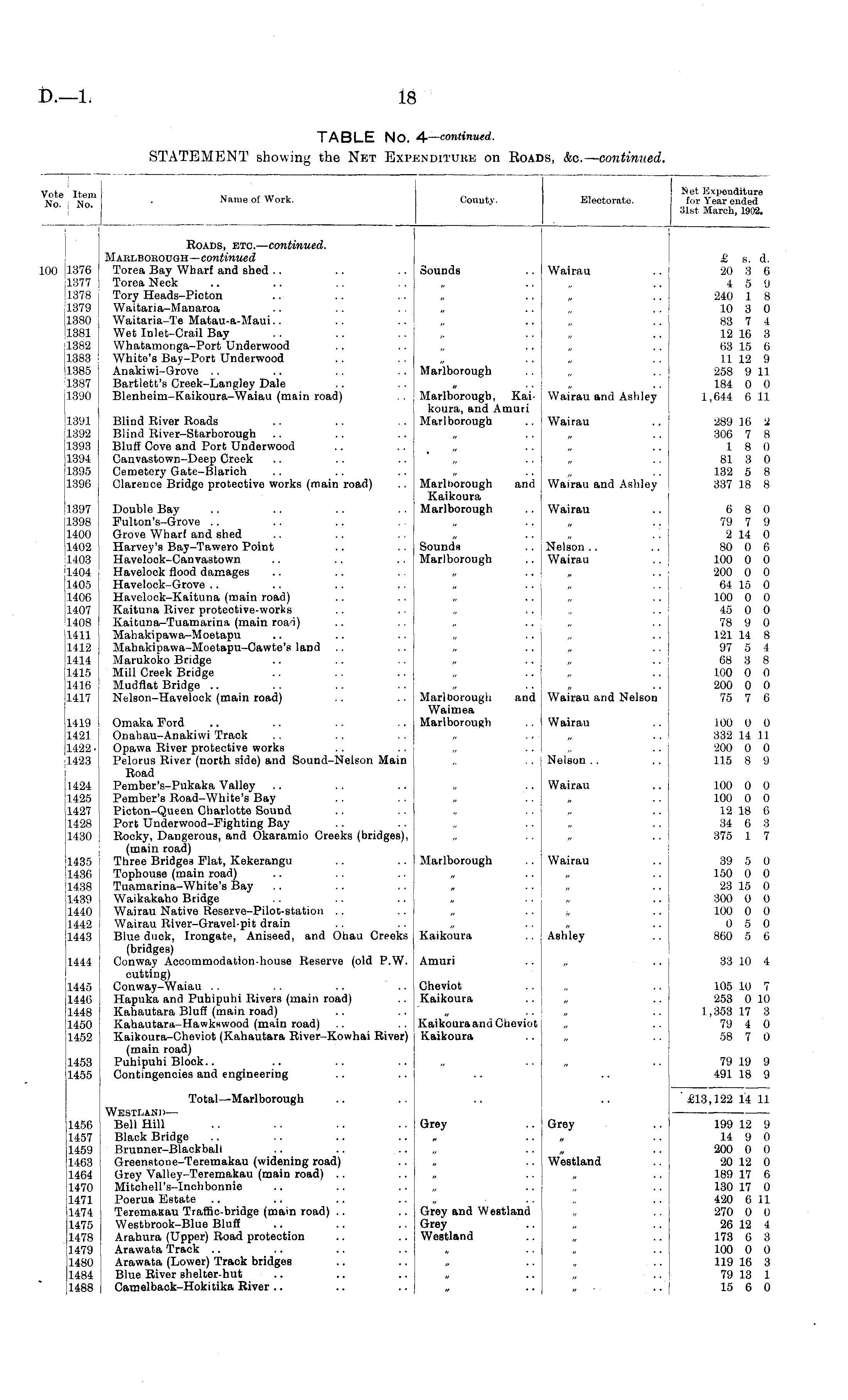 Vote No. Item No. Name of Work. County Electorate. Net Expenditure for Year ended 31st March, 1902. IK! 1376 1377 1378 1379 1380 1381 1382 1383 1385 1387 1390 Roads, etc. — continued. Marlborough— continued Torea Bay Wharf and shed Torea Neck Tory Heads-Pioton Waitaria-Manaroa Waitaria-Te Matau-a-Maui Wet Inlet-Crail Bay Whatamonga-Port Underwood White's Bay-Port Underwood Anakiwi-Grove Bartlett's Creek-Langley Dale Blenheim-Kaikoura-Waiau (main road) Sounds Wairau £ s. d. 20 3 6 4 5 9 240 1 8 10 8 0 83 7 4 12 16 3 63 15 6 11 12 9 258 9 11 184 0 0 1,644 6 11 Marlborough Marlborough, Kaikoura, and Amuri Marlborough Wairau and Ashley 1391 1392 1393 1394 1395 1396 Blind River Roads Blind River-Starborough Bluff Cove and Port Underwood Canvastown-Deep Creek Cemetery Gate-Blarich Clarence Bridge protective works (main road) Wairau 289 16 2 306 7 8 1 8 0 81 3 0 132 5 8 337 18 8 Marloorough and Kaikoura Marlborough Wairau and Ashley 1397 1398 1400 1402 1403 1404 1405 1406 1407 1408 1411 1412 1414 1415 1416 1417 Double Bay Fulton's-Grove Grove Wharf and shed Harvey's Bay-Tawero Point Havelock-Canvastown Havelock flood damages Havelock-Grove Havelock-Kaituna (main road) Kaituna River protective-works Kaituna-Tuamarina (main roan) Mahakipawa—Moetapu Mahakipawa-Moetapu-Cawte's land Marukoko Bridge Mill Creek Bridge Mudflat Bridge Nelson-Havelock (main road) Sounds Marlborough Wairau Nelson Wairau 6 8 0 79 7 9 2 14 0 80 0 6 100 0 0 200 0 0 64 15 0 100 0 0 45 0 0 78 9 0 121 14 8 97 5 4 68 3 8 100 0 0 200 0 0 75 7 6 Marlborough and Waimea Marlborough Wairau and Nelson 1419 1421 1422. 1423 Omaka Ford Onahau-Anakiwi Track Opawa River protective works Pelorus River (north side) and Sound-Nelson Main Road Pember's-Pukaka Valley Pember's Road-White's Bay Picton-Queen Charlotte Sound Port Underwood-Fighting BayRocky, Dangerous, and Okaramio Creeks (bridges), (main road) Three Bridges Flat, Kekerangu Tophouse (main road) Tuamarina-White's Bay Waikakaho Bridge Wairau Native Reserve-Pilot-station Wairau River-Gravel-pit drain Blue duck, Irongate, Aniseed, and Obau Creeks (bridges) Conway Accommodation-house Reserve (old P.W. cutting) Conway-Waiau Hapuka and Puhipuhi Rivers (main road) Kahautara Bluff (main road) Kahautara-Hawkswood (main road) Kaikoura-Cheviot (Kahautara River-Kowhai River) (main road) Puhipuhi Block.. Contingencies and engineering Wairau 100 0 0 332 14 11 200 0 0 115 8 9 Nelson 1424 1425 1427 1428 1430 Wairau 100 0 0 100 0 0 12 18 6 34 6 3 375 1 7 1435 1436 1438 1439 1440 1442 1443 Marlborough Wairau 39 5 0 150 0 0 23 15 0 300 0 0 100 0 0 0 5 0 860 5 6 Kaikoura Ashley 1444 Amuri 33 10 4 1445 1446 1448 1450 1452 Cheviot Kaikoura 105 10 7 253 0 10 1,353 17 3 79 4 0 58 7 0 Kaikoura and Cheviot Kaikoura 1453 1455 79 19 9 491 18 9 Total —Marlborough ' £13,122 14 11 1456 1457 1459 1463 1464 1470 1471 1474 1475 1478 1479 1480 1484 Westland— Bell Hill Black Bridge Brunner-Blackball Greenstone-Teremakau (widening road) Grey Valley-Teremakau (main road) Mitchell's-Inchbonnie Poerua Estate TeremaEau Traffic-bridge (main road) Westbrook-Blue Bluff Arahura (Upper) Road protection Arawata Track Arawata (Lower) Track bridges Blue River shelter-hut Camelback-Hokitika River .. Grey Grey and Westland Grey Westland Grey Westland 199 12 9 14 9 0 200 0 0 20 12 0 189 17 6 130 17 0 420 6 11 270 0 0 26 12 4 173 0 3 100 0 0 119 16 3 79 13 1