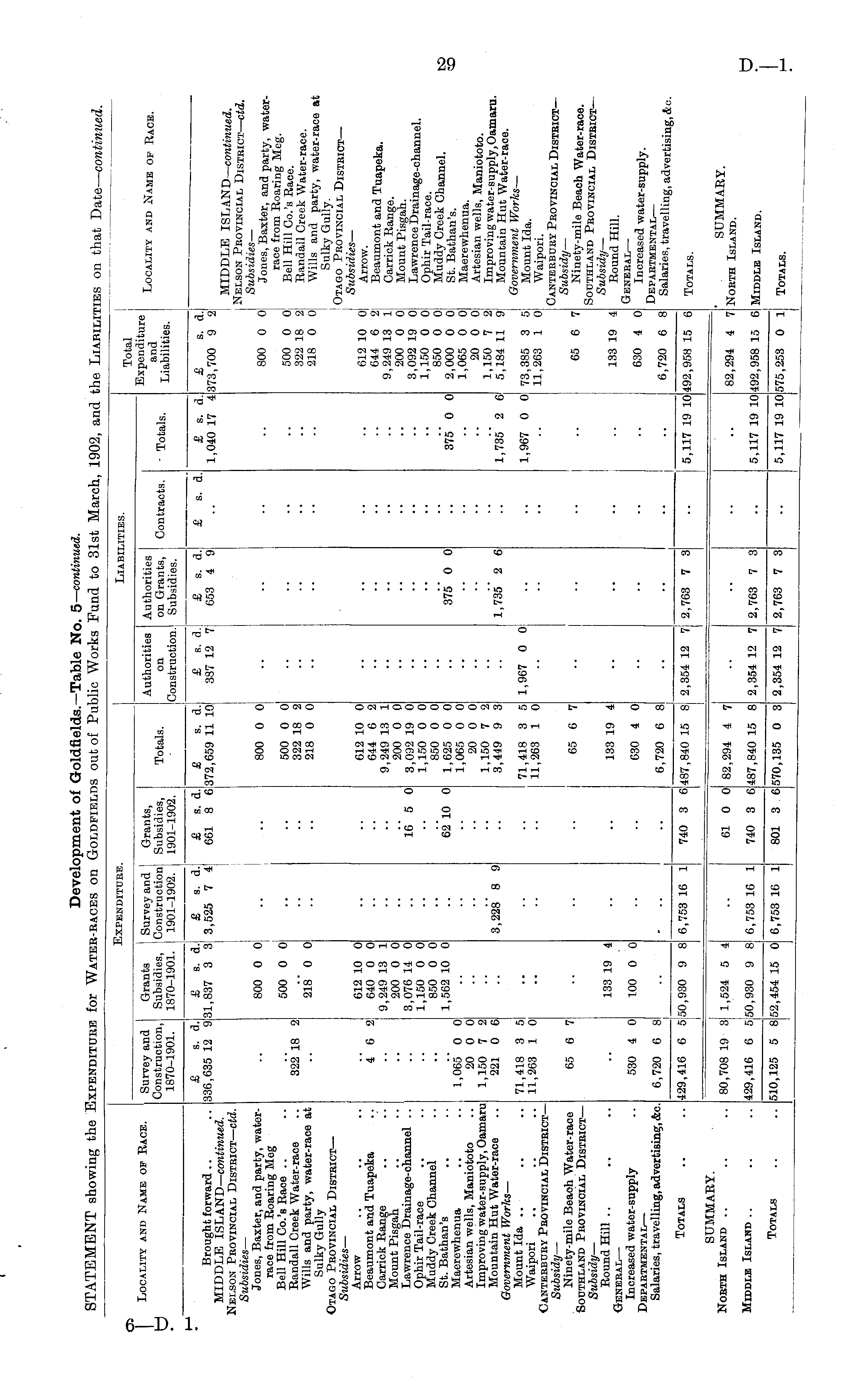 Locality and Name of Race. i Expenditure. Liabilities. Total Expenditure and Liabilities. Survey and Construction, 1870-1901. Grants Subsidies, 1870-1901. Survey and Construction 1901-1902. Grants, Subsidies, 1901-1902. Totals. Authorities on Construction.' Authorities on Grants, Subsidies. Contracts. • Totals. Locality and Name of Race. £ s. d. 336,635 12 91 £ s. a. 31,837 3 3 £ s. d. 3,525 7 4 £ s. a. 661 8 6 £ s. a. 372,659 11 10 £ s. d. 387 12 7 £ s. d. 653 4 9 £ s. a. £ s. d. 1,040 17 4 Brought forward .. .. : MIDDLE ISLAND— continued. Nelson Provincial District — ctd. Subsidies — Jones, Baxter, and party, waterrace from Roaring Meg Bell Hill Co.'s Race .. Randall Creek Water-race Wills and party, water-race at Sulky Gully Otago Provincial District — Subsidies — Arrow Beaumont and Tuapeka Carrick Range Mount Pisgah Lawrence Drainage-channel .. Ophir Tail-race Muddy Creek Channel St. Bathan's Maerewhenua Artesian wells, Maniototo Improving water-supply, Oamaru Mountain Hut Water-race Government Works — Mount Ida Waipori Canterbury Provincial District — Subsidy — Ninety-mile Beach Water-race Southland Provincial District — Subsidy — Round Hill General — Increased water-supply Departmental — Salaries, travelling, advertising, &c. £ s. a. 373,700 9 2 322' 18 2J 46 2 I 1,065 0 0 20 0 0 1,150 7 2 221 0 6 800 0 0 500 0 0 218 0 0 612 10 0 640 0 0 9,249 13 1 200 0 0 3,076 14 0 1,150 0 0 850 0 0 1,562 10 0 - i - 16 5 0 6210 0 800 0 0 500 0 0 322 18 2 218 0 0 612 10 0 644 6 2 9,249 13 1 200 0 0 3,092 19 0 1,150 0 0 850 0 0 1,625 0 0 1,065 0 0 20 0 0 1,150 7 2 3,449 9 3 375' 0 0 375' 0 0 800 0 0 500 0 0 322 18 2 218 0 0 612 10 0 644 6 2 9,249 13 1 200 0 0 3,092 19 0 1,150 0 0 850 0 0 2,000 0 0 1,065 0 0 20 0 0 1,150 7 2 5,184 11 9 MIDDLE ISLAND— continued. Nelson Provincial District — ctd. Subsidies — Jones, Baxter, and party, waterrace from Roaring Meg. Bell Hill Co.'s Race. Randall Creek Water-race. Wills and party, water-race at Sulky Gully. Otago Provincial District — Subsidies — Arrow. Beaumont and Tuapeka. Carrick Range. Mount Pisgah. Lawrence Drainage-channel. Ophir Tail-race. Muddy Creek Channel. St. Bathan's. Maerewhenua. Artesian wells, Maniototo. Improving water-supply, Oamaru. Mountain Hut Water-race. Government Works — Mount Ida. Waipori. Canterbury Provincial District— Subsidy — Ninety-mile Beach Water-race. Southland Provincial District — Subsidy — Round Hill. General — Increased water-supply. Departmental — Salaries, travelling, advertising, A:c. " 3,228' 8 9 1,735' 2 6 1,735' 2 6! 71,418 3 5| 11,263 1 0| .. i 71,418 3 5 11,263 1 0 1,967 0 0 1,967 0 0! 73,385 3 5 11,263 1 0 1 65 6 7 I 65 6 7 I I 65 6 7 133 19 4 133 19 4 133 19 4 530 4 0 100 0 0 630 4 0 630 4 0 6,720 6 8 - .. I I 6,720 6 8 I .. 6,720 6 8 Totals 429,416 6 5 50,930 9 8 6,753 16 1 740 3 6 487,840 15 8| 2,354 12 7 2,763 7 8 Totals. 5,117 19 10 1492,958 15 6 SUMMARY. North Island ~ 80,708 19 3 SUMMARY. North Island. j 1,524 5 4 - 61 0 0 82,294 4 7 82,294 4 7 •• - - Middle Island 429,416 6 5 50,930 9 8 6,753 16 1 740 3 6 487,840 15 8 2,354 12 7 2,763 7 3 5,117 19 10 492,958 15 6 Middle Island. Totals 801 3 6 2,763 7 3 510,125 5 8 52,454 15 0 6,753 16 1 ! 570,135 0 3 2,354 12 7 •• 5,117 19 10 575,253 0 1 Totals.