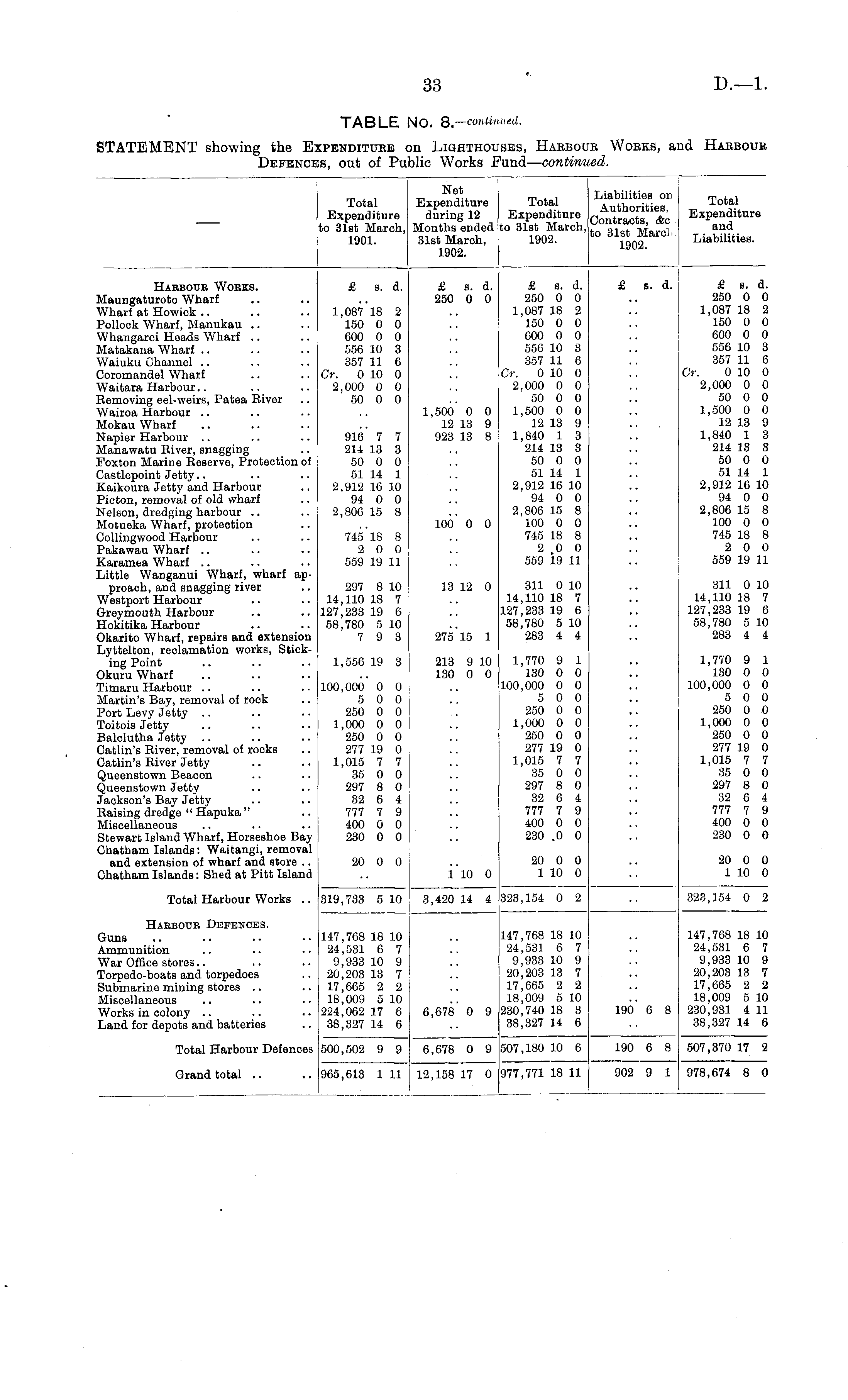 Total Expenditure to 31st March, 1901. Net Expenditure during 12 Months ended 31st March, 1902. Total Expenditure to 31st March. 1902. Liabilities or Authorities. Contracts, &c to 31st Marcl 1902. Total Expenditure and Liabilities. Harbour Works. Maungaturoto Wharf Wharf at Howick Pollock Wharf, Manukau Whangarei Heads Wharf Matakana Wharf Waiuku Channel Coromandel Wharf Waitara Harbour Removing eel-weirs, Patea River Wairoa Harbour Mokau Wharf Napier Harbour Manawatu River, snagging Foxton Marine Reserve, Protection of Castlepoint Jetty Kaikoura Jetty and Harbour Picton, removal of old wharf Nelson, dredging harbour Motueka Wharf, protection Collingwood Harbour Pakawau Wharf Karamea Wharf Little Wanganui Wharf, wharf approach, and snagging river Westport Harbour Greymouth Harbour Hokitika Harbour Okarito Wharf, repairs and extension Lyttelton, reclamation works, Sticking Point Okuru Wharf Timaru Harbour Martin's Bay, removal of rock Port Levy Jetty Toitois Jetty Balclutha Jetty Catlin's River, removal of rocks Catlin's River Jetty Queenstown Beacon Queenstown Jetty Jackson's Bay Jetty Raising dredge " Hapuka " Miscellaneous Stewart Island Wharf, Horseshoe Bay Chatham Islands: Waitangi, removal and extension of wharf and store .. Chatham Islands: Shed at Pitt Island £ s. d. £ s. d. 250 0 0 £ s. d. 250 0 0 1,087 18 2 150 0 0 600 0 0 556 10 3 357 11 6 Cr. 0 10 0 2,000 0 0 50 0 0 1,500 0 0 12 13 9 1,840 1 3 214 13 3 50 0 0 51 14 1 2,912 16 10 94 0 0 2,806 15 8 100 0 0 745 18 8 2 0 0 559 19 11 £ s. d. £ s. a. 250 0 0 1,087 18 2 150 0 0 600 0 0 556 10 3 357 11 6 Cr. 0 10 0 2,000 0 0 50 0 0 1,500 0 0 12 13 9 1,840 1 3 214 13 3 50 0 0 51 14 1 2,912 16 10 94 0 0 2,806 15 8 100 0 0 745 18 8 2 0 0 559 19 11 1,087 18 2 150 0 0 600 0 0 556 10 3 357 11 6 Cr. 0 10 0 2,000 0 0 50 0 0 1,500 0 0 12 13 9 923 13 8 916 7 7 214 13 3 50 0 0 51 14 1 2,912 16 10 94 0 0 2,806 15 8 100' 0 0 745 18 8 2 0 0 559 19 11 297 8 10 14,110 18 7 127,233 19 6 58,780 5 10 7 9 3 13 12 0 311 0 10 14,110 18 7 127,233 19 6 58,780 5 10 283 4 4 811 0 10 14,110 18 7 127,233 19 6 58,780 5 10 283 4 4 275 15 1 1,556 19 3 100,000 0 0 5 0 0 250 0 0 1,000 0 0 250 0 0 277 19 0 1,015 7 7 35 0 0 297 8 0 32 6 4 777 7 9 400 0 0 230 0 0 213 9 10 130 0 0 1,770 9 1 130 0 0 100,000 0 0 5 0 0 250 0 0 1,000 0 0 250 0 0 277 19 0 1,015 7 7 35 0 0 297 8 0 32 6 4 777 7 9 400 0 0 230 .0 0 1,770 9 1 130 0 0 100,000 0 0 5 0 0 250 0 0 1,000 0 0 250 0 0 277 19 0 1,015 7 7 35 0 0 297 8 0 32 6 4 777 7 9 400 0 0 230 0 0 20 0 0 1 10 0 20 0 0 1 10 0 20 0 0 1 10 0 Total Harbour Works .. 319,733 5 10 3,420 14 4 323,154 0 2 323,154 0 2 Harbour Defences. Guns Ammunition War Office stores.. Torpedo-boats and torpedoes Submarine mining stores Miscellaneous Works in colony Land for depots and batteries 147,768 18 10 24,531 6 7 9,933 10 9 20,203 13 7 17,665 2 2 18,009 5 10 224,062 17 6 38,327 14 6 147,768 18 10 24,531 6 7 9,933 10 9 20,203 13 7 17,665 2 2 18,009 5 10 230,740 18 3 38,327 14 6 147,768 18 10 24,531 6 7 9,933 10 9 20,203 13 7 17,665 2 2 18,009 5 10 230,931 4 11 38,327 14 6 6,678 0 9 190 6 8 Total Harbour Defences 500,502 9 9 6,678 0 9 507,180 10 6 190 6 8 507,370 17 2 Grand total 1965,613 1 11 12,158 17 0 977,771 18 11 902 9 1 978,674 8