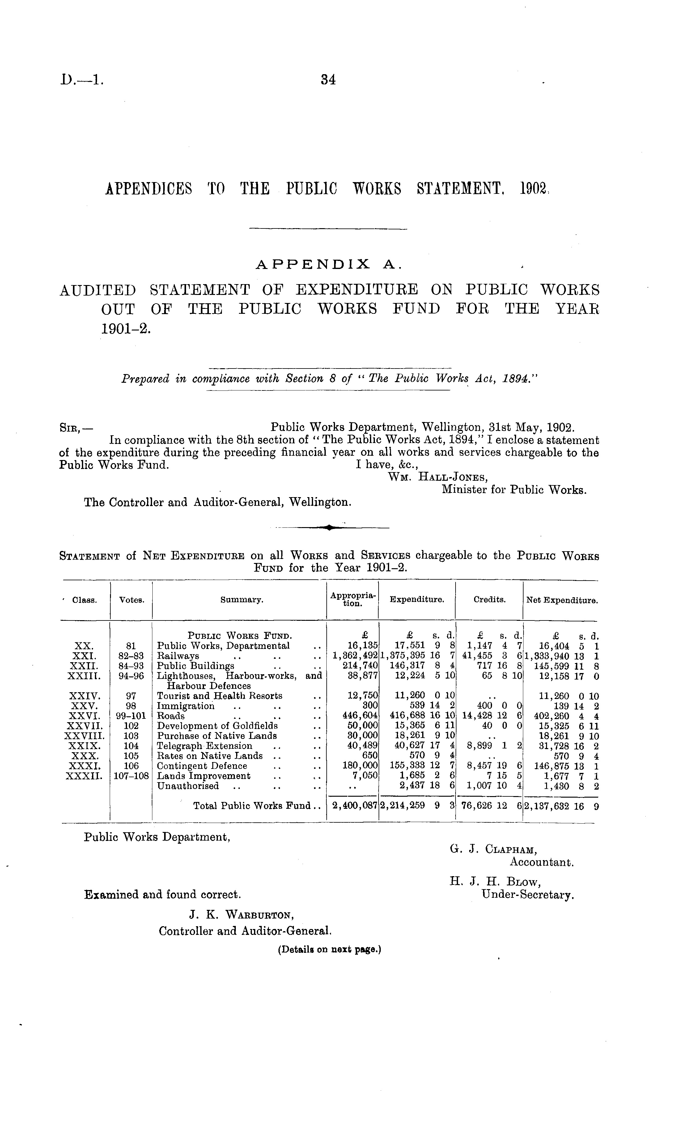 Sic, — Public Works Department, Wellington, 31st May, 1902. In compliance with the Bth section of " The Public Works Act, 1894," I enclose a statement of the expenditure during the preceding financial year on all works and services chargeable to the Public Works Fund. I have, &c, Wm. Hall-Jones, Minister for Public Works. The Controller and Auditor-General, Wellington. *__