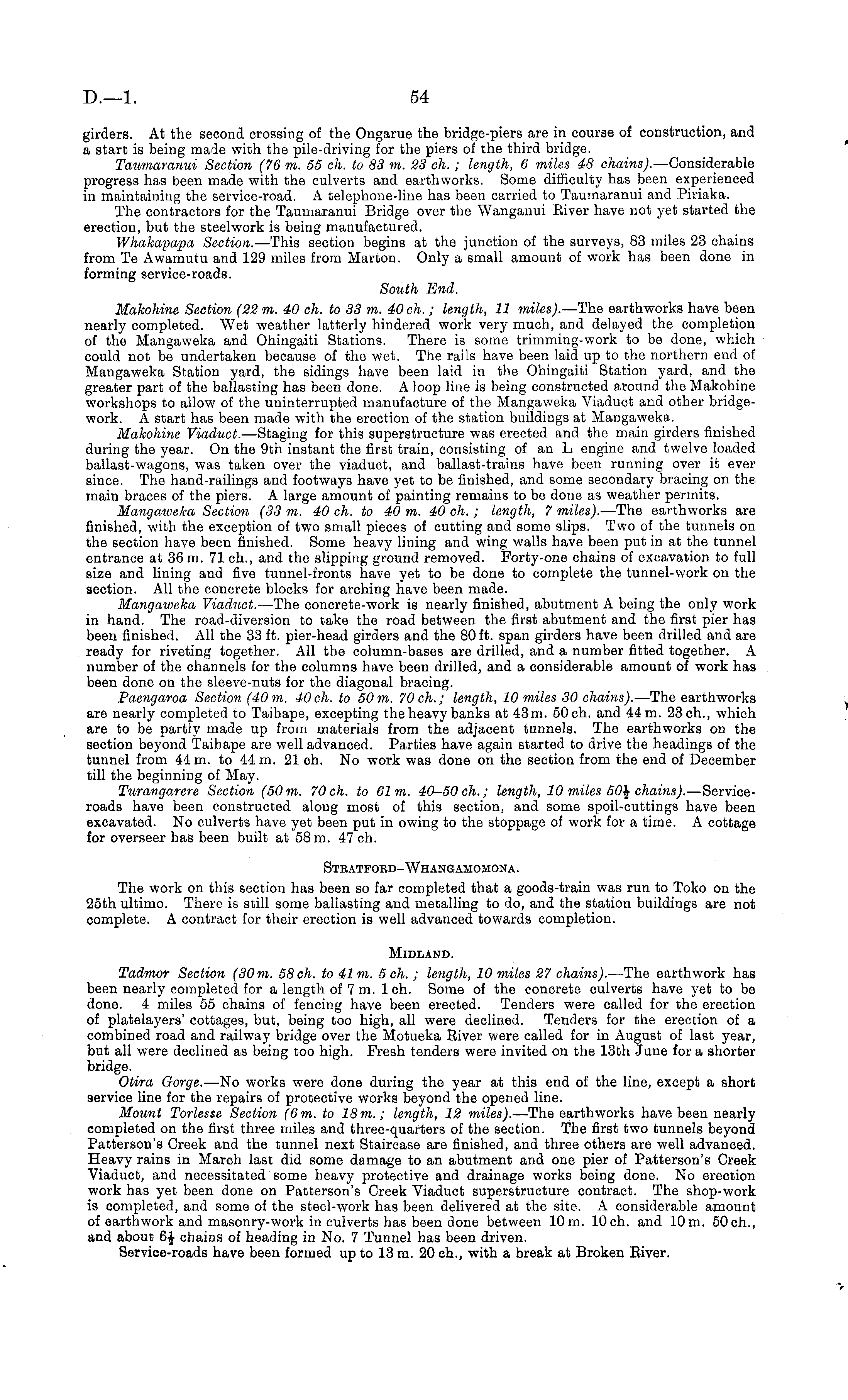 girders. At the second crossing of the Ongarue the bridge-piers are in course of construction, and a stare is being made with the pile-driving for the piers of the third bridge. Taumaranui Section (76 m. 55 eh. to 83 m. 23 eh.; length, 6 miles 48 chains). —Considerable progress has been made with the culverts and earthworks. Some difficulty has been experienced in maintaining the service-road. A telephone-line has been carried to Taumaranui and Piriaka. The contractors for the Taumaranui Bridge over the Wanganui Biver have not yet started the erection, but the steelwork is being manufactured. Whakapapa Section. —This section begins at the junction of the surveys, 83 miles 23 chains from Te Awamutu and 129 miles from Marton. Only a small amount of work has been done in forming service-roads. South End. Makohine Section (22 m. 40 eh. to 33 m. 40 eh.; length, 11 miles). —The earthworks have been nearly completed. Wet weather latterly hindered work very much, and delayed the completion of the Mangaweka and Ohingaiti Stations. There is some trimming-work to be done, which could not be undertaken because of the wet. The rails have been laid up to the northern end of Mangaweka Station yard, the sidings have been laid in the Ohingaiti Station yard, and the greater part of the ballasting has been done. A loop line is being constructed around the Makohine workshops to allow of the uninterrupted manufacture of the Mangaweka Viaduct and other bridgework. A start has been made with the erection of the station buildings at Mangaweka. Makohine Viaduct. —Staging for this superstructure was erected and the main girders finished during the year. On the 9th instant the first train, consisting of an L engine and twelve loaded ballast-wagons, was taken over the viaduct, and ballast-trains have been running over it ever since. The hand-railings and footways have yet to be finished, and some secondary bracing on the main braces of the piers. A large amount of painting remains to be done as weather permits. Mangaweka Section (33 m. 40 eh. to 40 m. 40 eh. ; length, 7 miles). —The earthworks are finished, with the exception of two small pieces of cutting and some slips. Two of the tunnels on the section have been finished. Some heavy lining and wing walls have been put in at the tunnel entrance at 36m. 71 eh., and the slipping ground removed. Forty-one chains of excavation to full size and lining and five tunnel-fronts have yet to be done to complete the tunnel-work on the section. All the concrete blocks for arching have been made. Mangaweka Viaduct. —The concrete-work is nearly finished, abutment A being the only work in hand. The road-diversion to take the road between the first abutment and the first pier has been finished. All the 33 ft. pier-head girders and the 80 ft. span girders have been drilled and are ready for riveting together. All the column-bases are drilled, and a number fitted together. A number of the channels for the columns have been drilled, and a considerable amount of work has been done on the sleeve-nuts for the diagonal bracing. Paengaroa Section (40m. 40ch. to 50m. 70ch.; length, 10 miles 30 chains). —The earthworks are nearly completed to Taihape, excepting the heavy banks at 43m. 50 eh. and 44 m. 23 eh., which are to be partly made up from materials from the adjacent tunnels. The earthworks on the section beyond Taihape are well advanced. Parties have again started to drive the headings of the tunnel from 44 m. to 44 m. 21 eh. No work was done on the section from the end of December till the beginning of May. Turangarere Section (50 m. 70 eh. to 61m. 40-50 eh.; length, 10 miles 50\ chains). —Serviceroads have been constructed along most of this section, and some spoil-cuttings have been excavated. No culverts have yet been put in owing to the stoppage of work for a time. A cottage for overseer has been built at 58 m. 47 eh. Stratford- Whangamomona . The work on this section has been so far completed that a goods-train was run to Toko on the 25th ultimo. There is still some ballasting and metalling to do, and the station buildings are not complete. A contract for their erection is well advanced towards completion. Midland. Tadmor Section (30 m. 58 eh. to 41m. 5 eh.; length, 10 miles 27 chains). —The earthwork has been nearly completed for a length of 7m. lch. Some of the concrete culverts have yet to be done. 4 miles 55 chains of fencing have been erected. Tenders were called for the erection of platelayers' cottages, but, being too high, all were declined. Tenders for the erection of a combined road and railway bridge over the Motueka Biver were called for in August of last year, but all were declined as being too high. Fresh tenders were invited on the 13th June for a shorter bridge. Otira Gorge. —No works were done during the year at this end of the line, except a short service line for the repairs of protective works beyond the opened line. Mount Torlesse Section (6m. to 18m.; length, 12 miles). —The earthworks have been nearly completed on the first three miles and three-quarters of the section. The first two tunnels beyond Patterson's Creek and the tunnel next Staircase are finished, and three others are well advanced. Heavy rains in March last did some damage to an abutment and one pier of Patterson's Creek Viaduct, and necessitated some heavy protective and drainage works being done. No erection work has yet been done on Patterson's Creek Viaduct superstructure contract. The shop-work is completed, and some of the steel-work has been delivered at the site. A considerable amount of earthwork and masonry-work in culverts has been done between 10m. lOch. and 10m. 50ch., and about 6£ chains of heading in No. 7 Tunnel has been driven. Service-roads have been formed up to 13 m. 20 eh., with a break at Broken Biver.