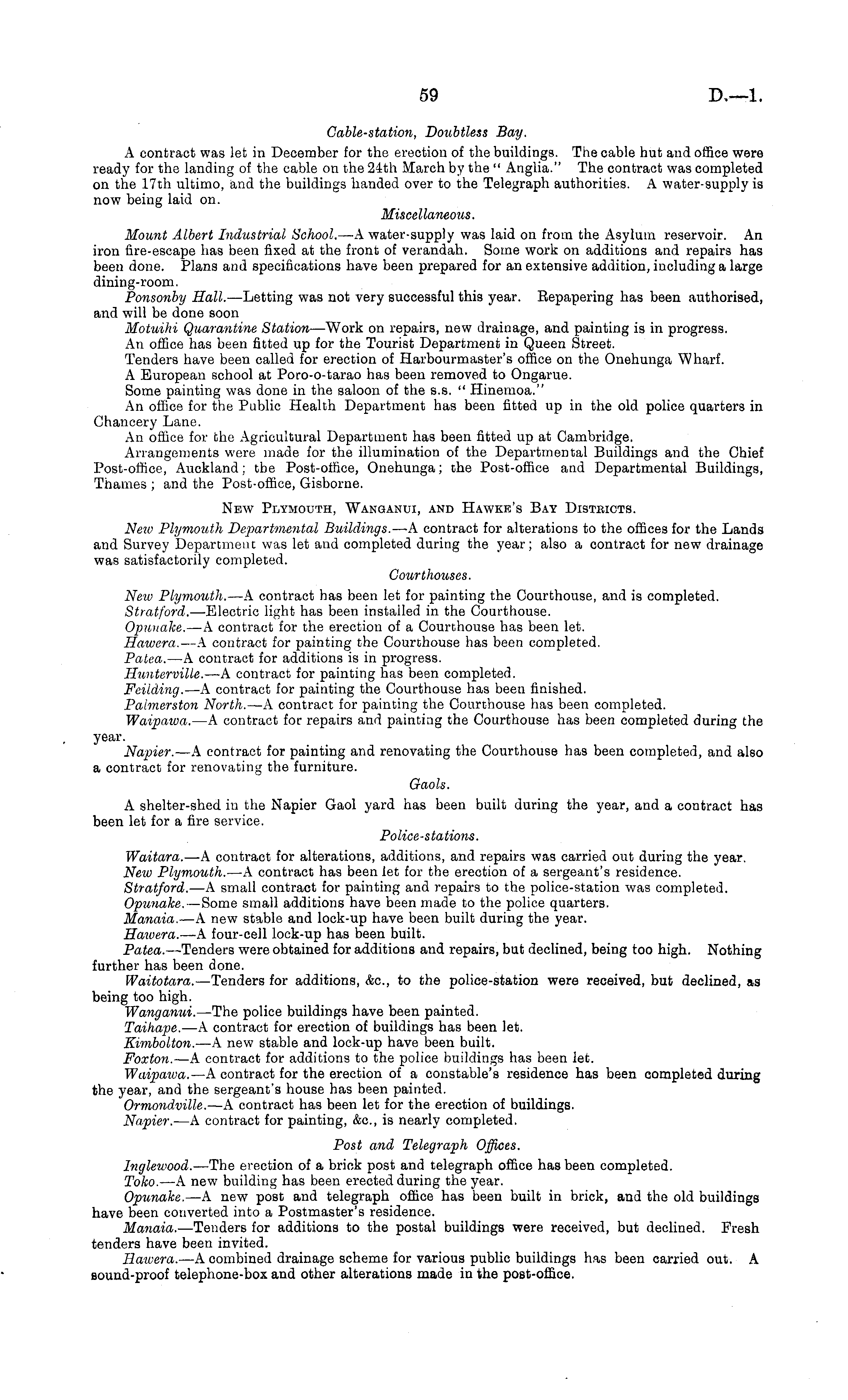 Cable-station, Doubtless Bay. A contract was let in December for the erection of the buildings. The cable hut and office were ready for the landing of the cable on the 24th March by the " Anglia." The contract was completed on the 17th ultimo, and the buildings handed over to the Telegraph authorities. A water-supply is now being laid on. Miscellaneous. Mount Albert Industrial School. —A water-supply was laid on from the Asylum reservoir. An iron fire-escape has been fixed at the front of verandah. Some work on additions and repairs has been done. Plans and specifications have been prepared for an extensive addition, including a large dining-room. Ponsonby Hall. —Letting was not very successful this year. Bepapering has been authorised, and will be done soon Motuihi Quarantine Station —Work on repairs, new drainage, and painting is in progress. An office has been fitted up for the Tourist Department in Queen Street. Tenders have been called for erection of Harbourmaster's office on the Onehunga Wharf. A European school at Poro-o-tarao has been removed to Ongarue. Some painting was done in the saloon of the s.s. " Hinemoa." An office for the Public Health Department has been fitted up in the old police quarters in Chancery Lane. An office for the Agricultural Department has been fitted up at Cambridge. Arrangements were made for the illumination of the Departmental Buildings and the Chief Post-office, Auckland: the Post-office, Onehunga; the Post-office and Departmental Buildings, Thames ; and the Post-office, Gisborne. New Plymouth, Wanganui, and Hawke's Bay Districts. New Plymouth Departmental Buildings. —A contract for alterations to the offices for the Lands and Survey Department was let and completed during the year; also a contract for new drainage was satisfactorily completed. Courthouses. Nciv Plymouth. —A contract has been let for painting the Courthouse, and is completed. Stratford. —Electric light has been installed in the Courthouse. Opunake. —A contract for the erection of a Courthouse has been let. Hawera. —A contract for painting the Courthouse has been completed. Patea. —A contract for additions is in progress. Huuterville. —A contract for painting has been completed. Feilding. —A contract for painting the Courthouse has been finished. Palmerston North. —A contract for painting the Courthouse has been completed. Waipawa. —A contract for repairs and painting the Courthouse has been completed during the year. Napier. —A contract for painting and renovating the Courthouse has been completed, and also a contract for renovating the furniture. Gaols. A shelter-shed in the Napier Gaol yard has been built during the year, and a contract has been let for a fire service. Police-stations. Waitara. —A contract for alterations, additions, and repairs was carried out during the year. Neio Plymouth. —A contract has been let for the erection of a sergeant's residence. Stratford. —A small contract for painting and repairs to the police-station was completed. Opimake. —Some small additions have been made to the police quarters. Manaia. —A new stable and lock-up have been built during the year. Hawera. —A four-cell lock-up has been built. Patea. —Tenders were obtained for additions and repairs, but declined, being too high. Nothing further has been done. Waitotara.— Tenders for additions, &c, to the police-station were received, but declined, as being too high. Wanganui. —The police buildings have been painted. Taihape. —A contract for erection of buildings has been let. Kimbolton. —A new stable and lock-up have been built. Foxton. —A contract for additions to the police buildings has been let. Waipawa. —A contract for the erection of a constable's residence has been completed during the year, and the sergeant's house has been painted. Ormondville. —A contract has been let for the erection of buildings. Napier. —A contract for painting, &c, is nearly completed. Post and Telegraph Offices. Inglewood. —The erection of a brick post and telegraph office has been completed. Toko. —A new building has been erected during the year. Opimake. —A new post and telegraph office has been built in brick, and the old buildings have been converted into a Postmaster's residence. Manaia. —Tenders for additions to the postal buildings were received, but declined. Fresh tenders have been invited. Hawera. —A combined drainage scheme for various public buildings has been carried out. A sound-proof telephone-box and other alterations made in the post-office.